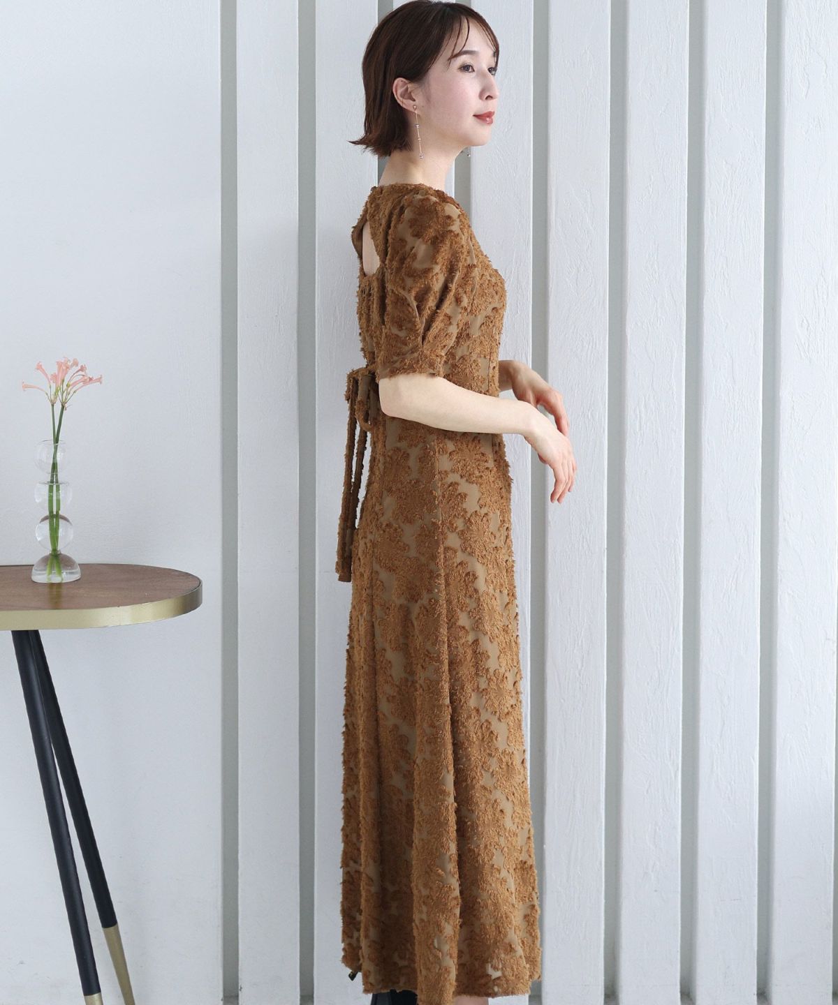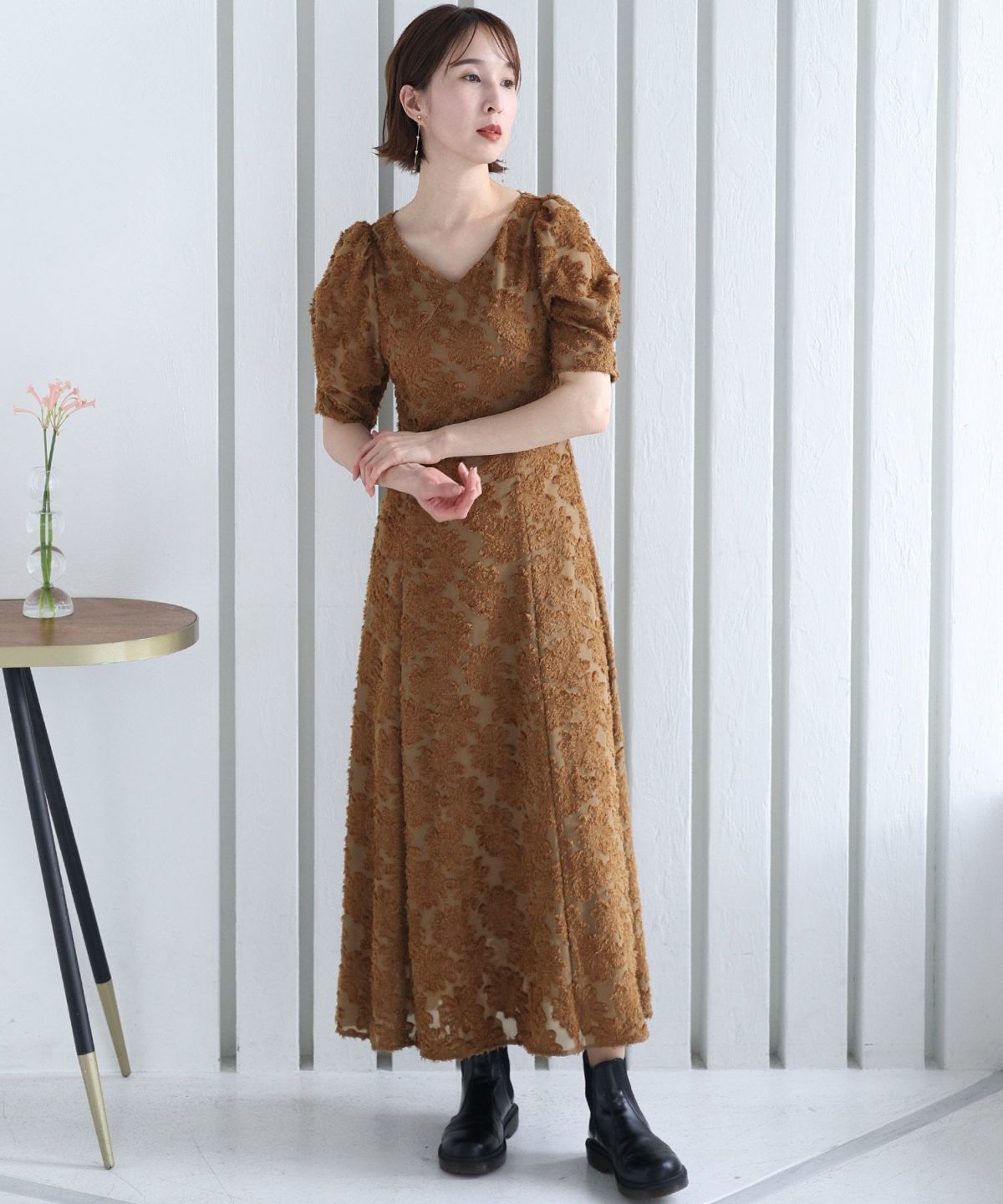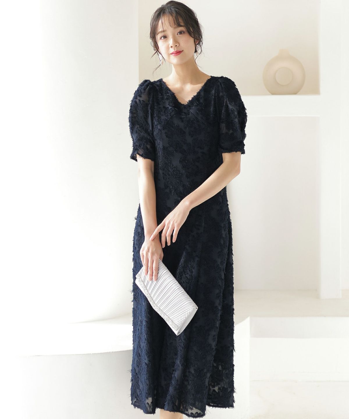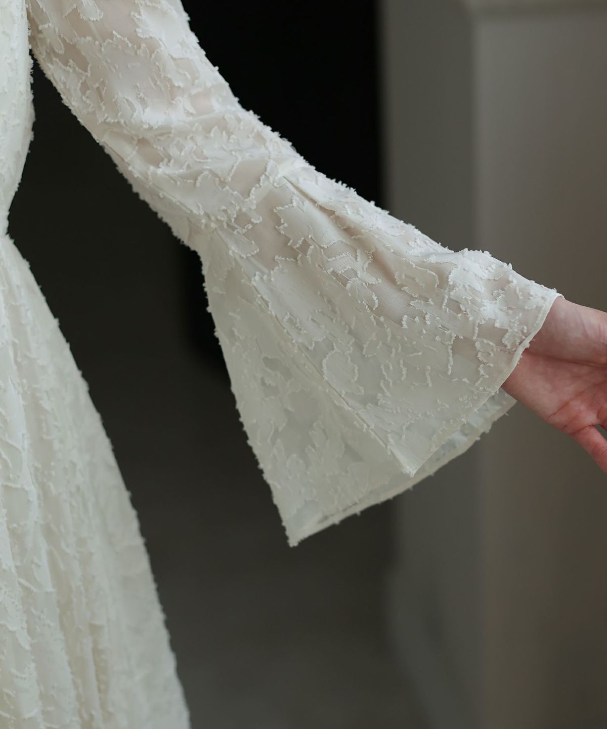 ぷっくり膨らみのあるジャガード生地が高級感漂う オーガンジー×膨れジャガードワンピース