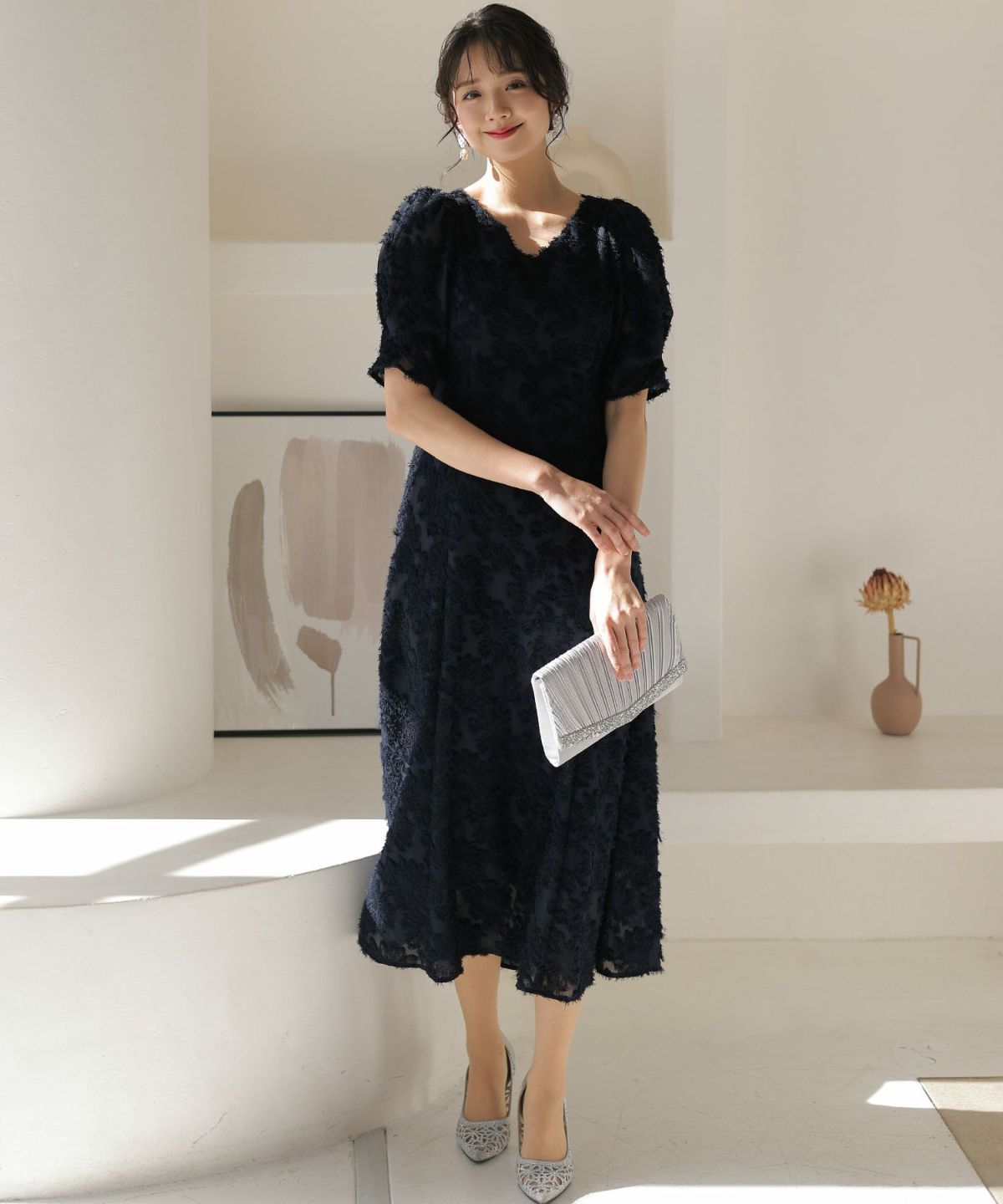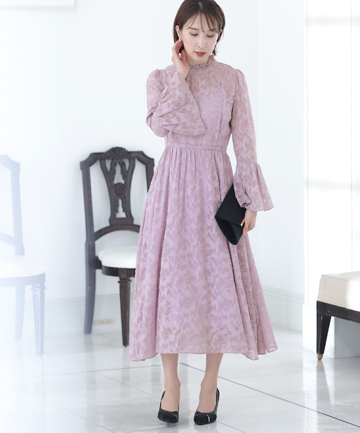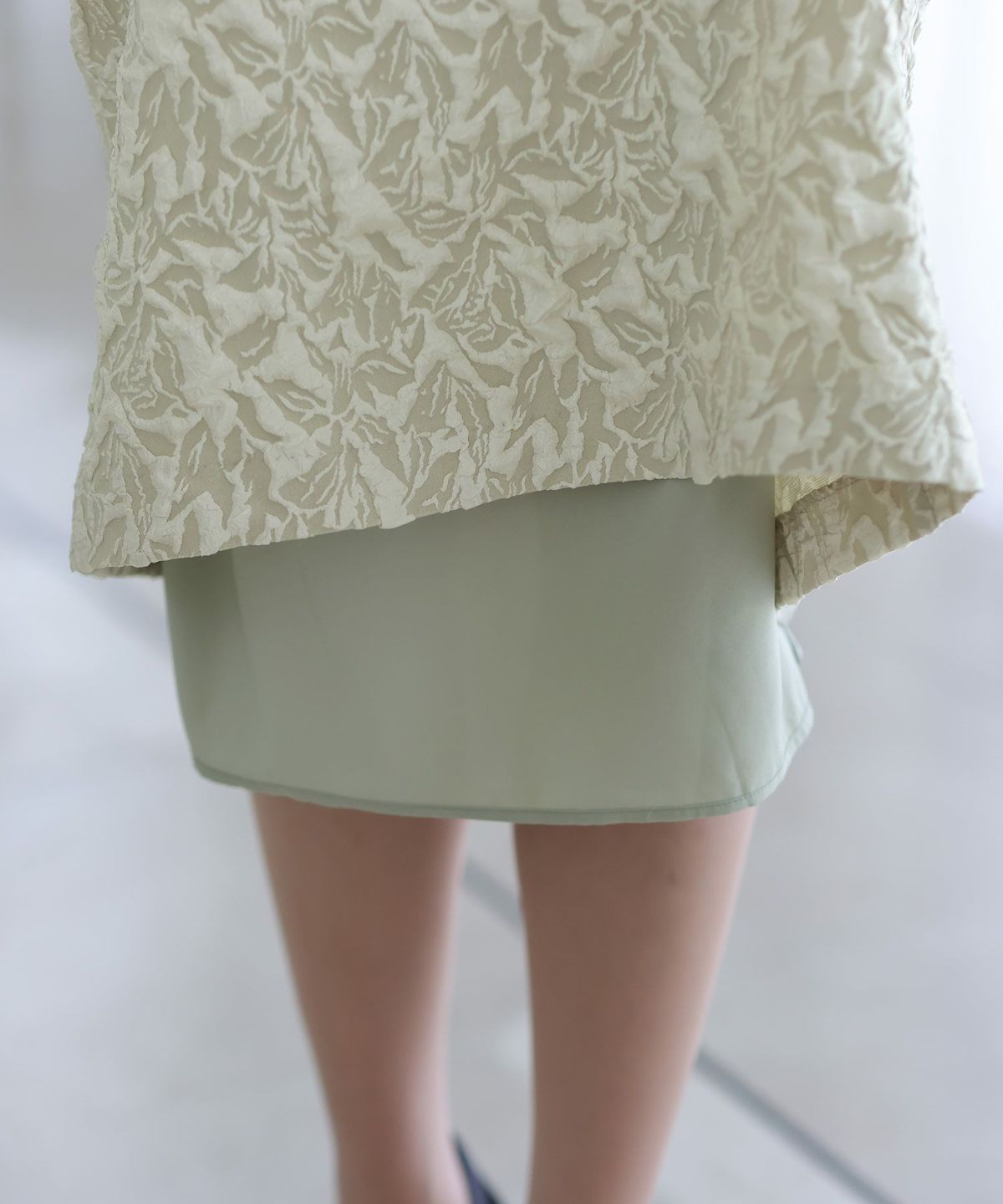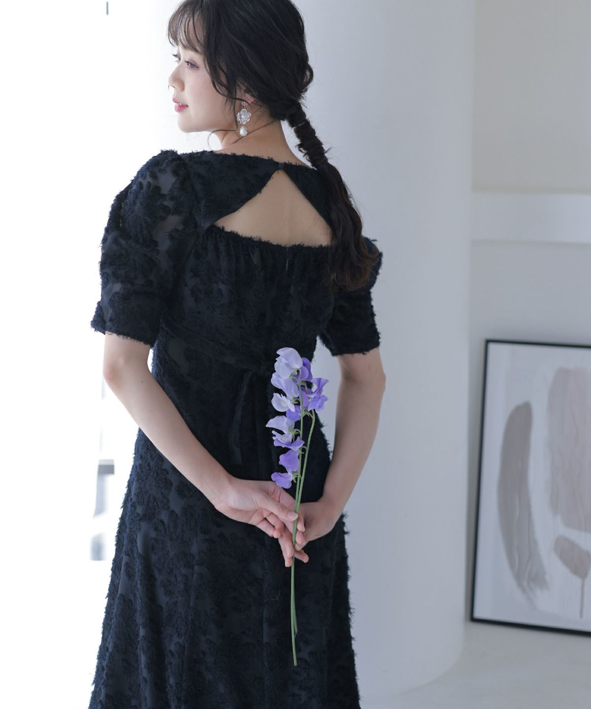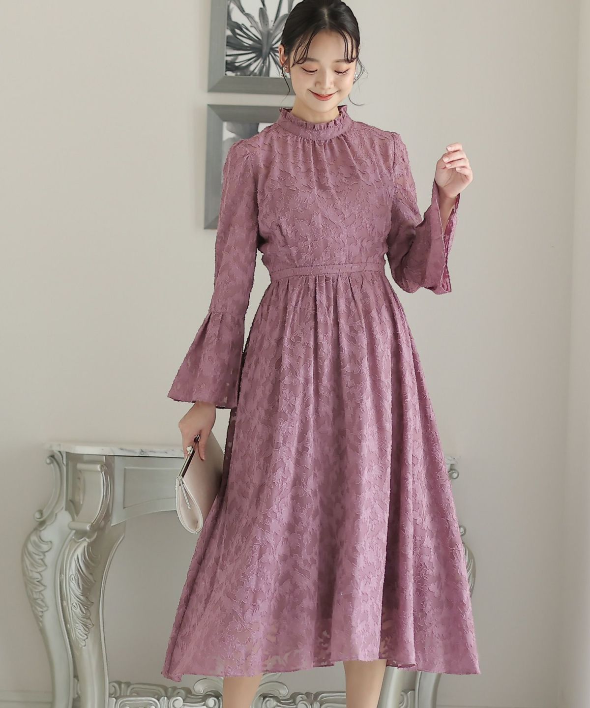 ぷっくり膨らみのあるジャガード生地が高級感漂う オーガンジー×膨れジャガードワンピース
