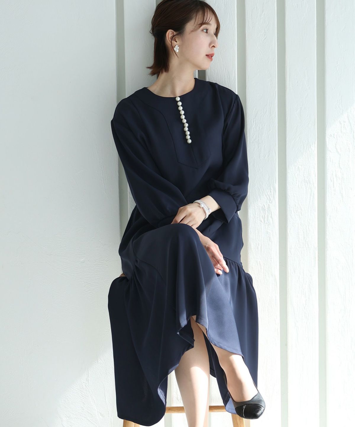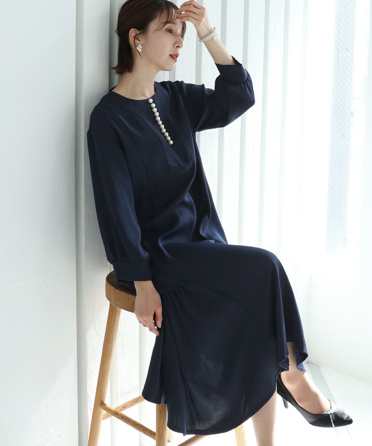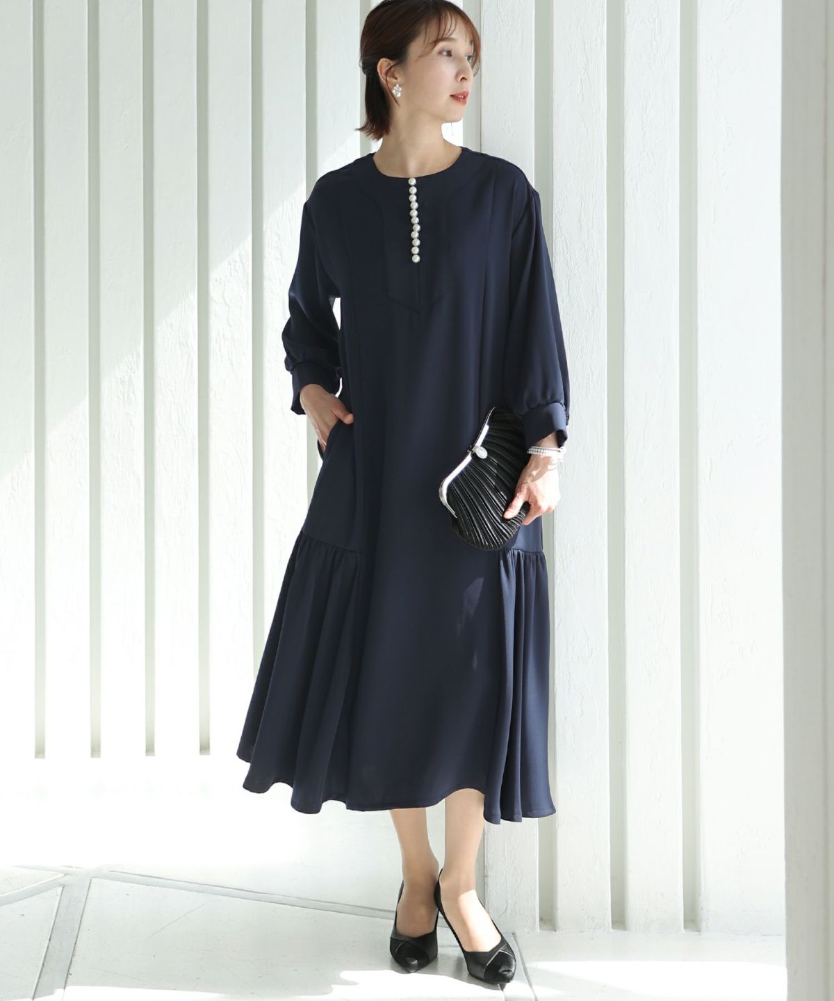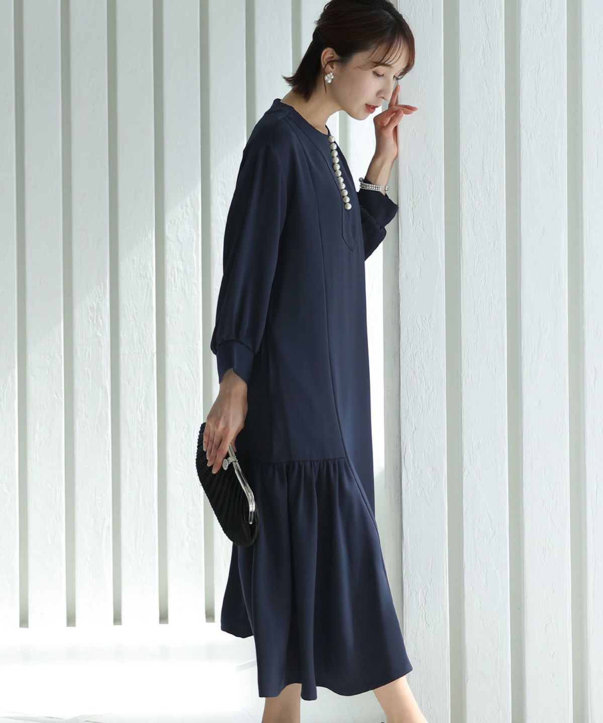 フィッシュテールデザインのスカートが美しい パール付きキーネックワンピース