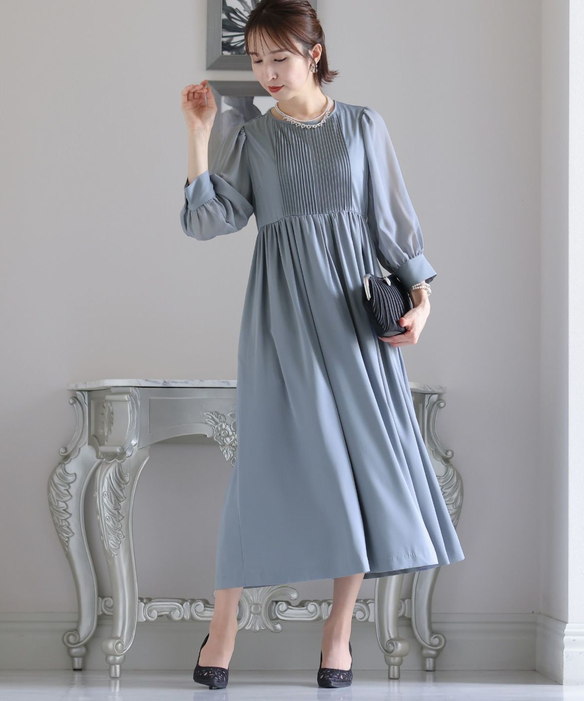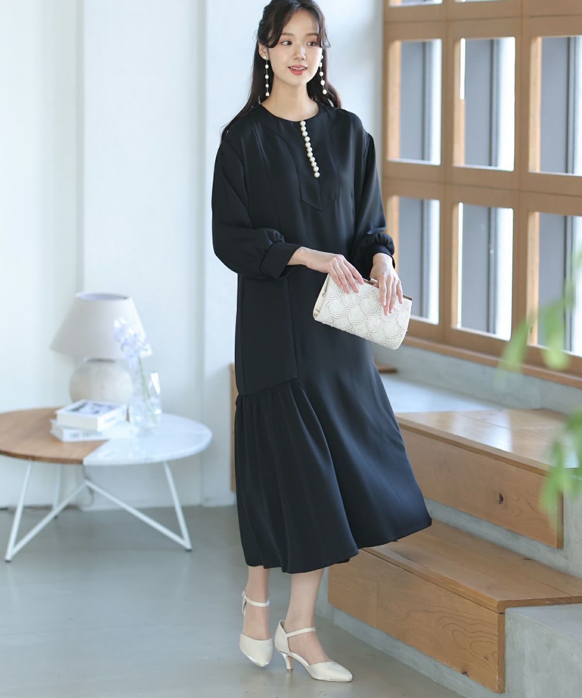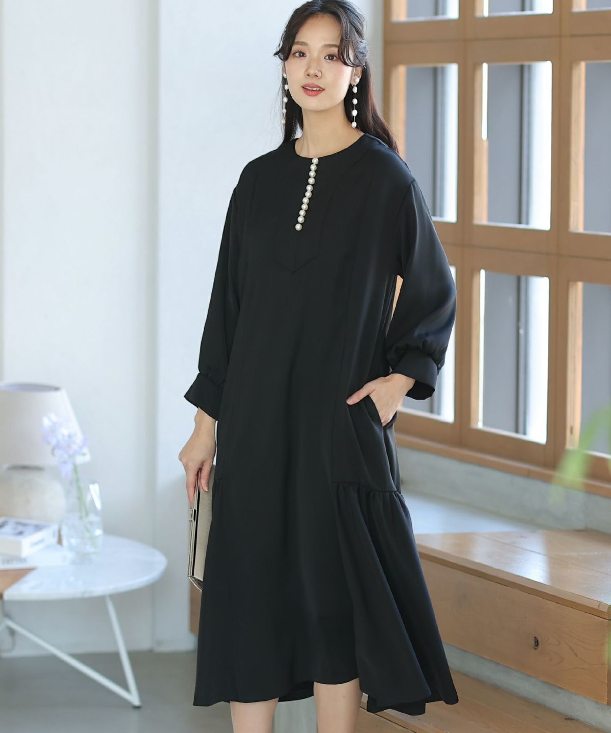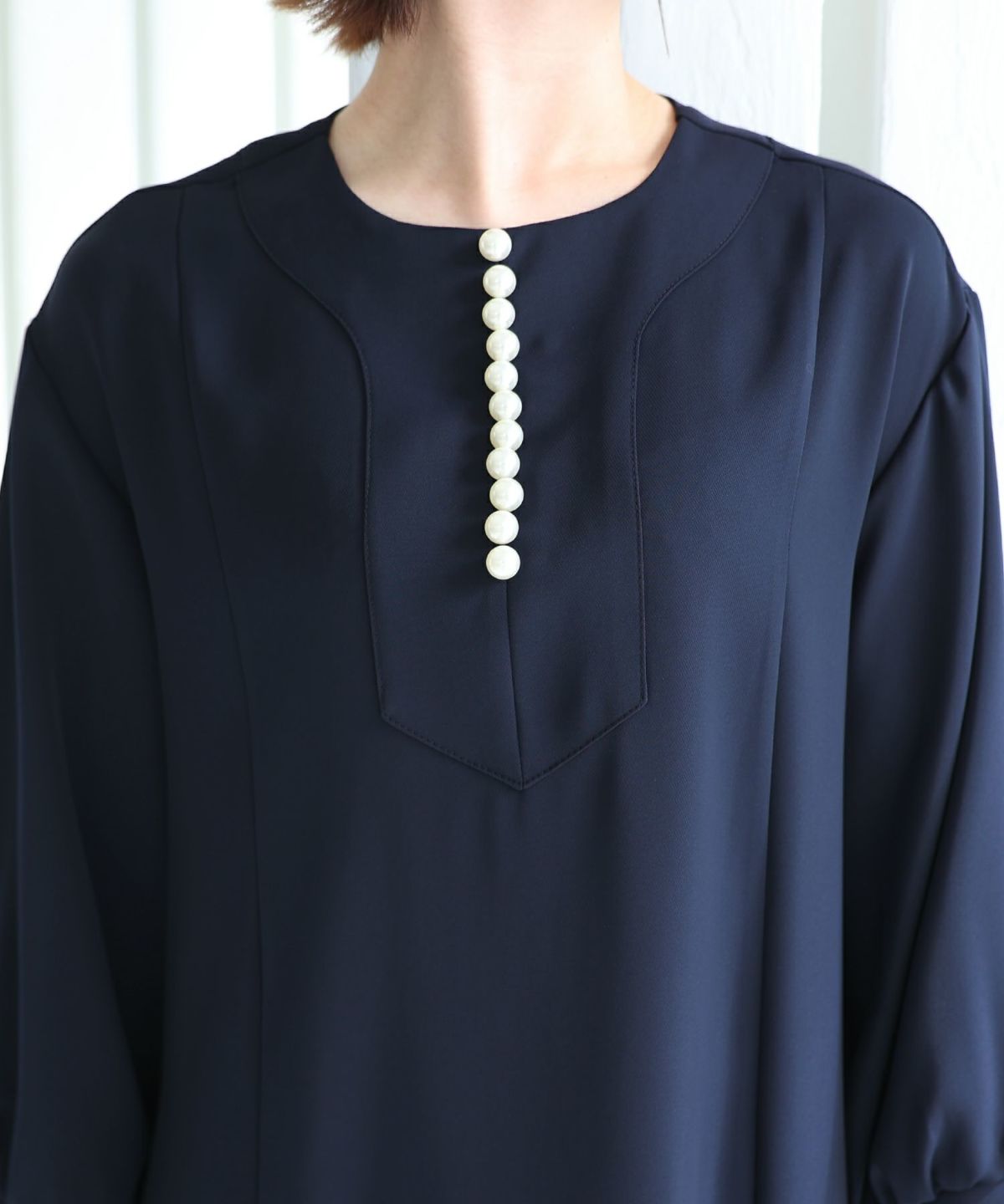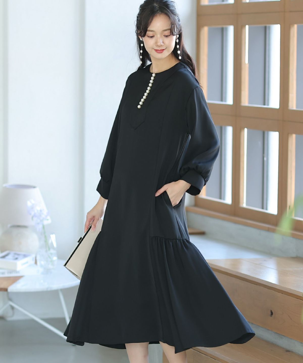 フィッシュテールデザインのスカートが美しい パール付きキーネックワンピース