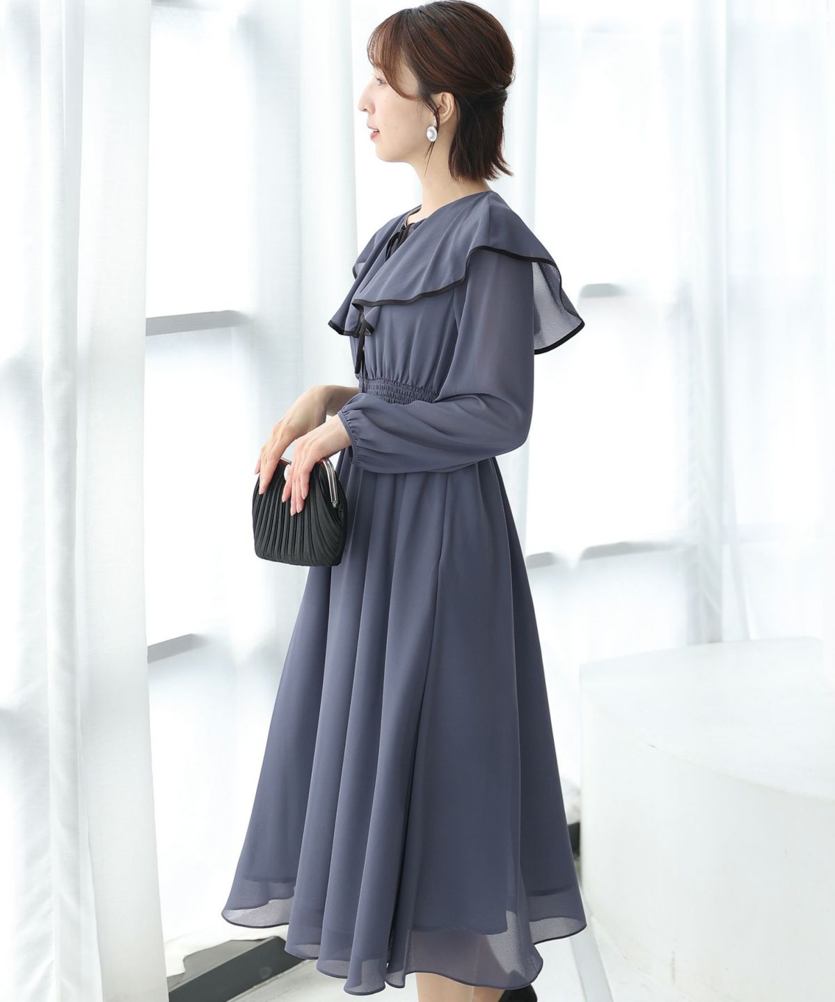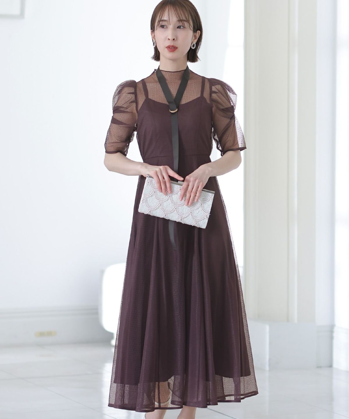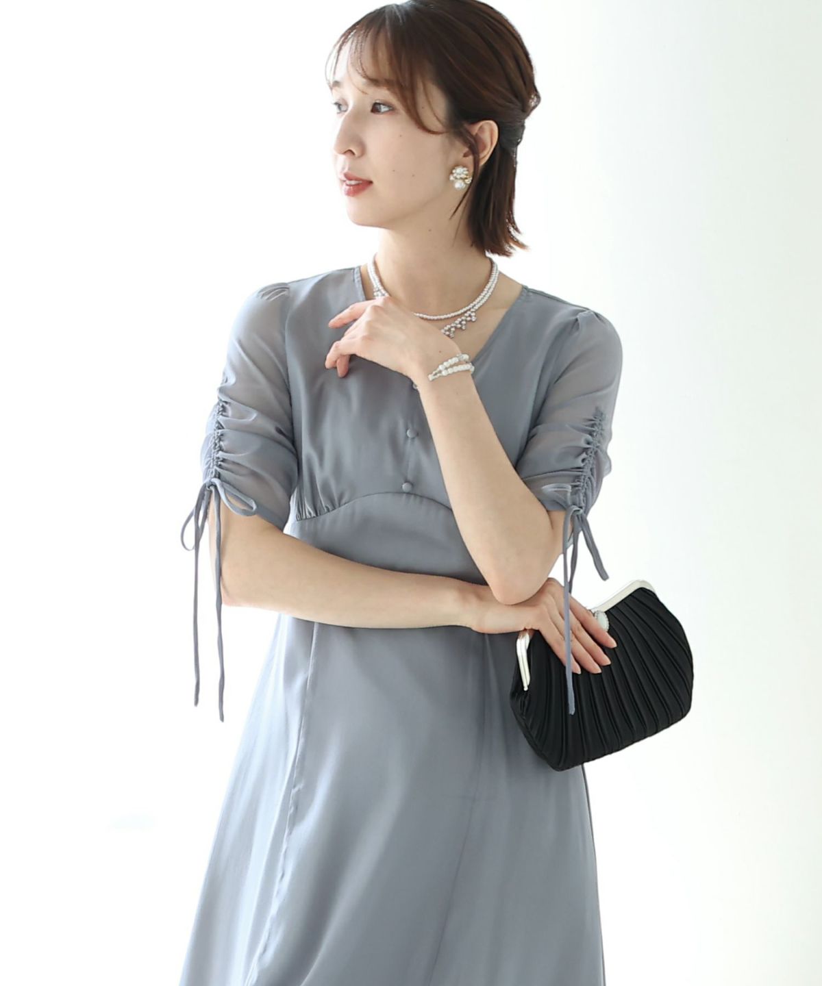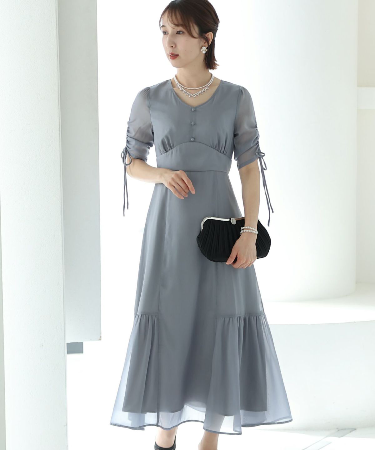 フィッシュテールデザインのスカートが美しい パール付きキーネックワンピース