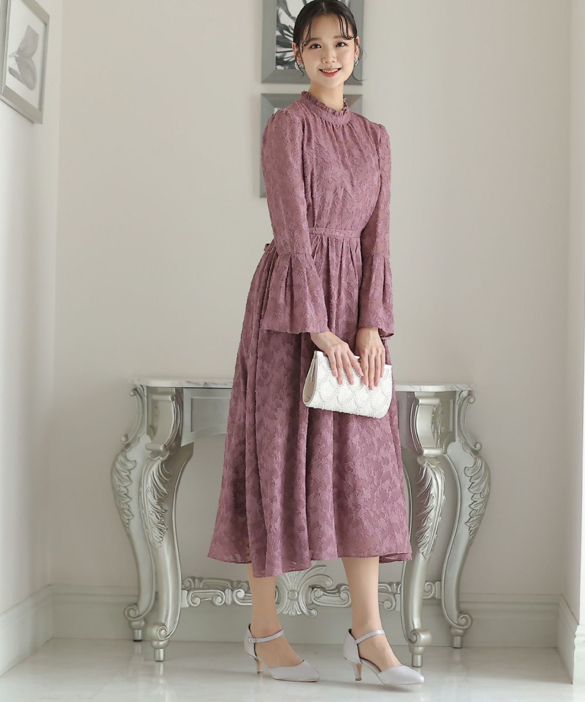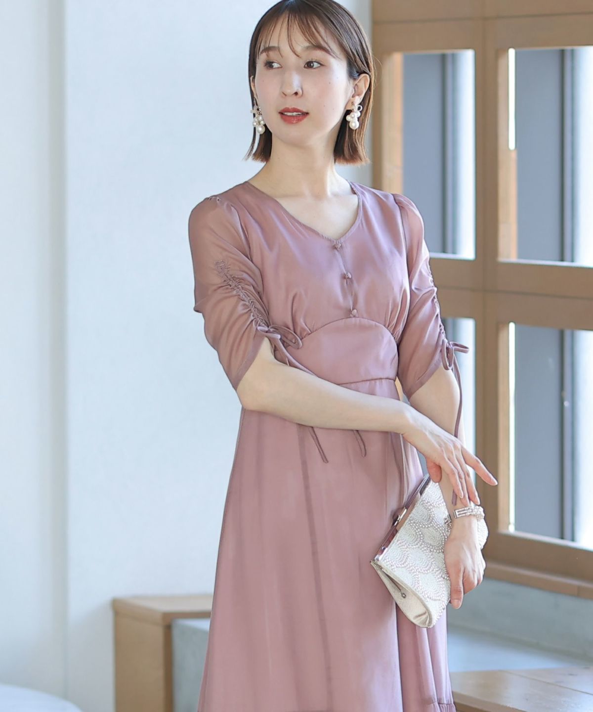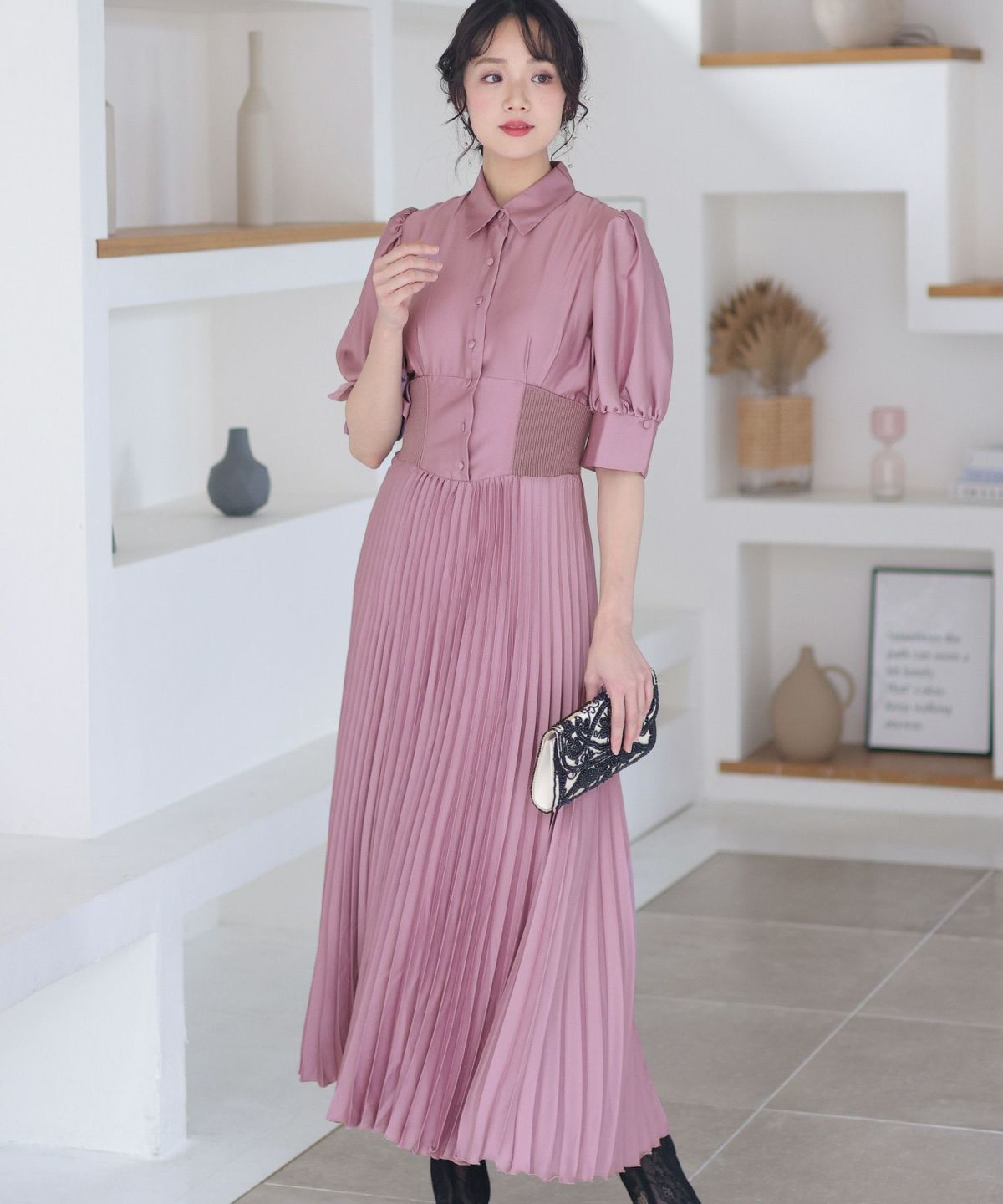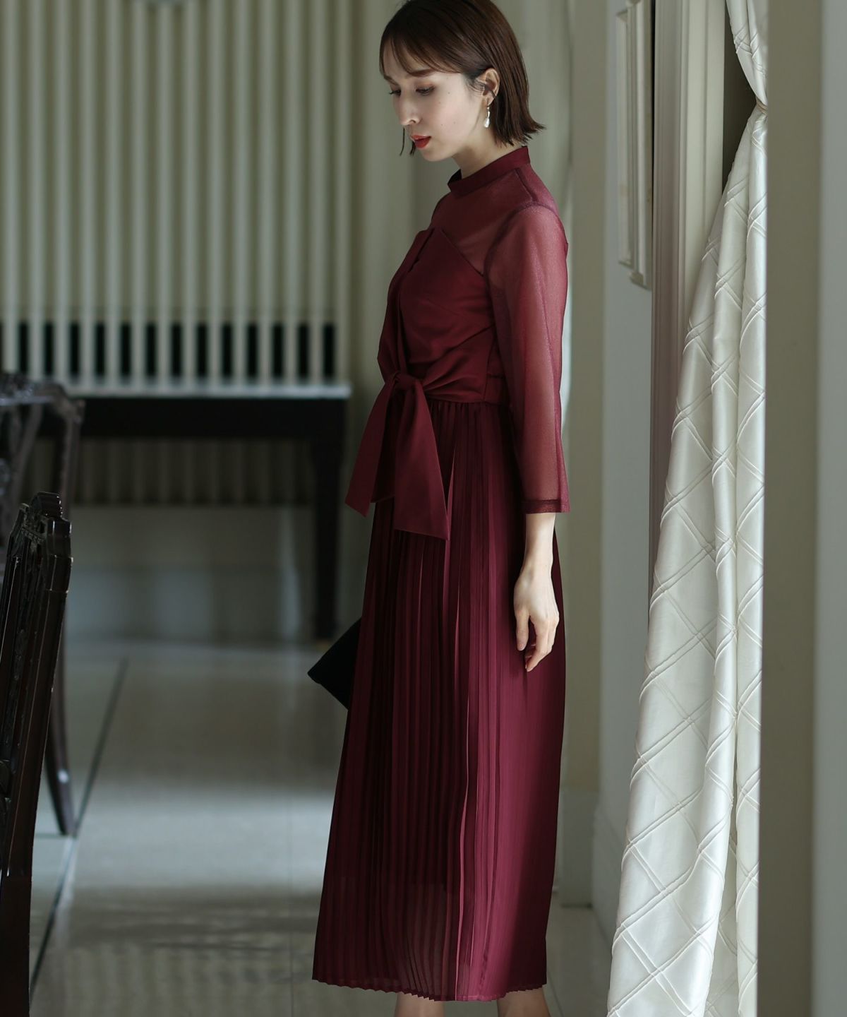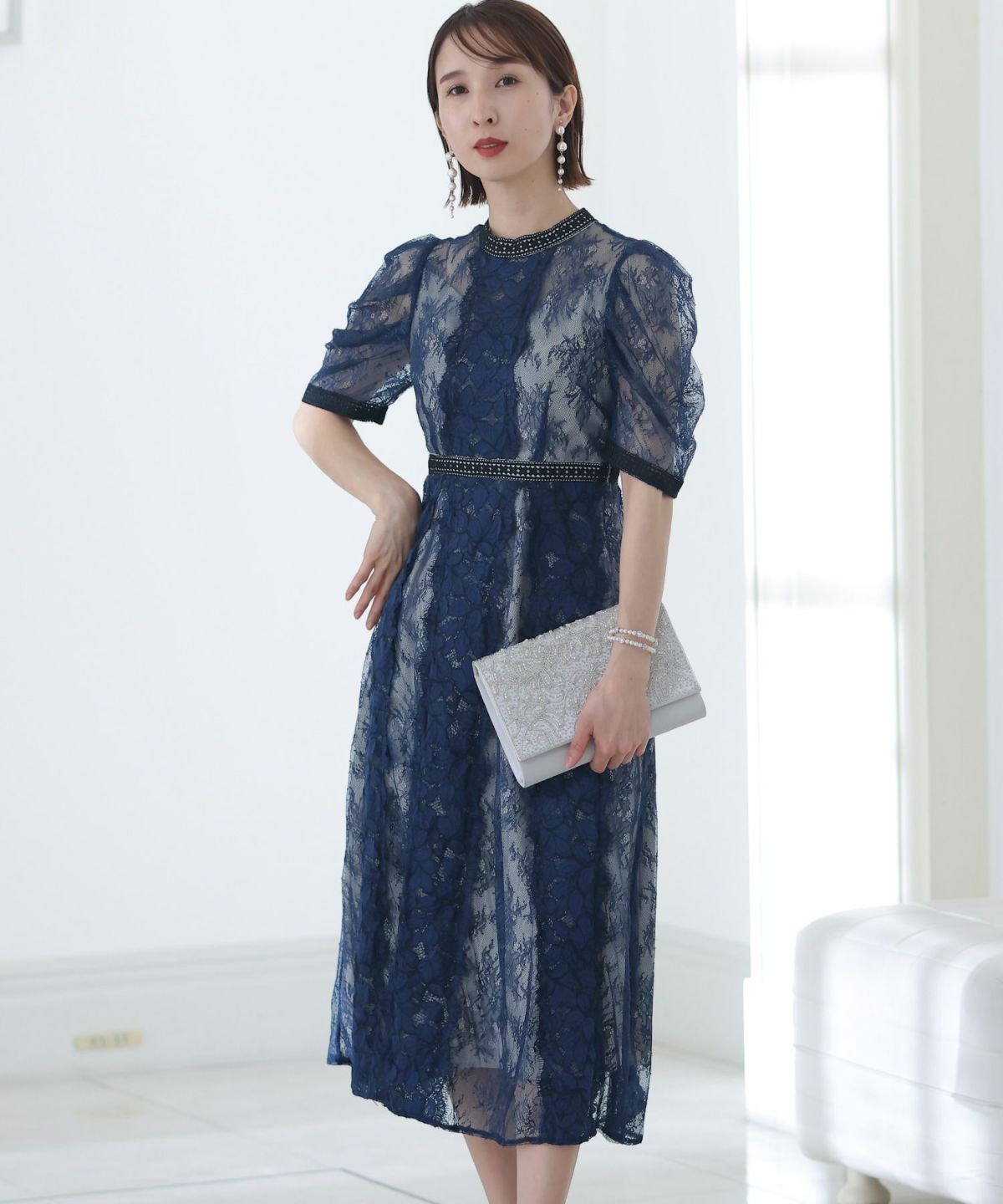 フィッシュテールデザインのスカートが美しい パール付きキーネックワンピース