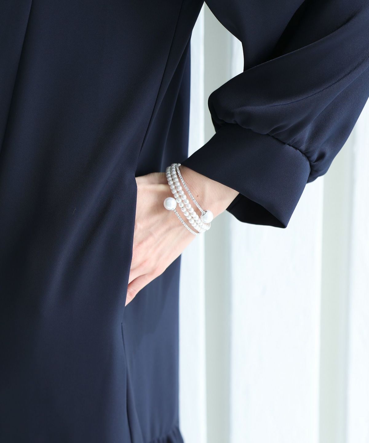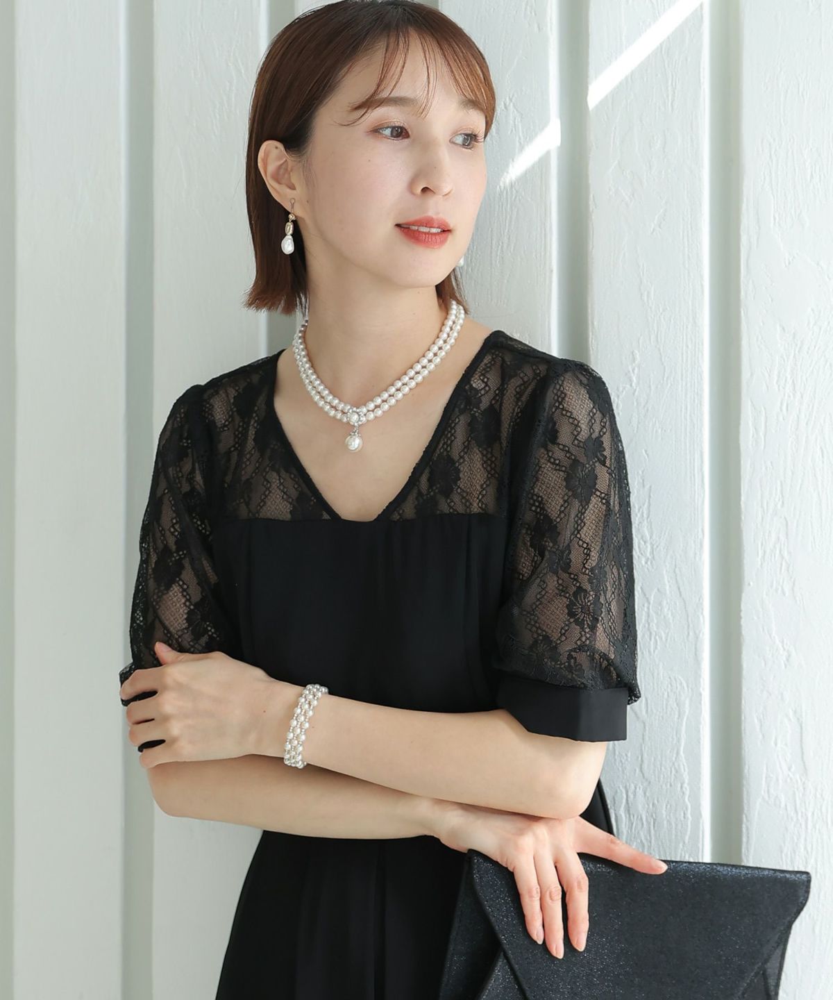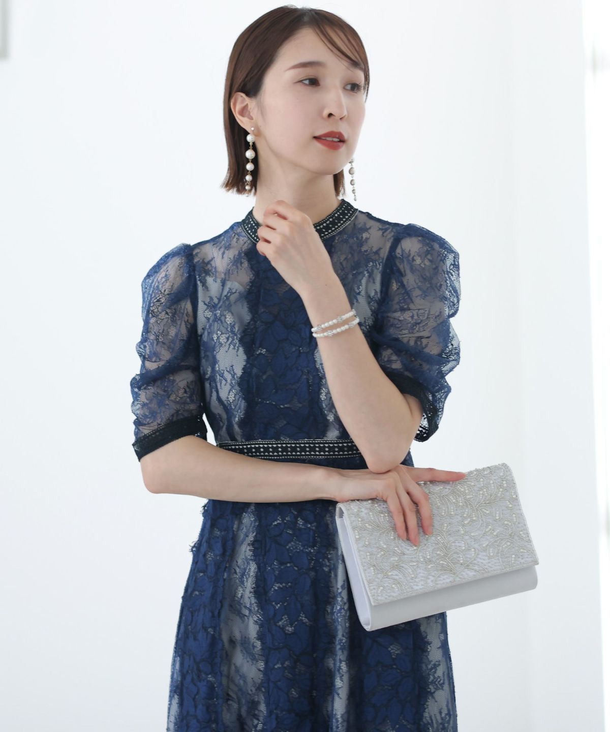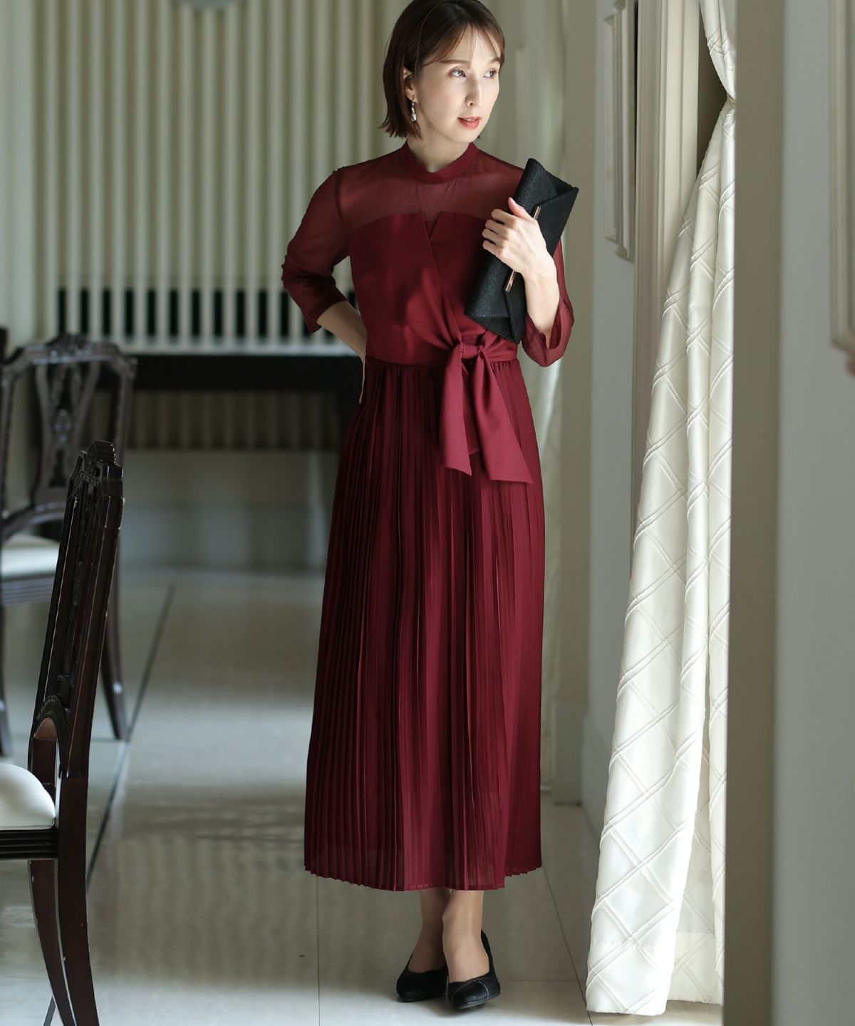 フィッシュテールデザインのスカートが美しい パール付きキーネックワンピース