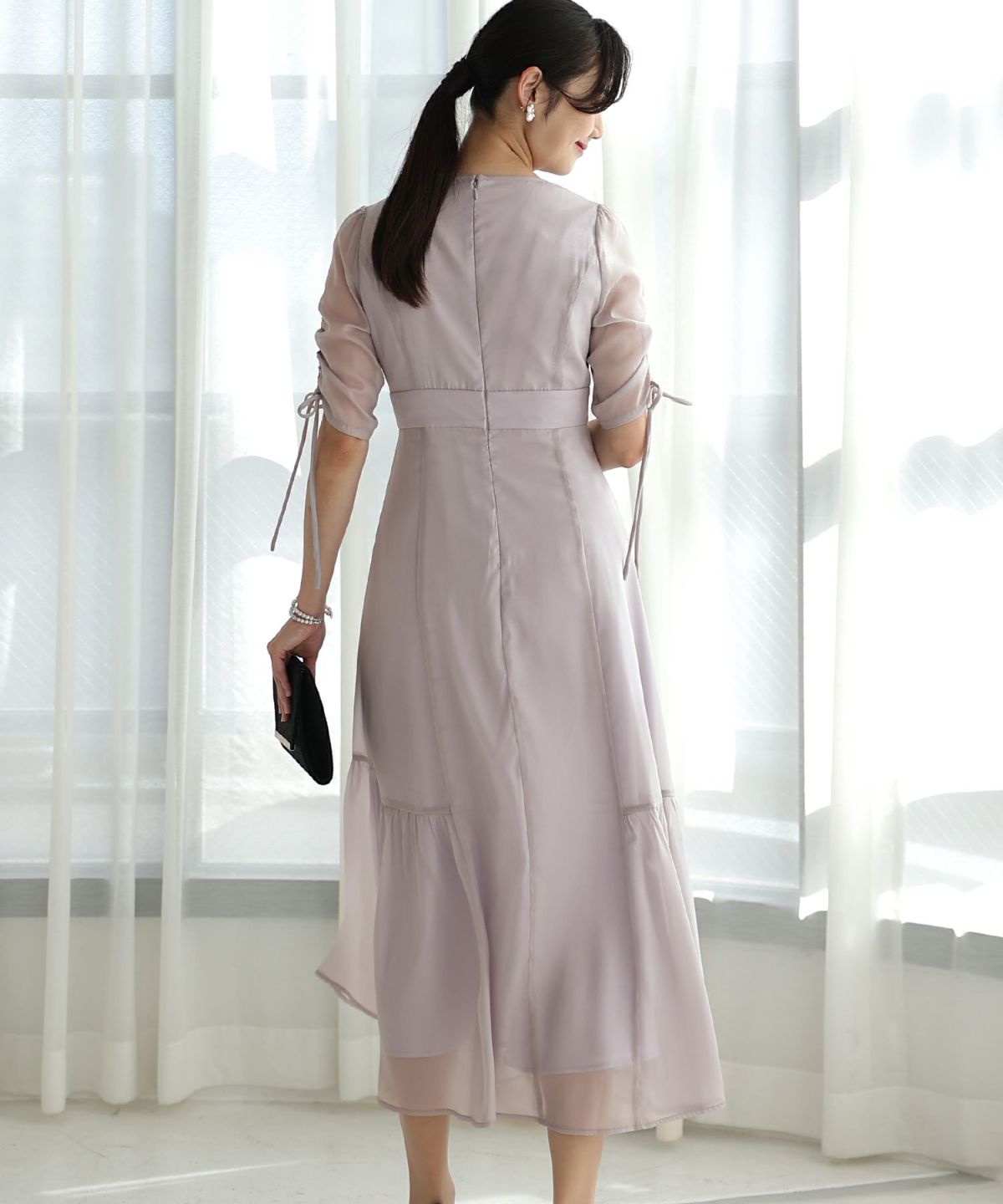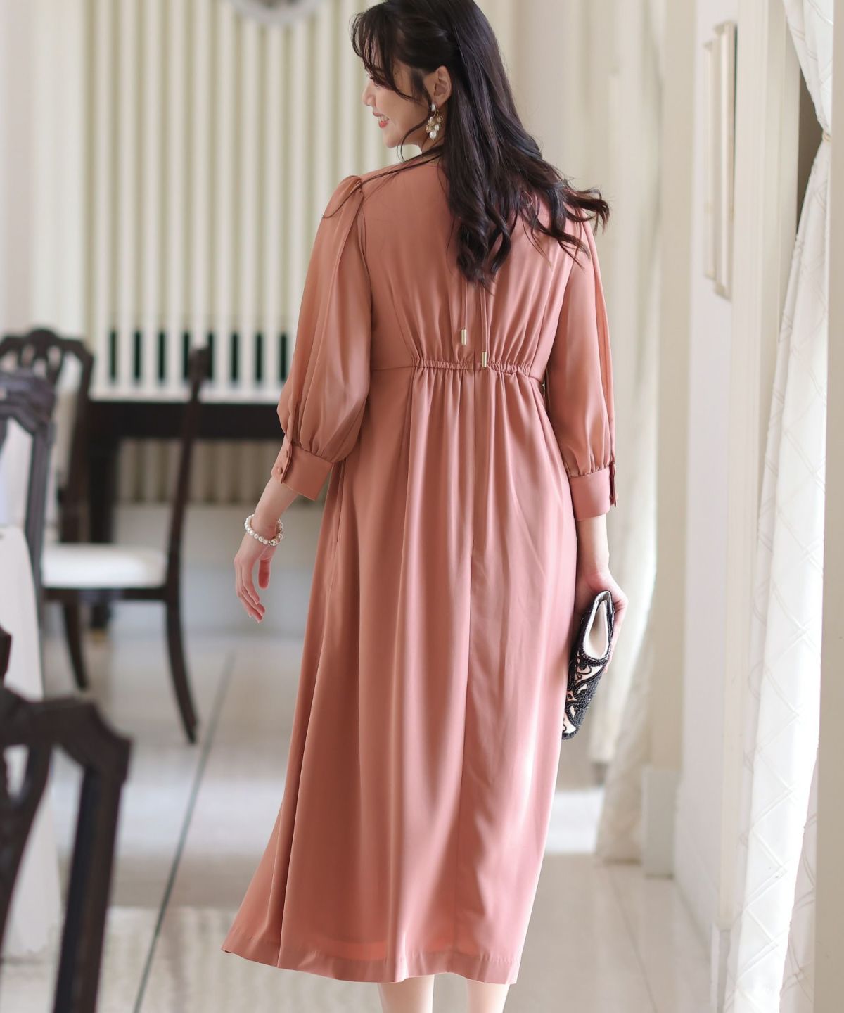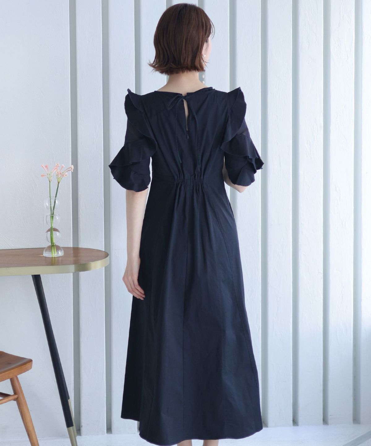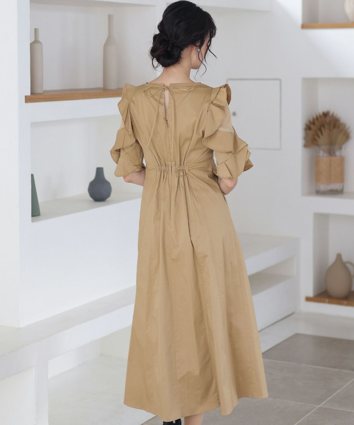 スピンドルだからバックショットも綺麗♪ ベルスリーブワンティアードワンピース