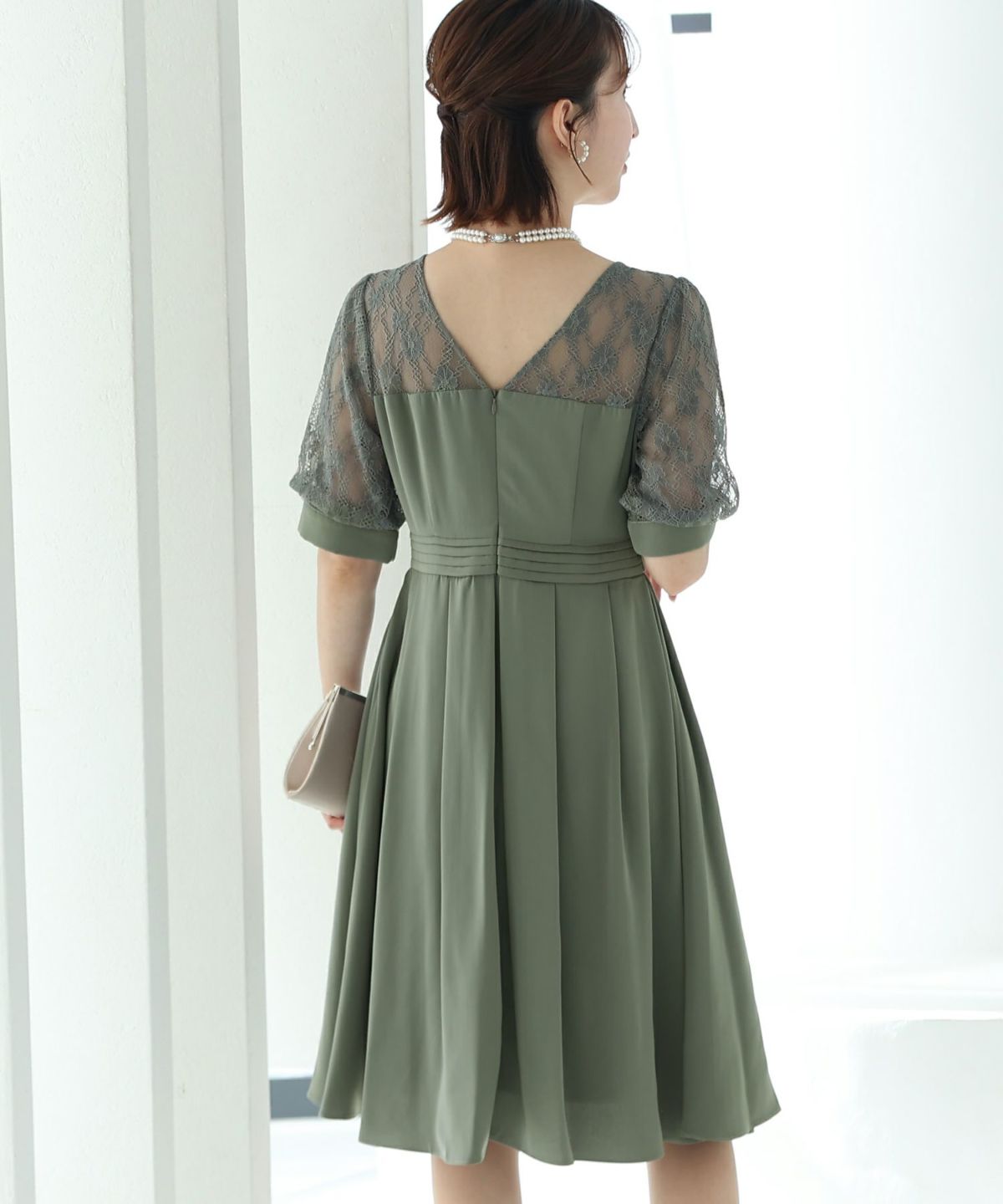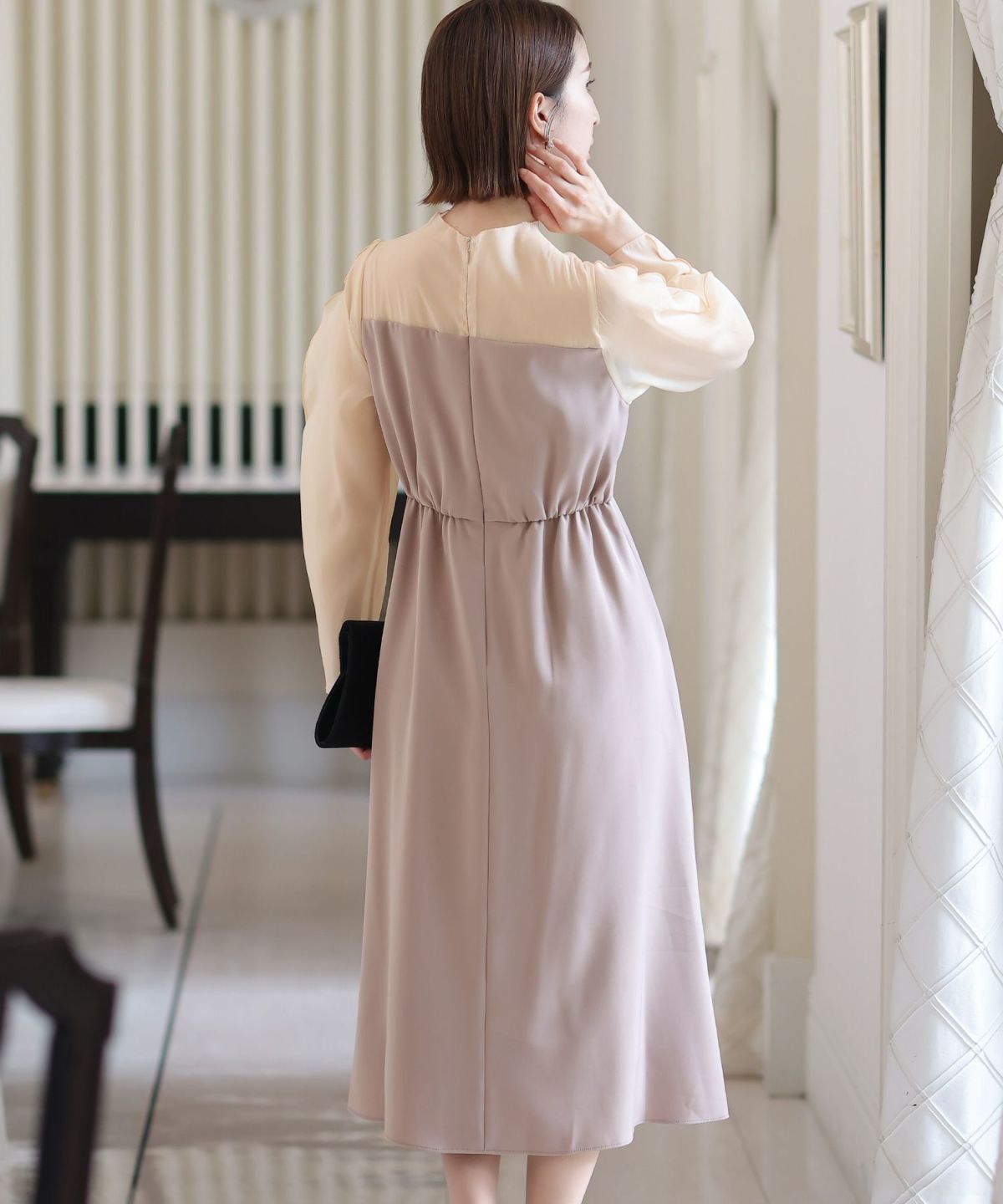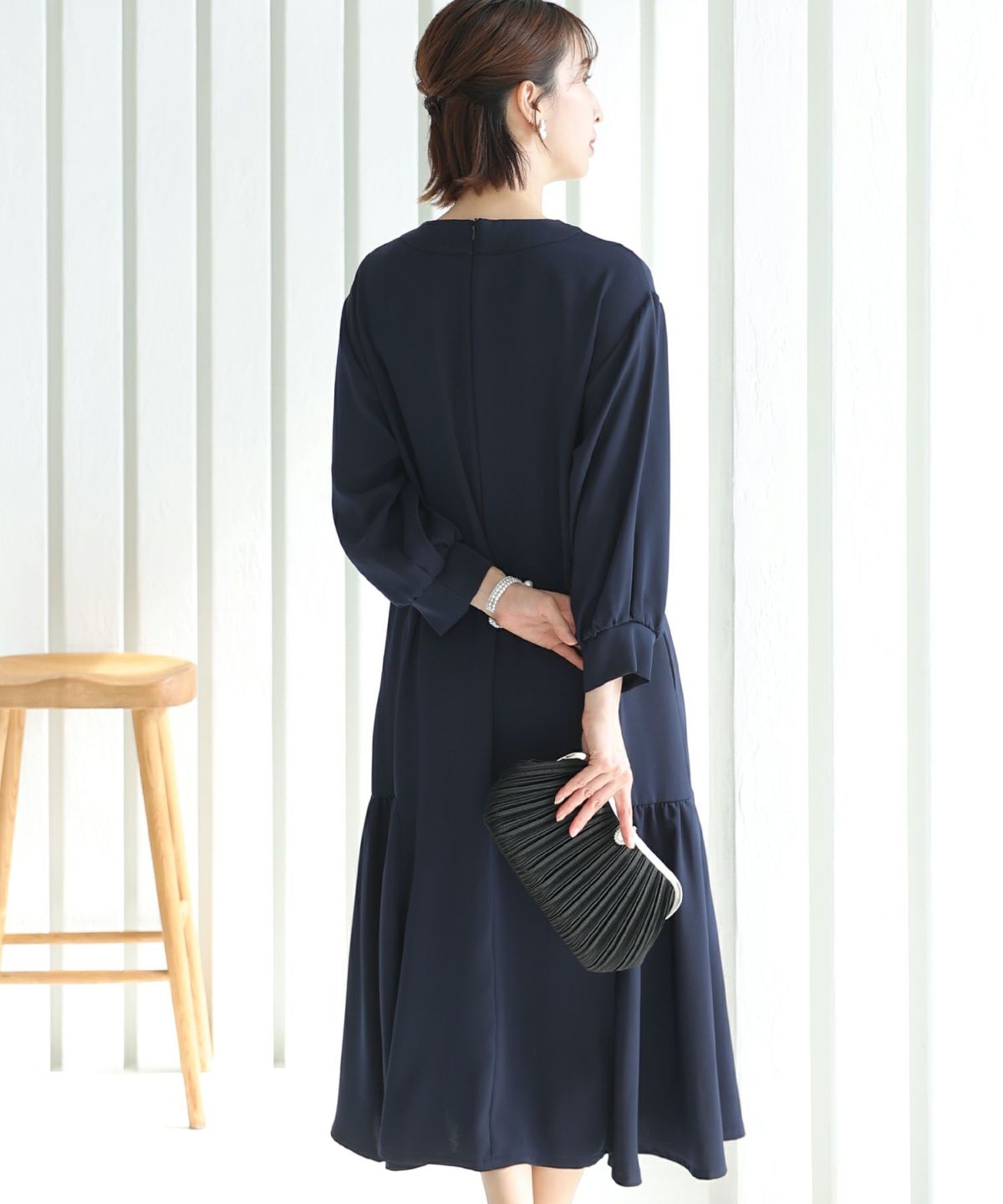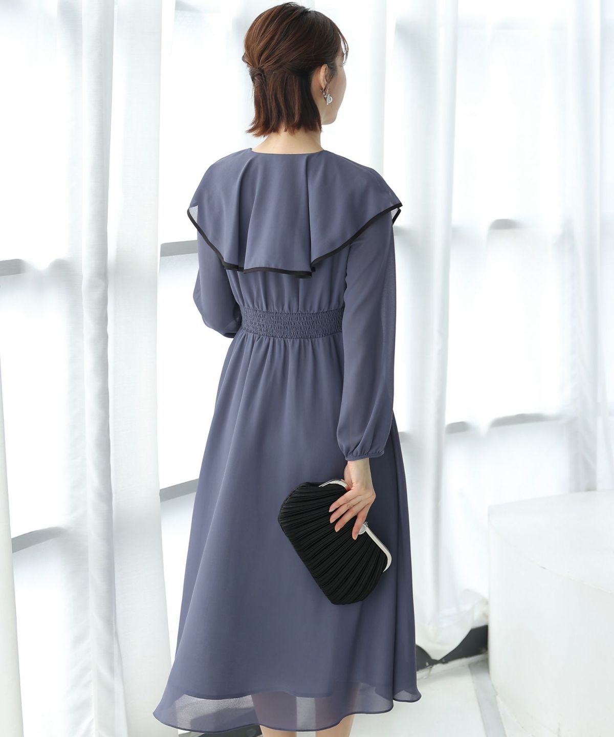 スピンドルだからバックショットも綺麗♪ ベルスリーブワンティアードワンピース