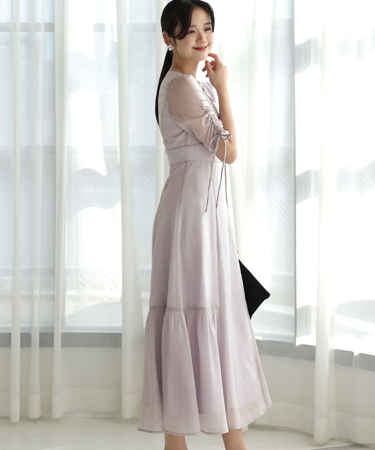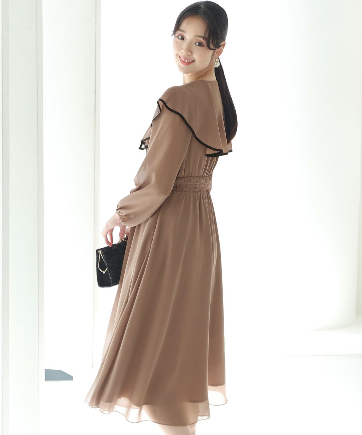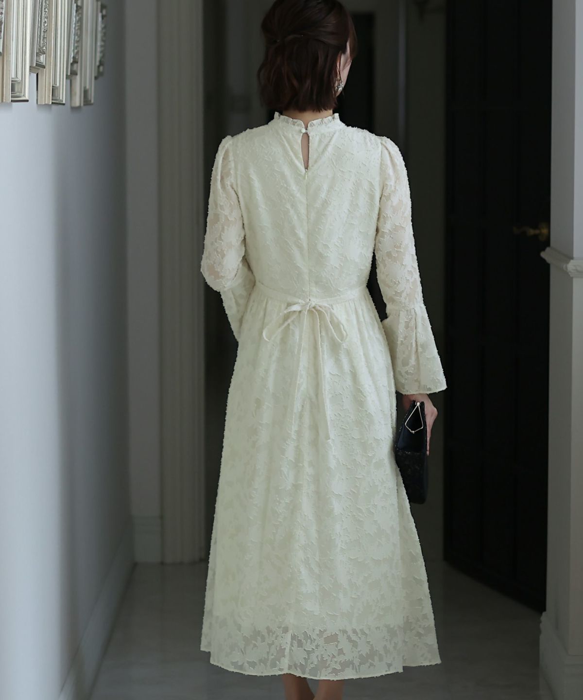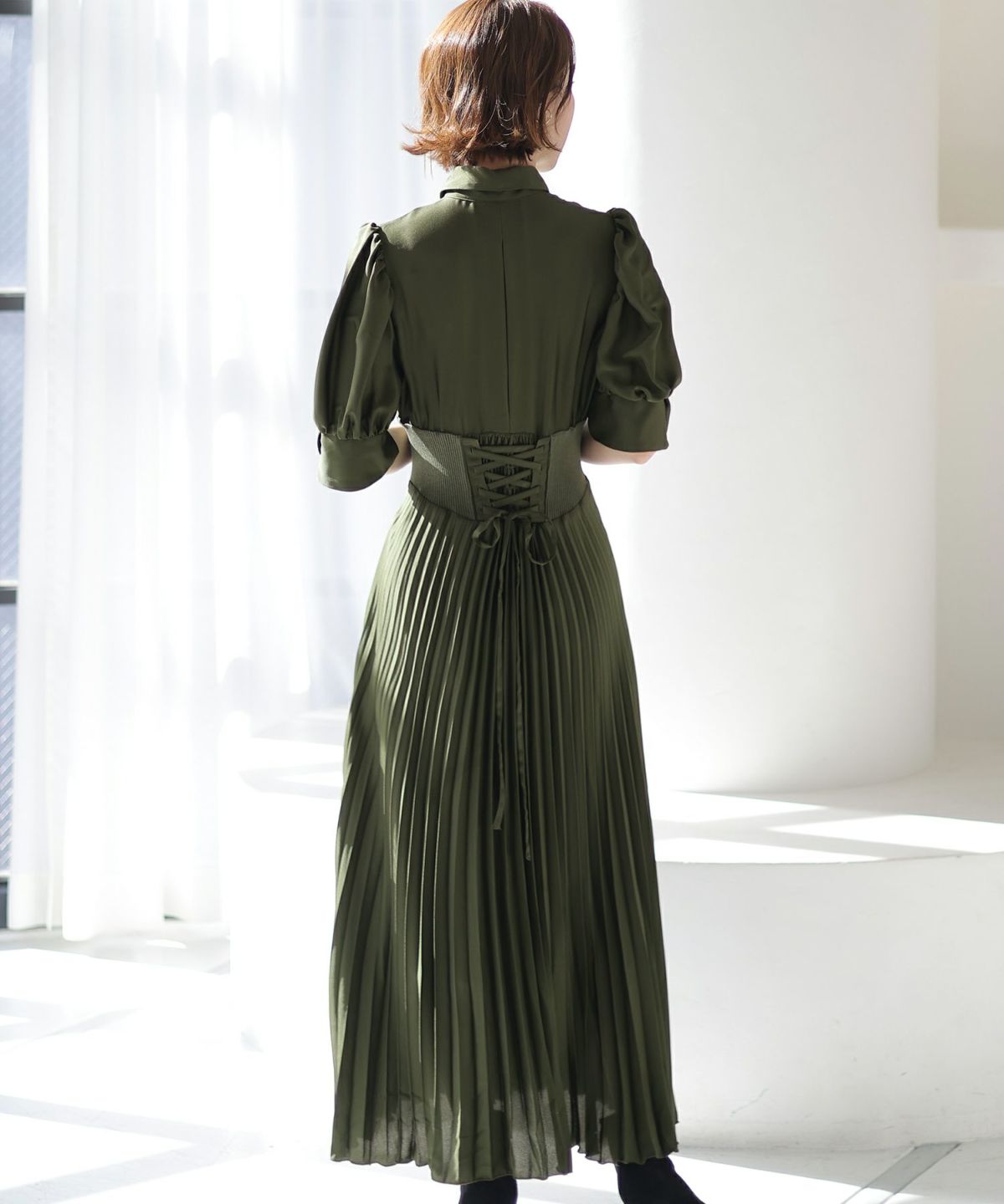 スピンドルだからバックショットも綺麗♪ ベルスリーブワンティアードワンピース