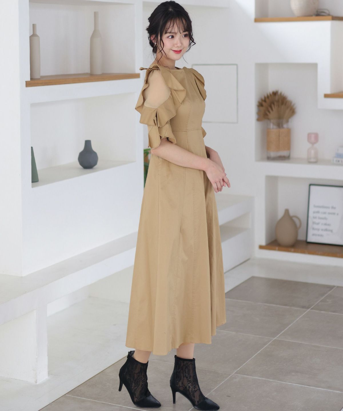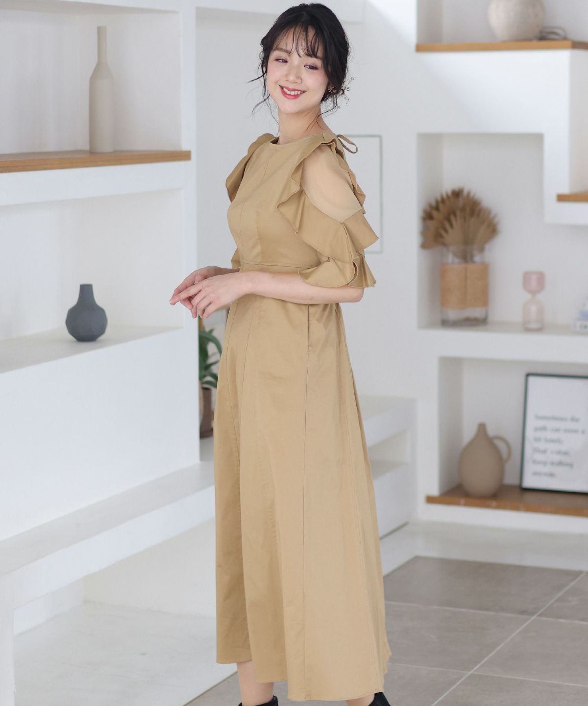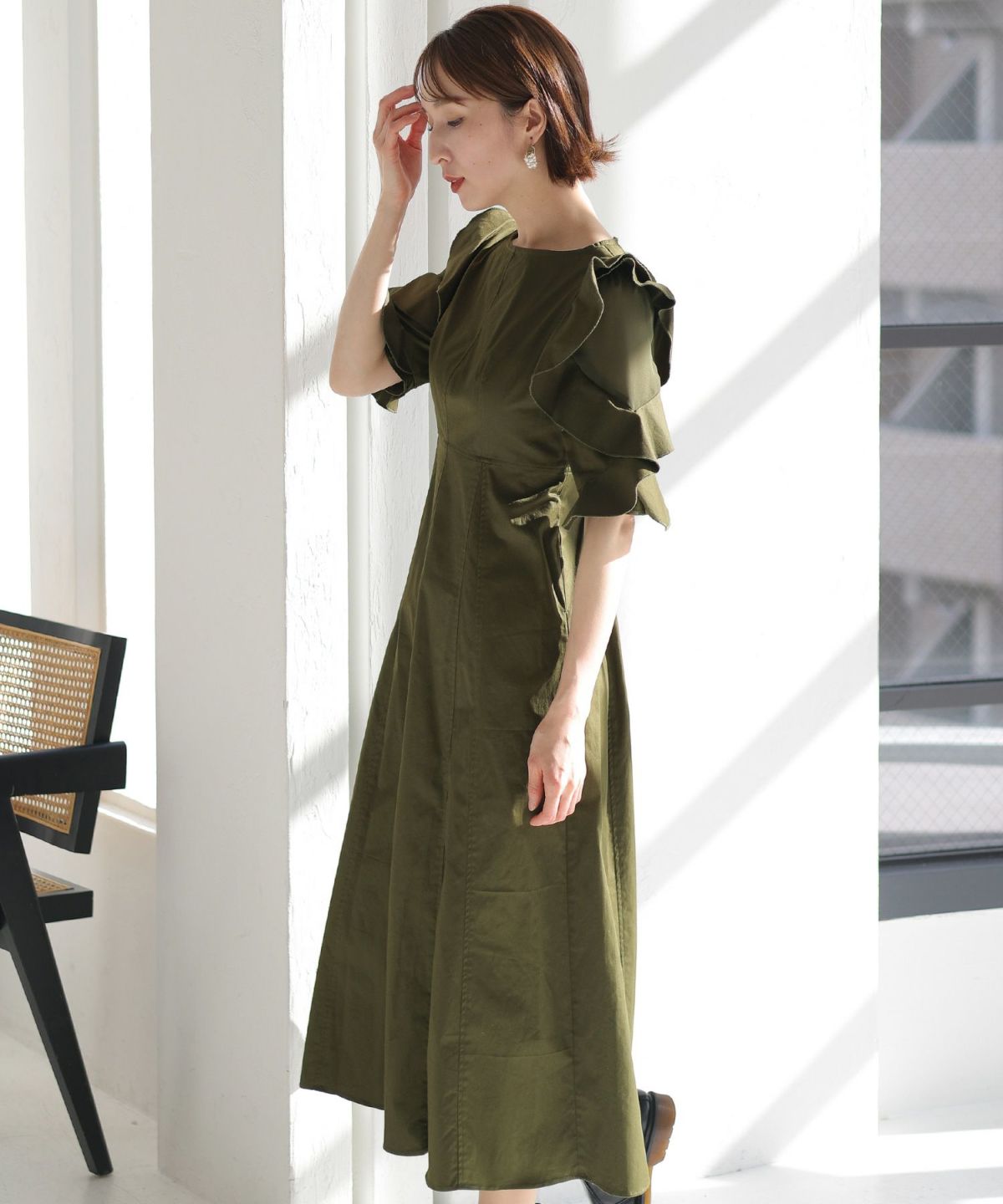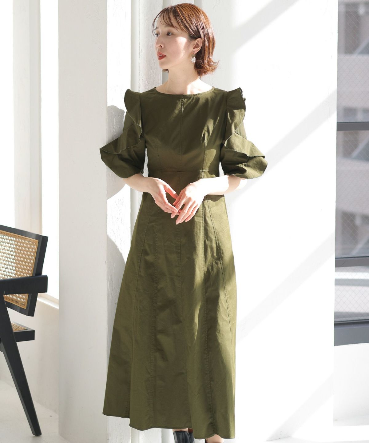 スピンドルだからバックショットも綺麗♪ ベルスリーブワンティアードワンピース