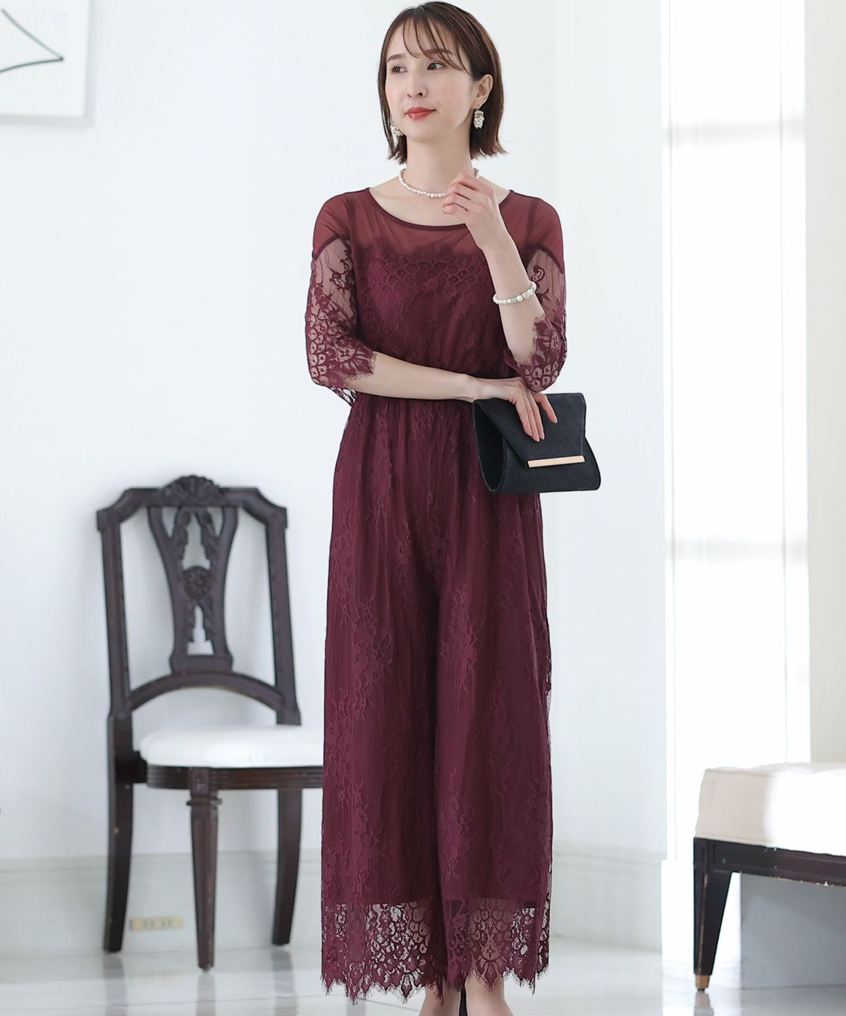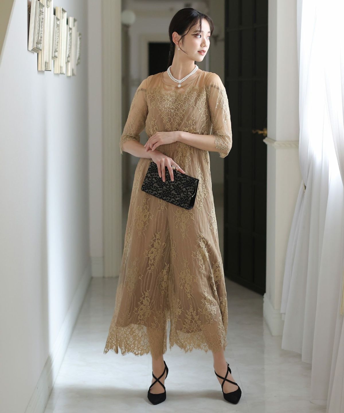 袖と裾に施されたスカラップレースで華やかな雰囲気に フラワーレースパンツドレス