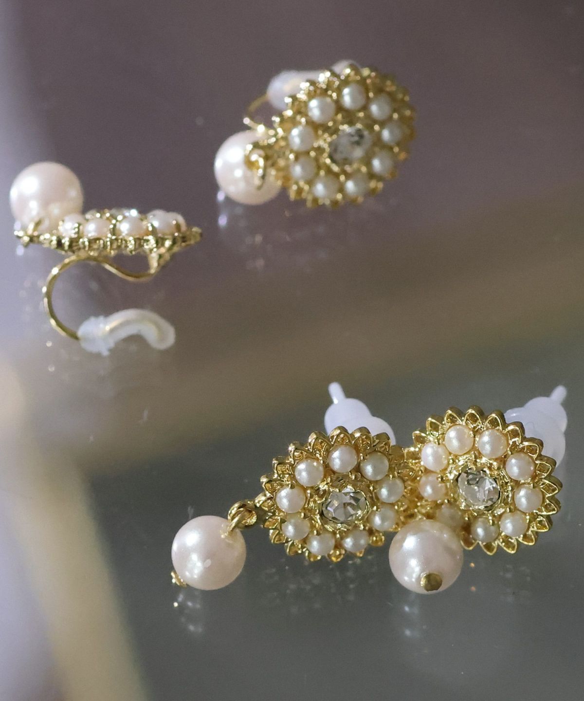パールが埋め込まれた繊細なデザイン フラワーパールイヤリング&ピアス
