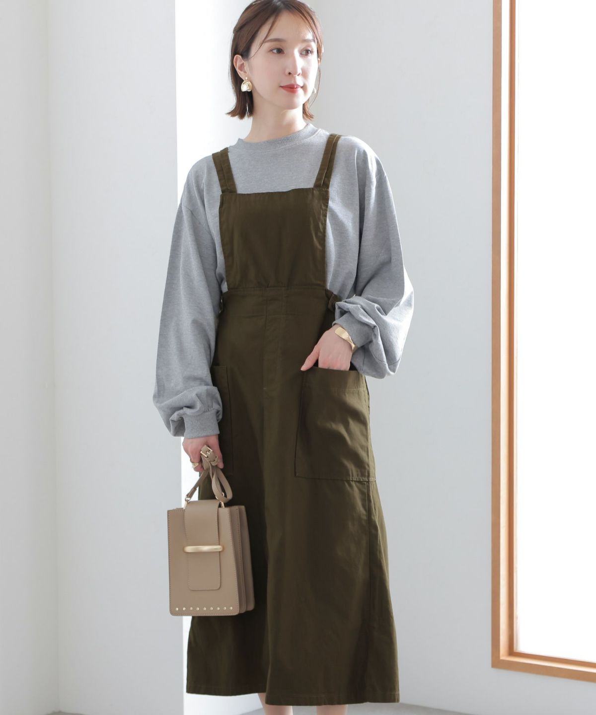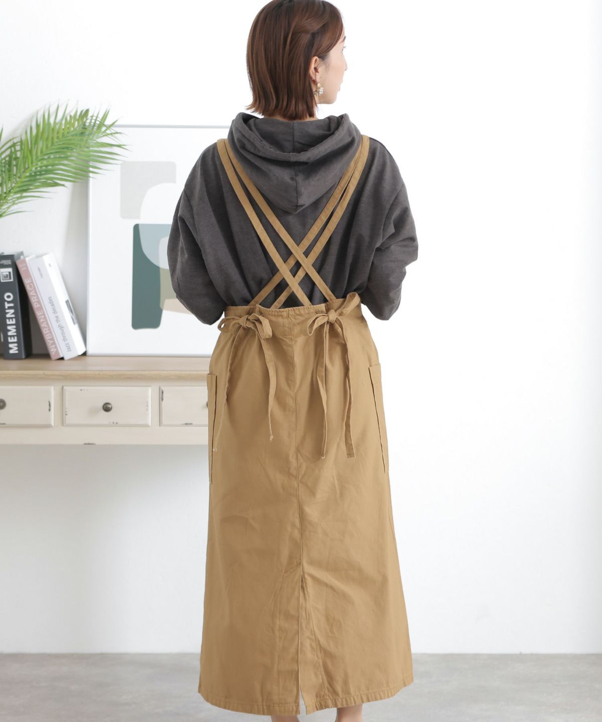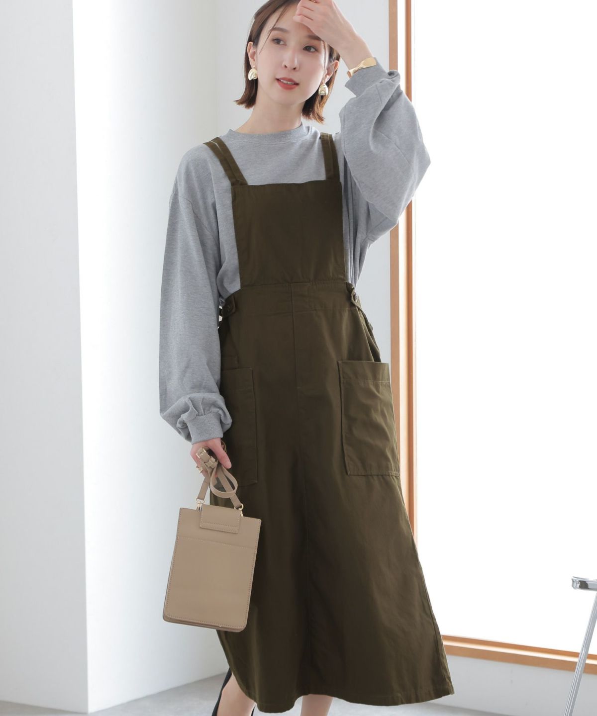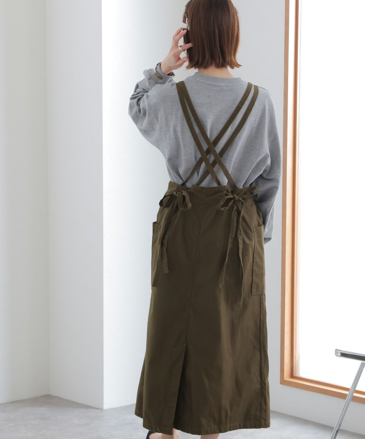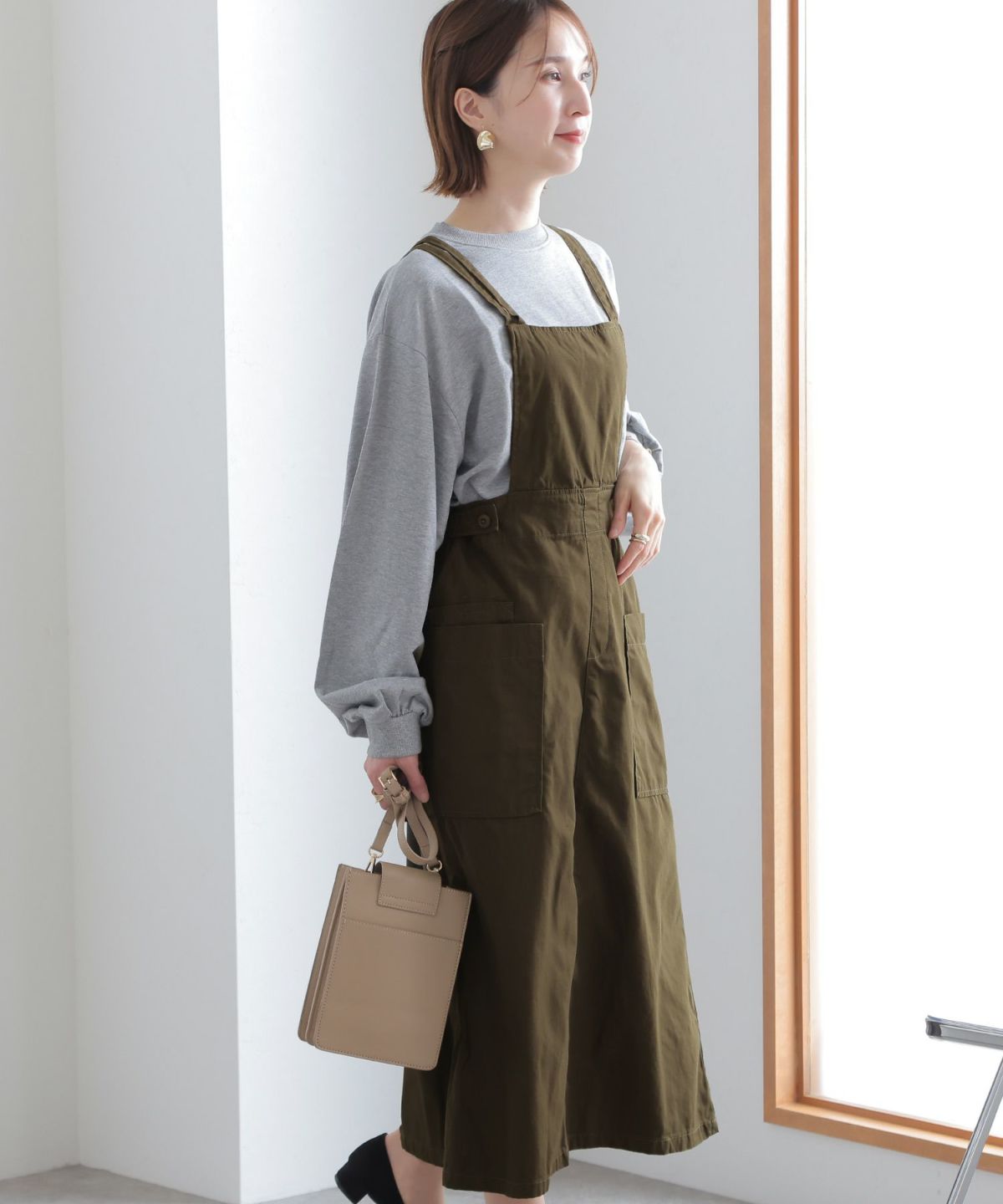 フレアシルエットが可愛い ツイルエプロンサロペットスカート