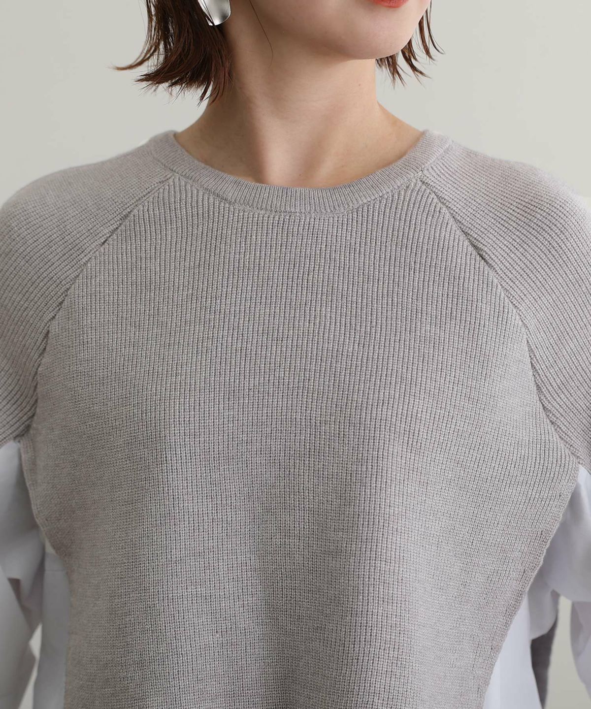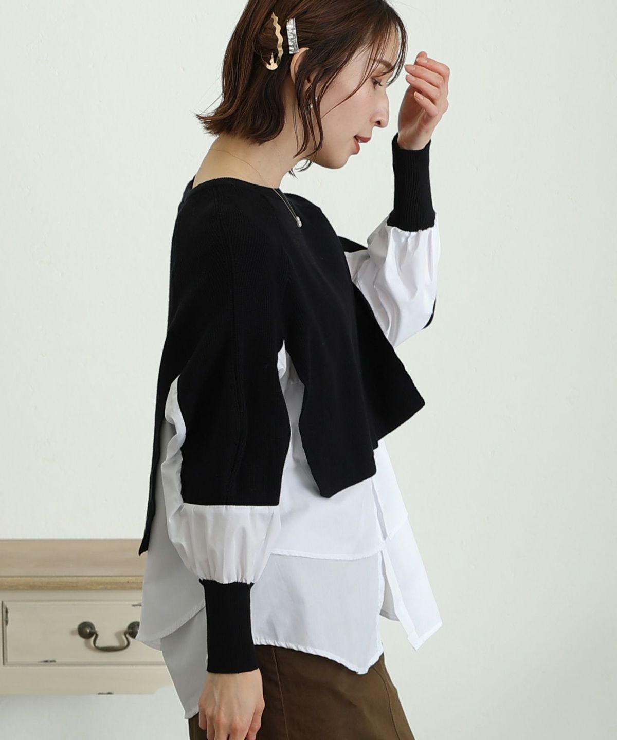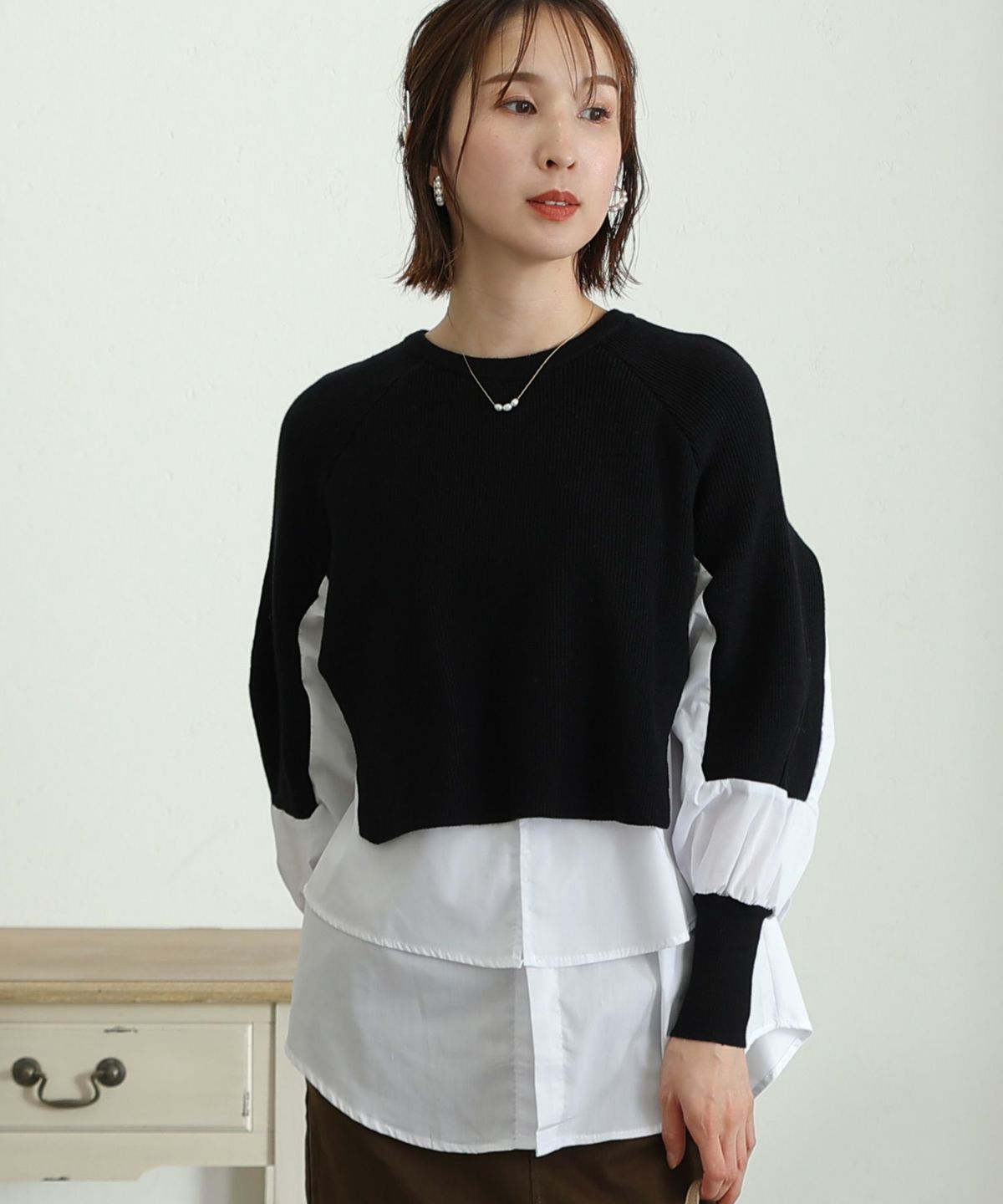 ニットとブラウス素材の組み合わせがかわいい レイヤード風アシンメトリーニット