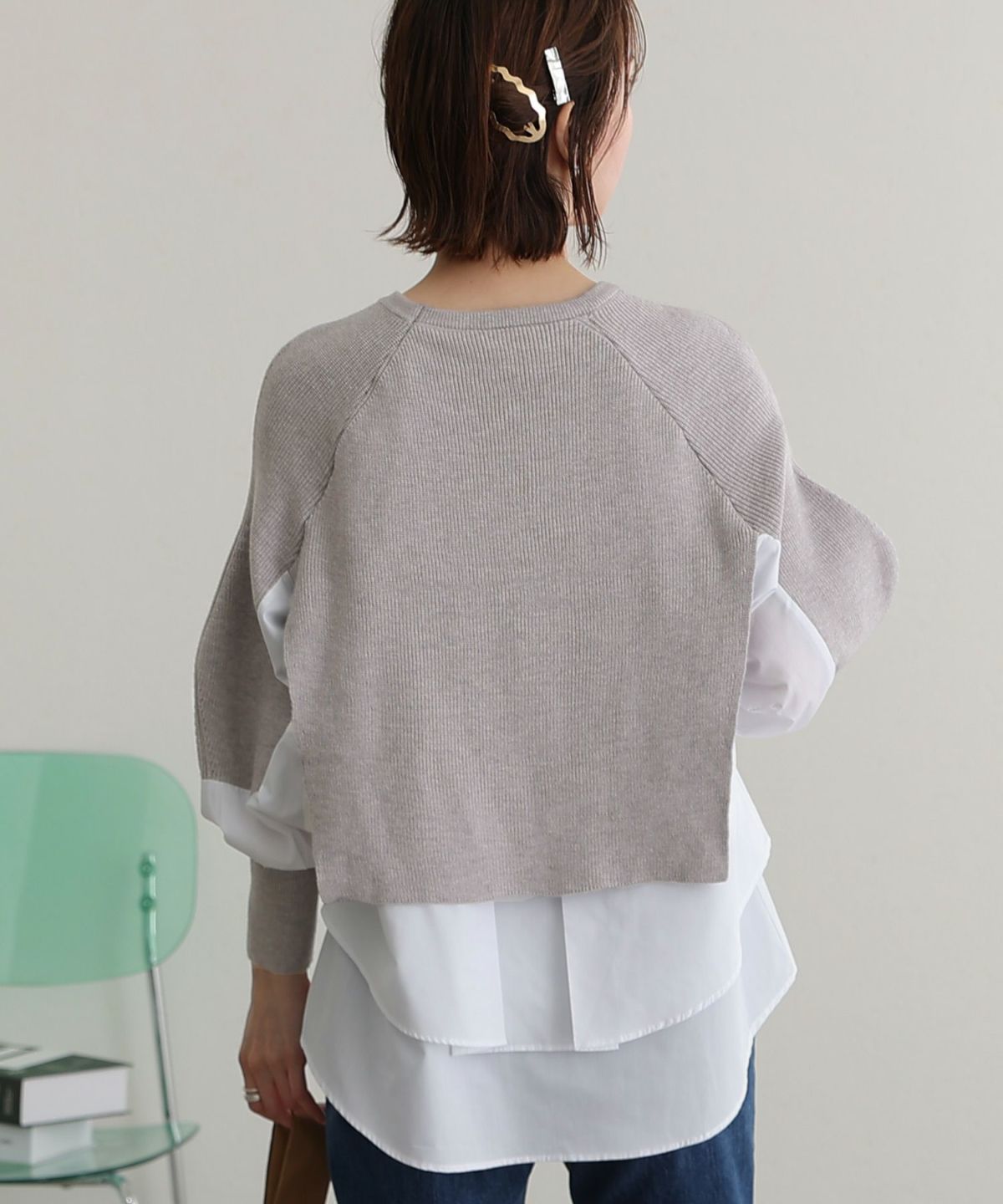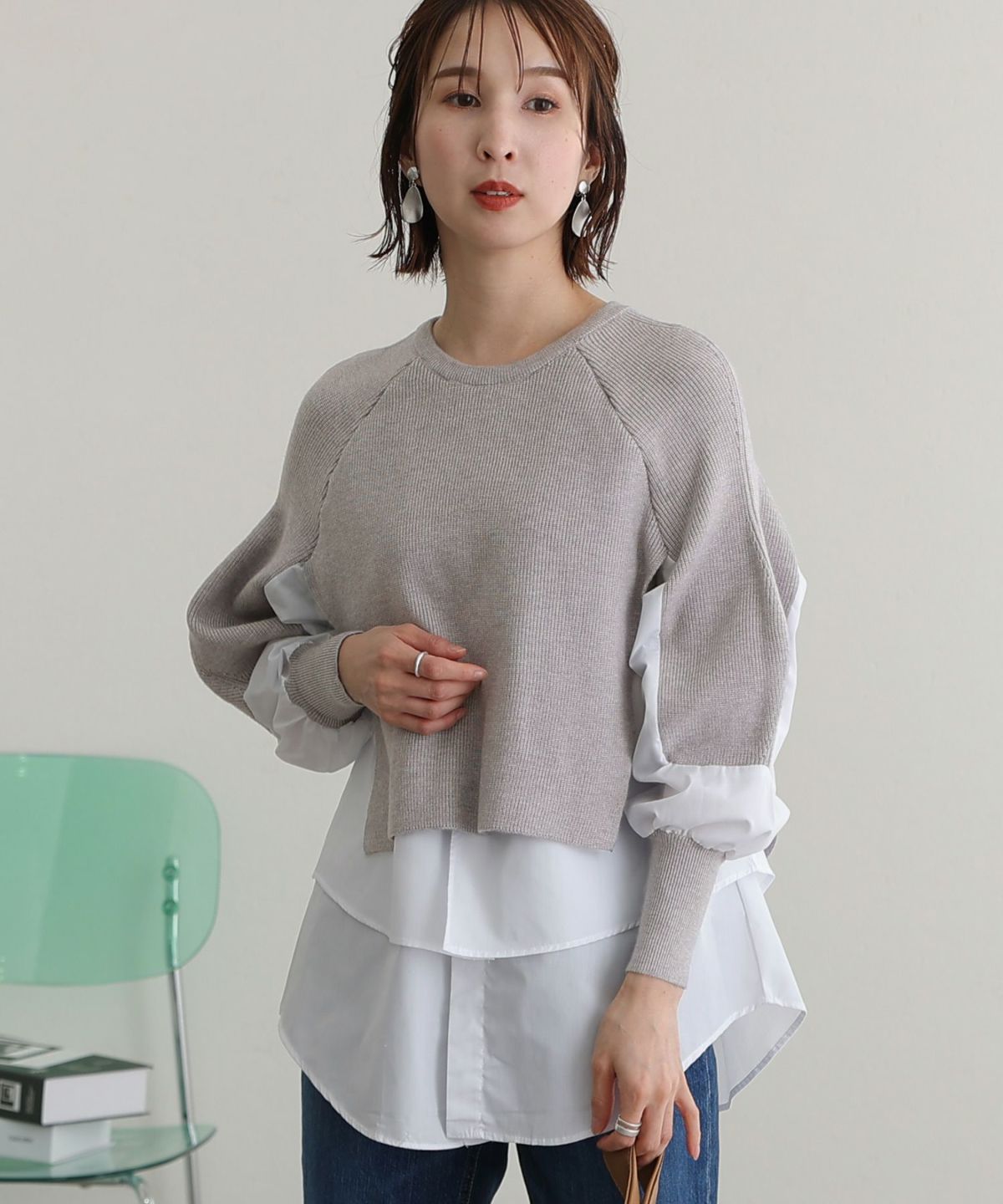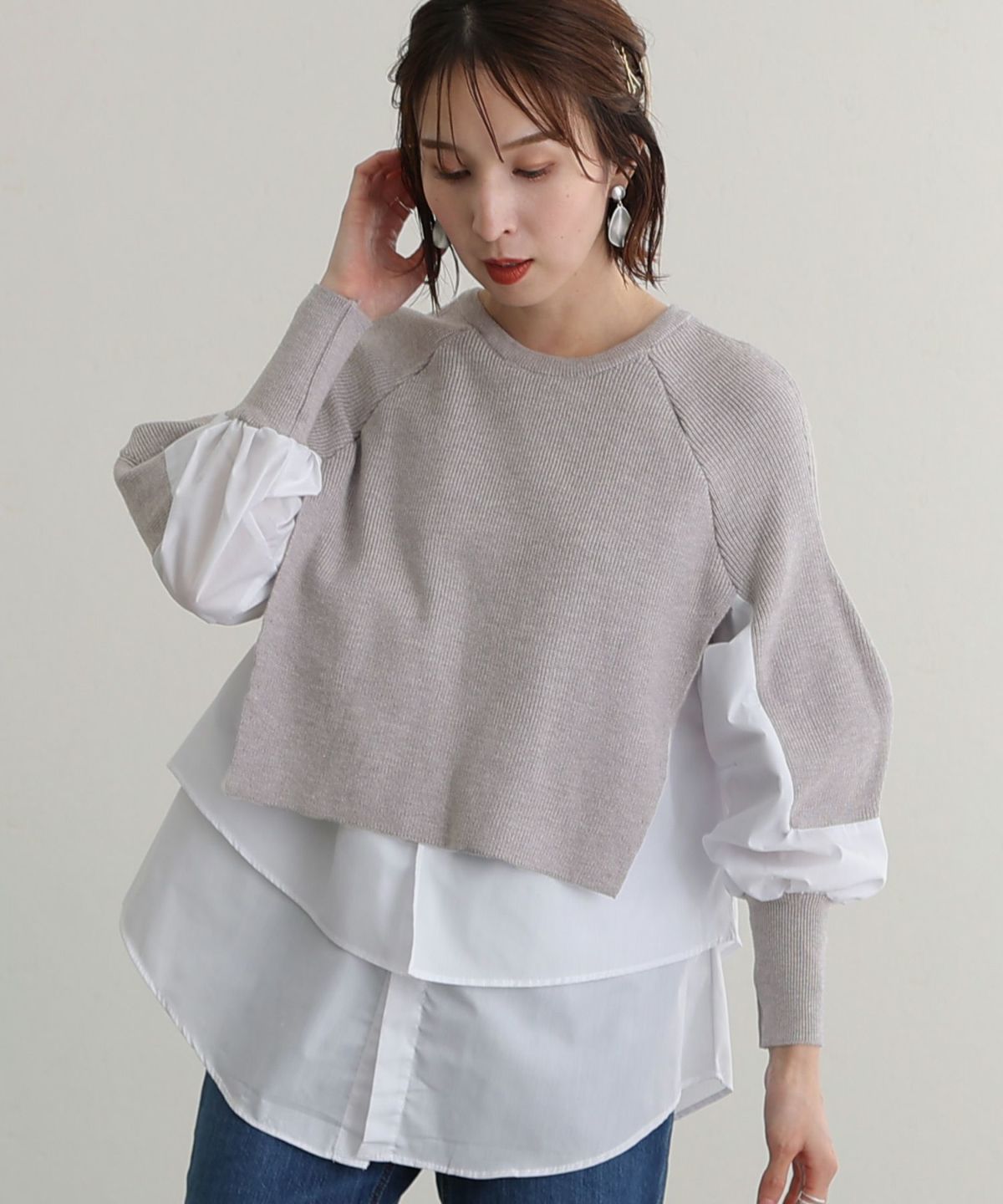 ニットとブラウス素材の組み合わせがかわいい レイヤード風アシンメトリーニット