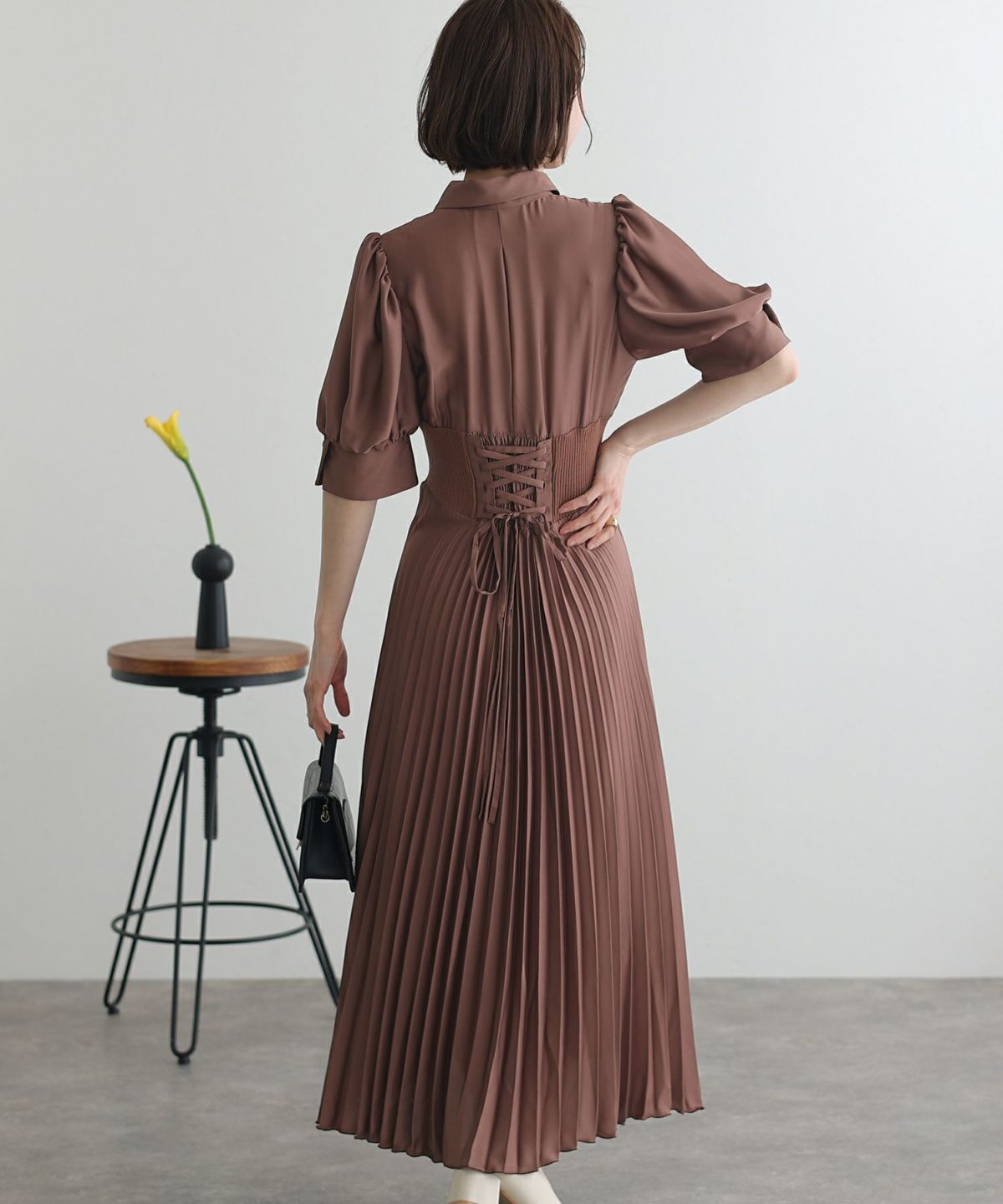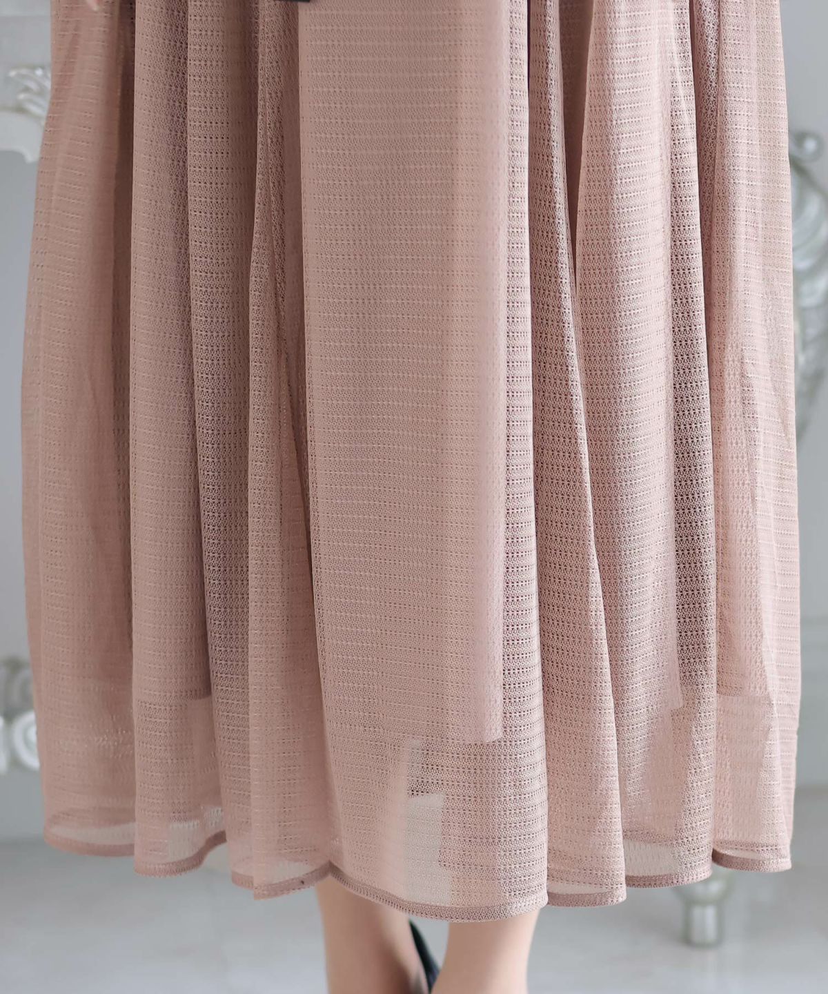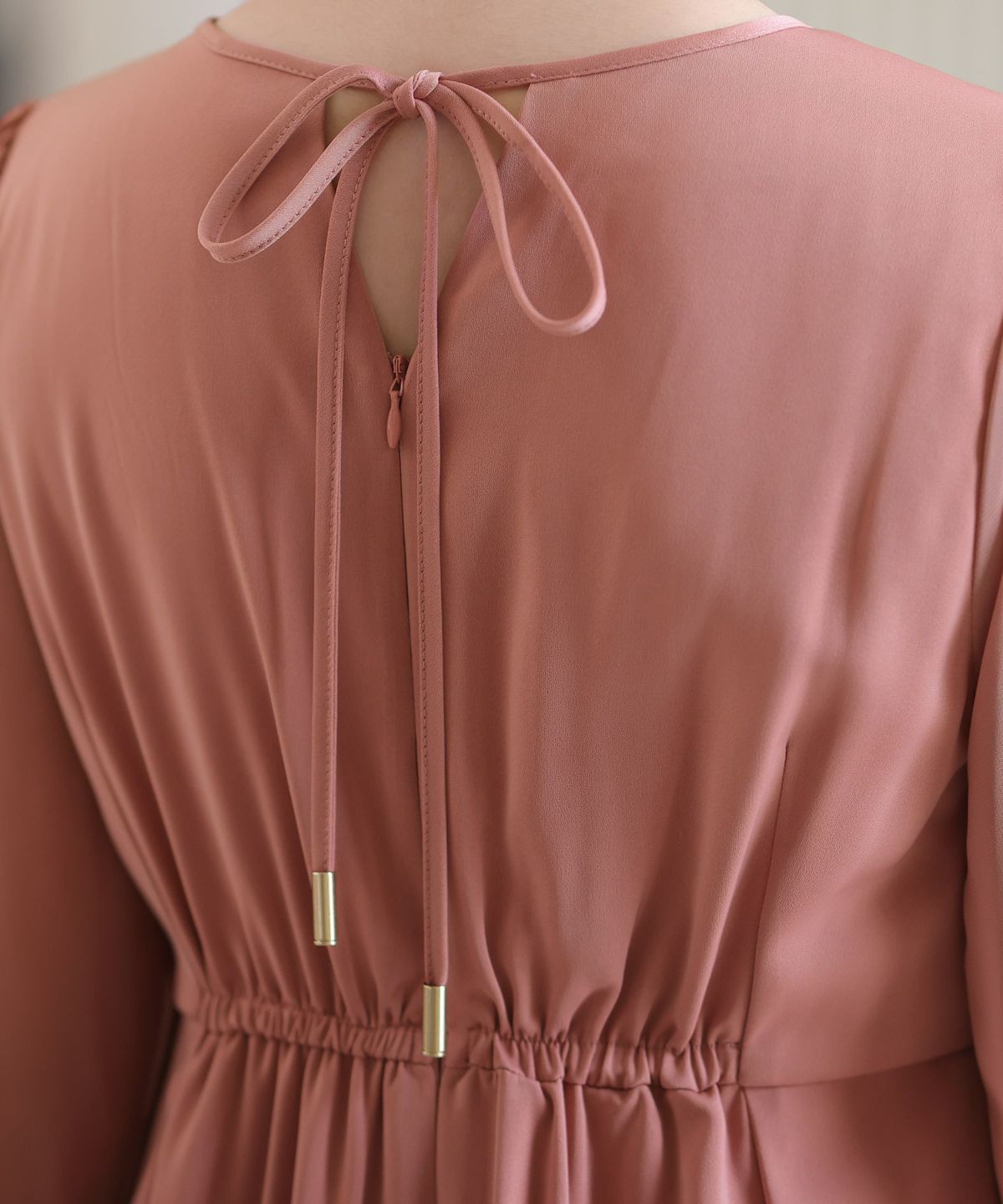 細めのピンタックと背面のリボンが大人可愛い ネックバックリボンピンタックドレス