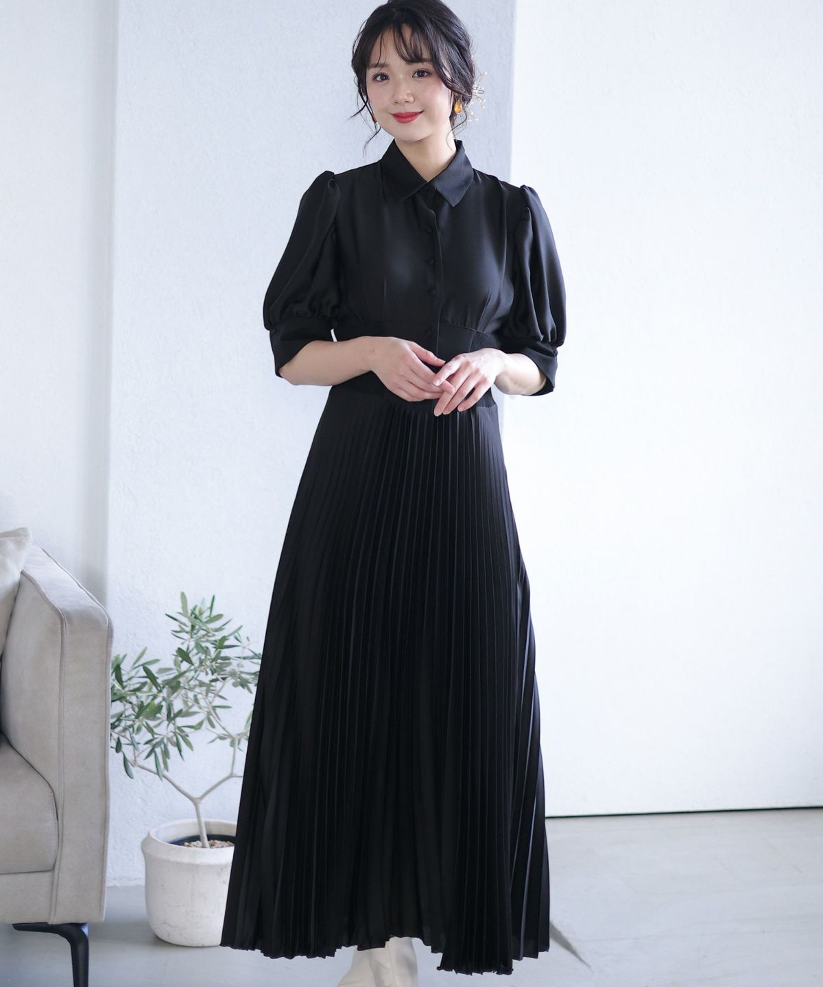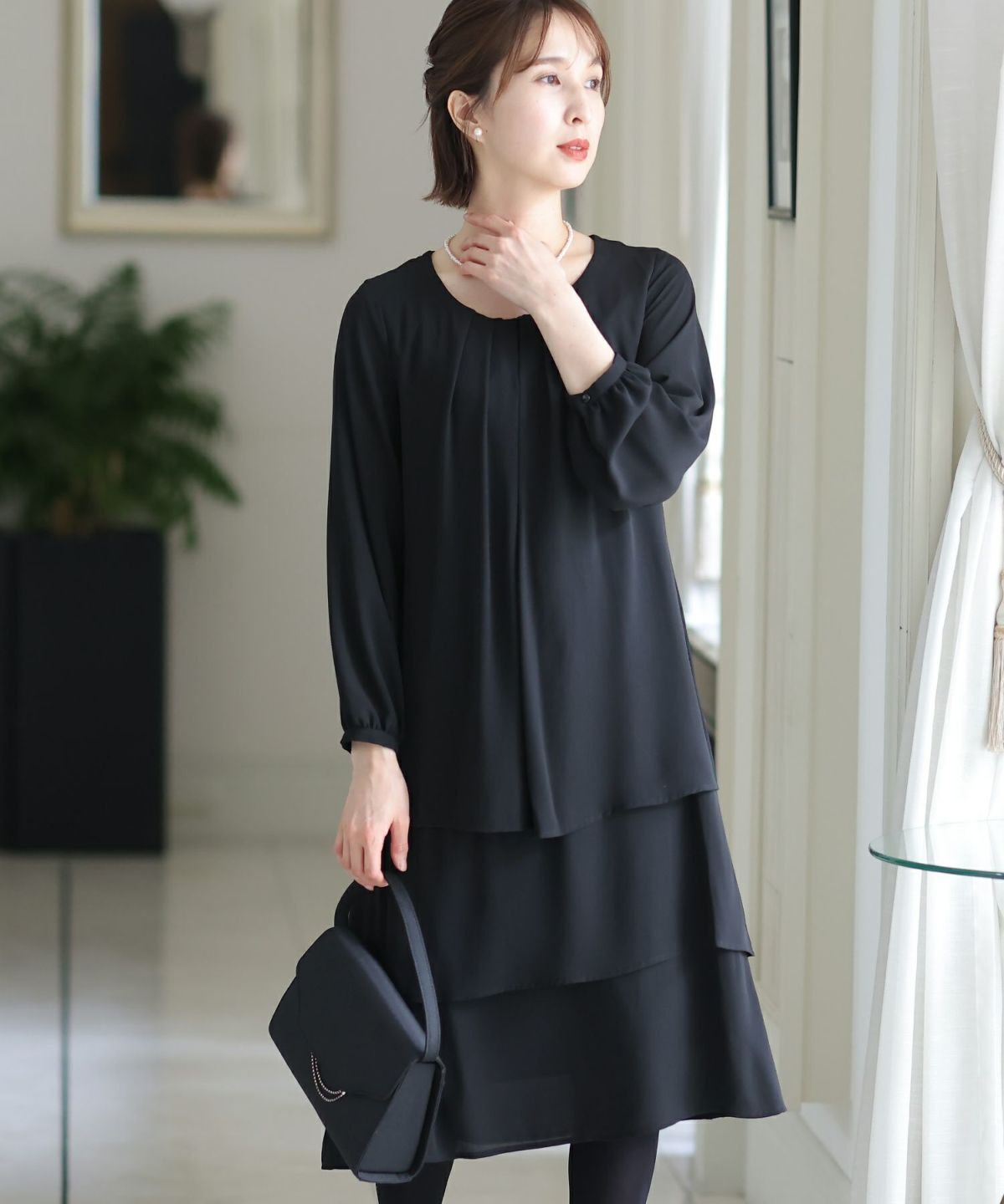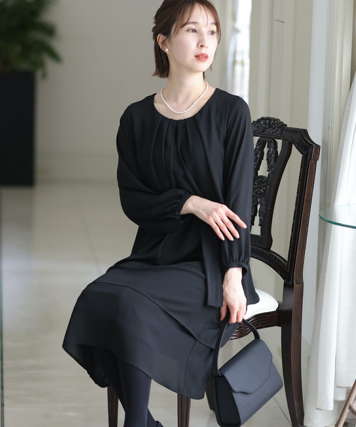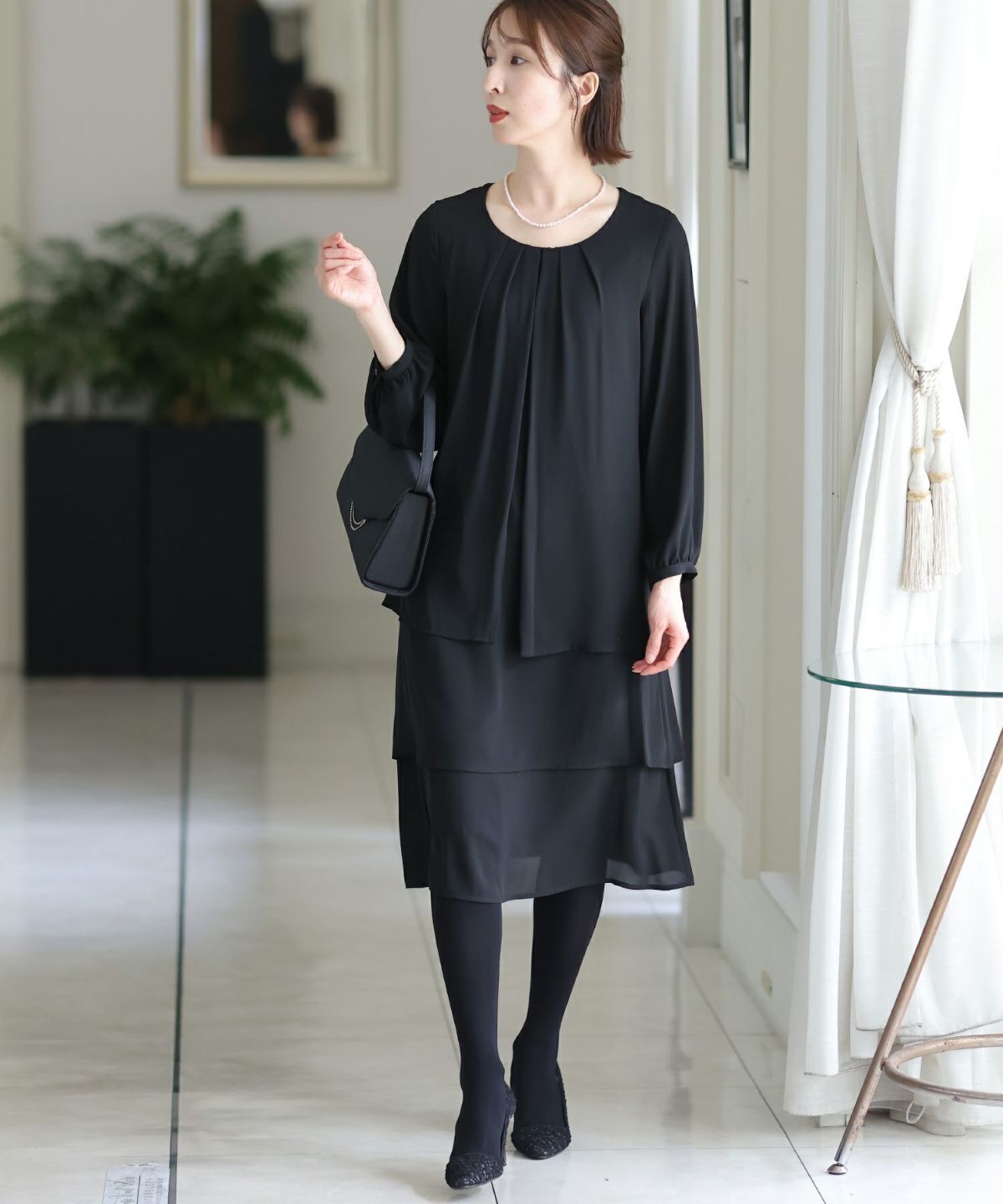 シフォンによるやわらかなシルエットが女性らしい タックデザインシフォンブラックワンピース