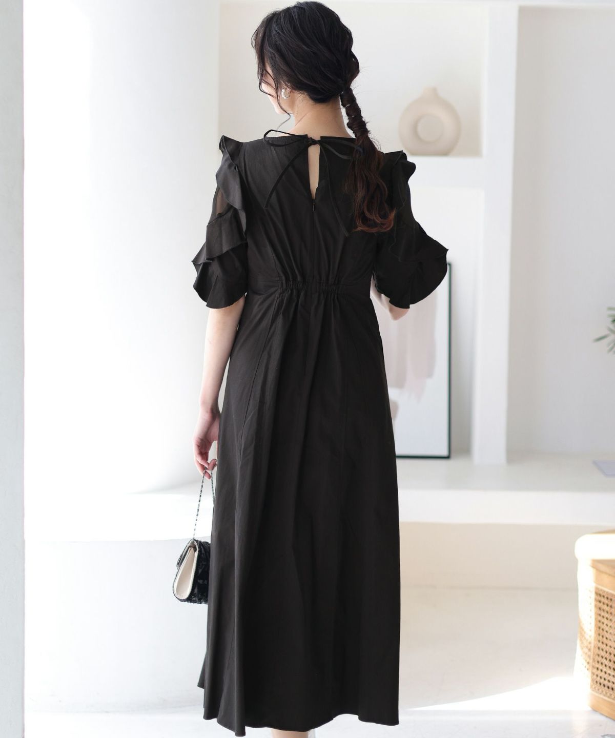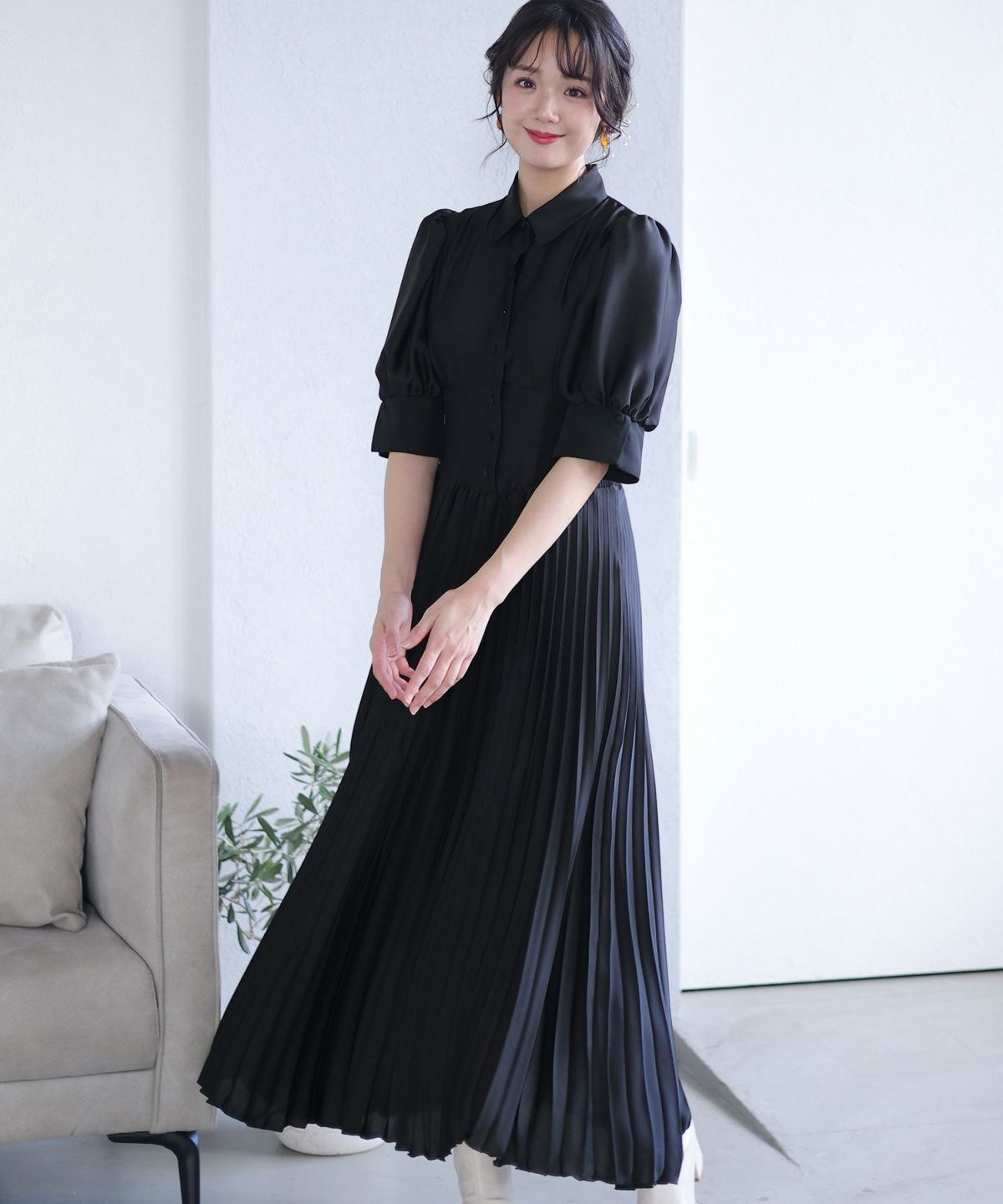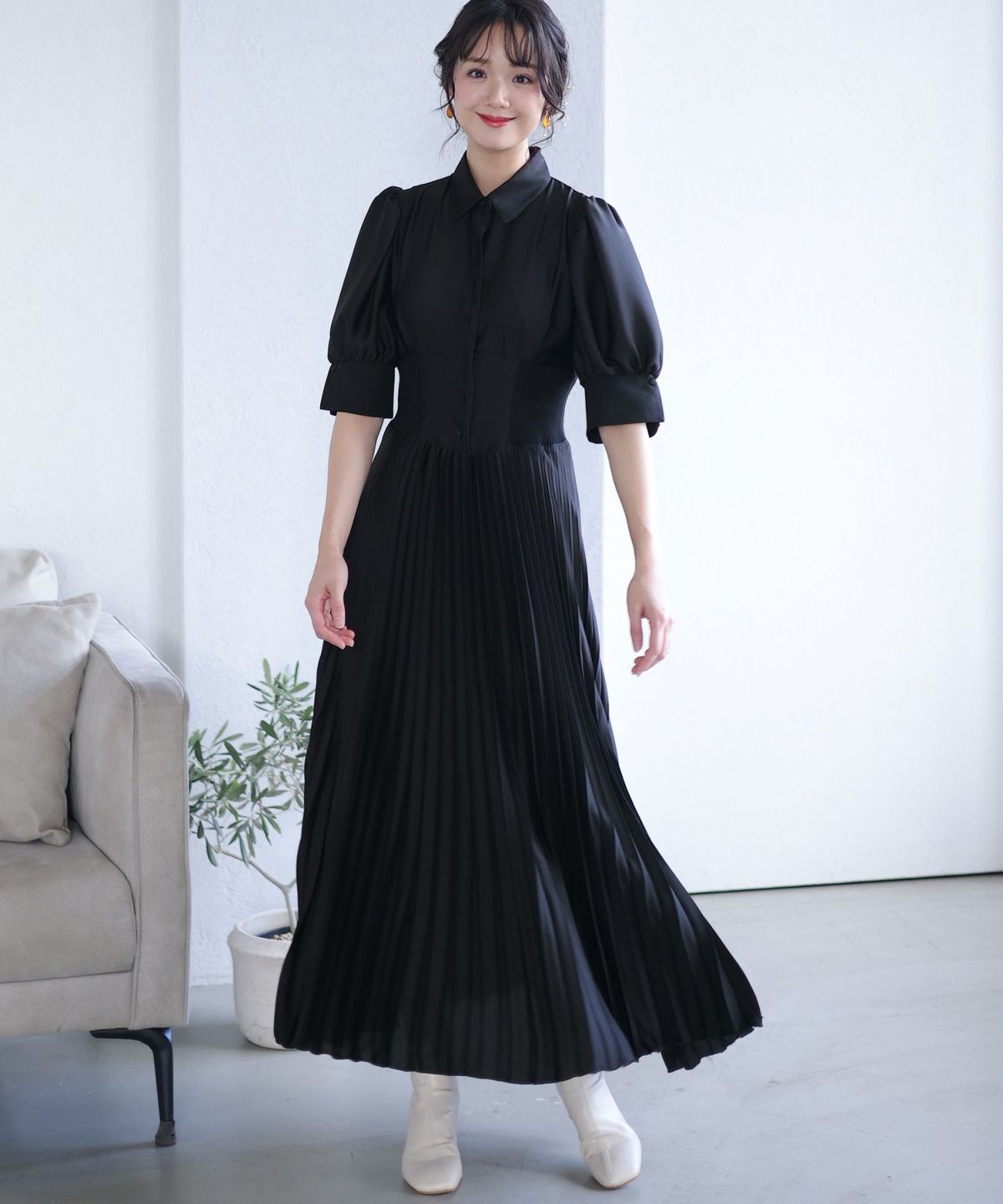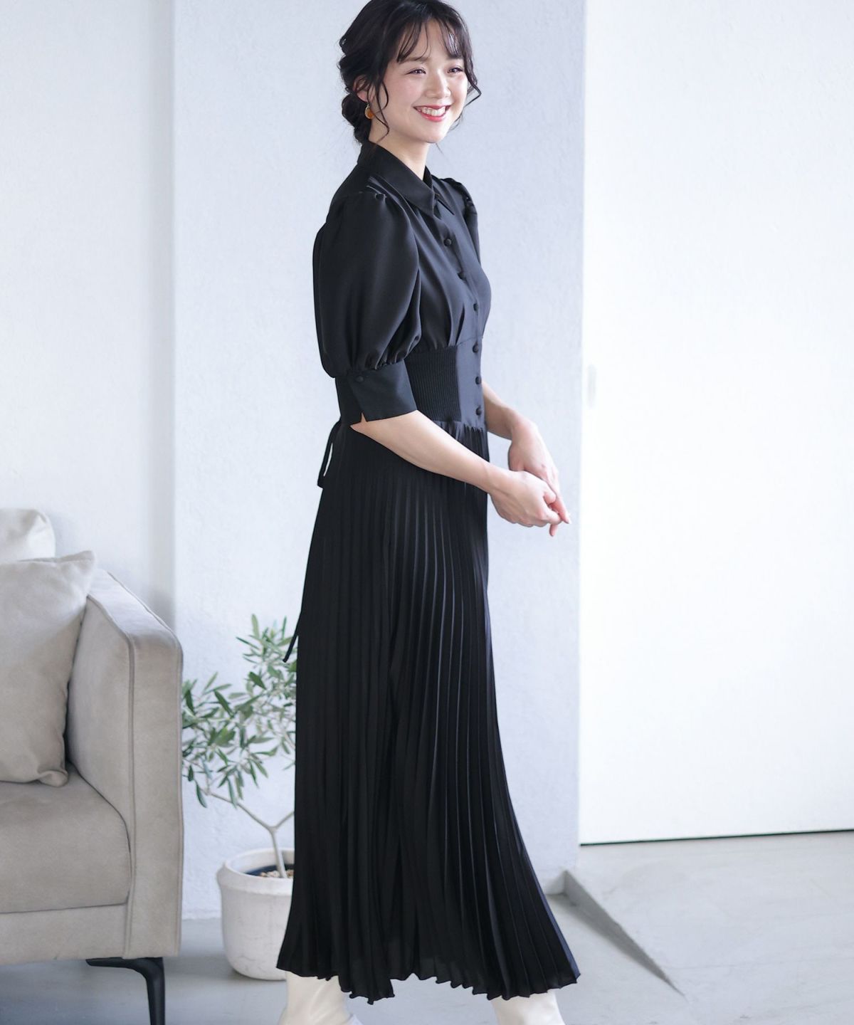 シフォンによるやわらかなシルエットが女性らしい タックデザインシフォンブラックワンピース