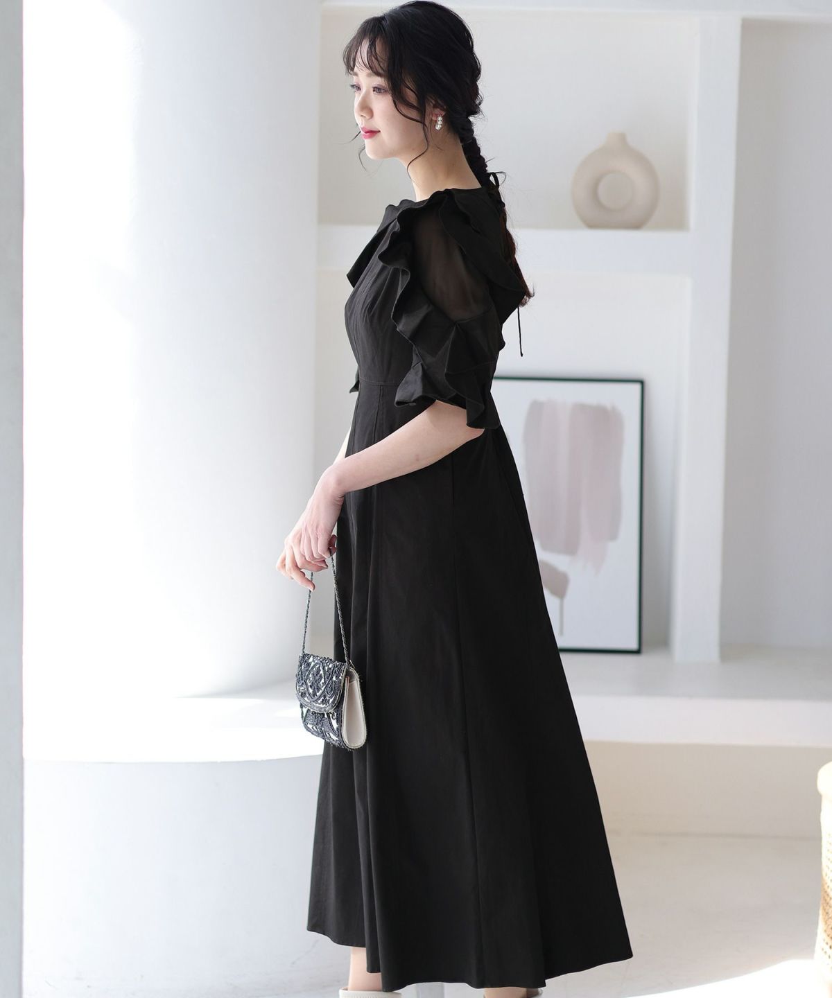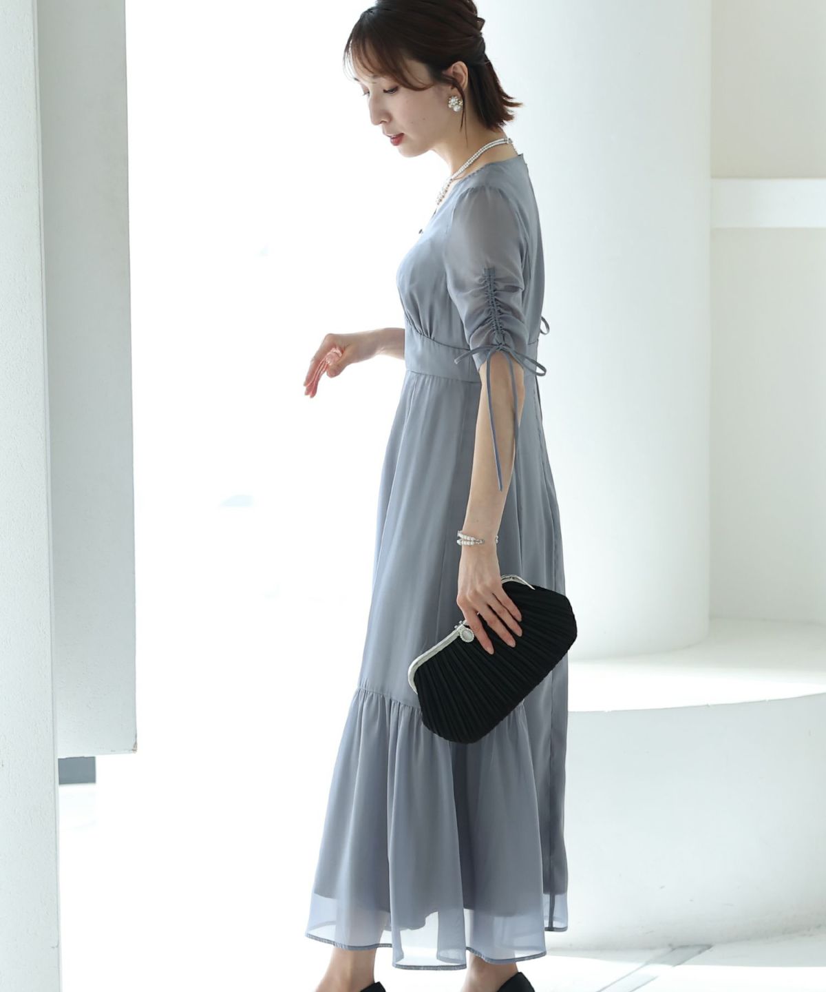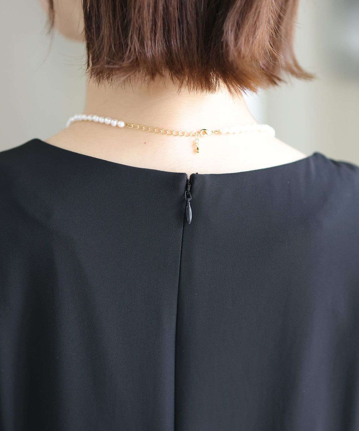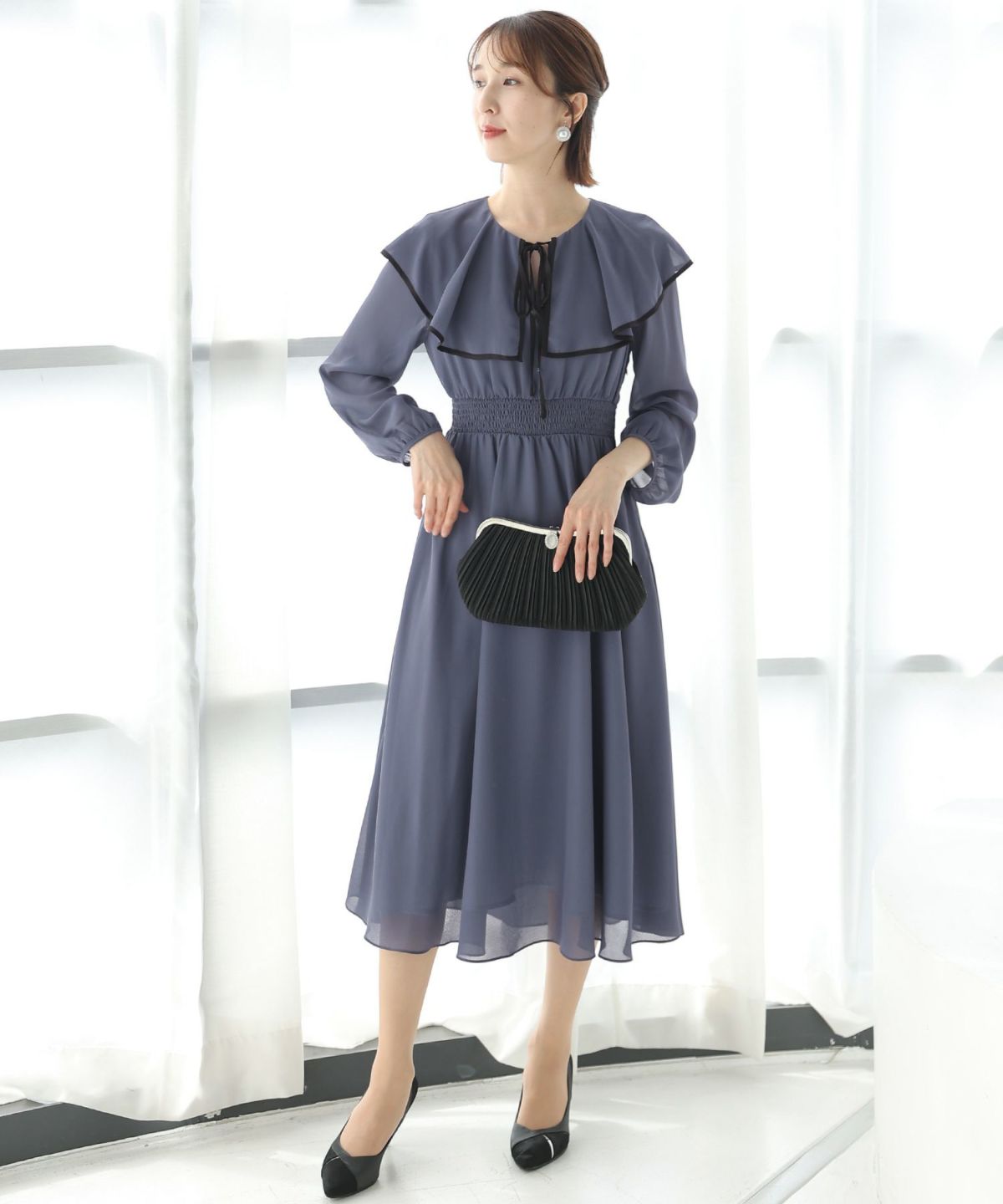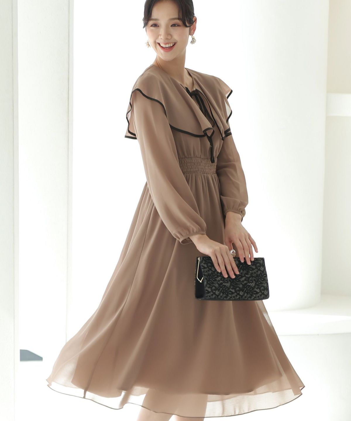 シフォンによるやわらかなシルエットが女性らしい タックデザインシフォンブラックワンピース