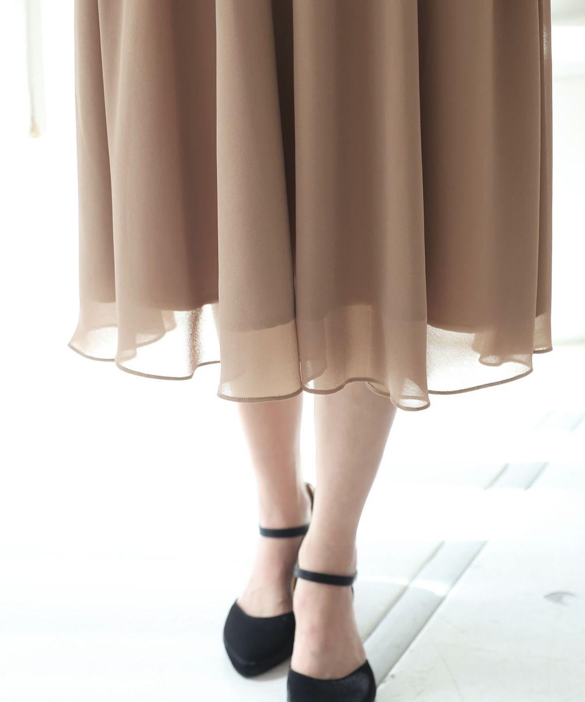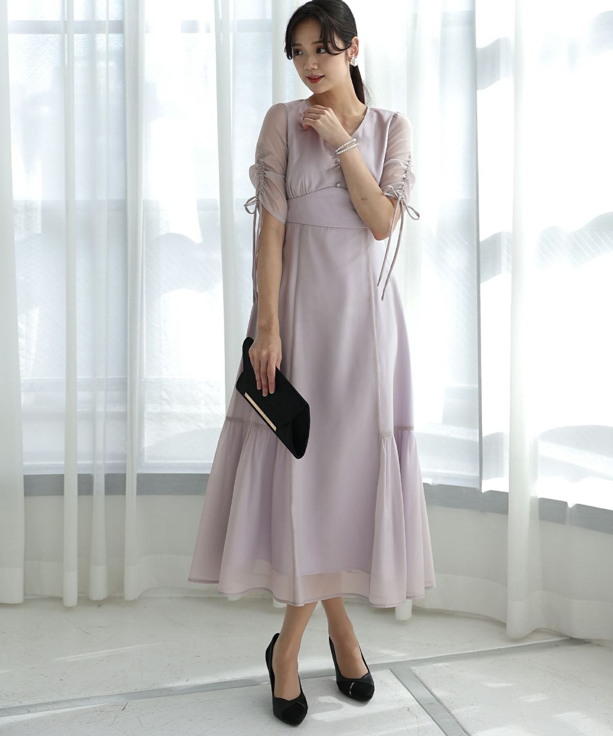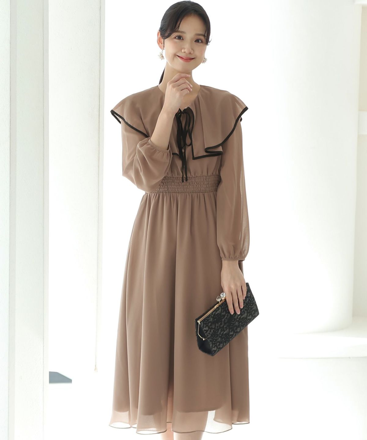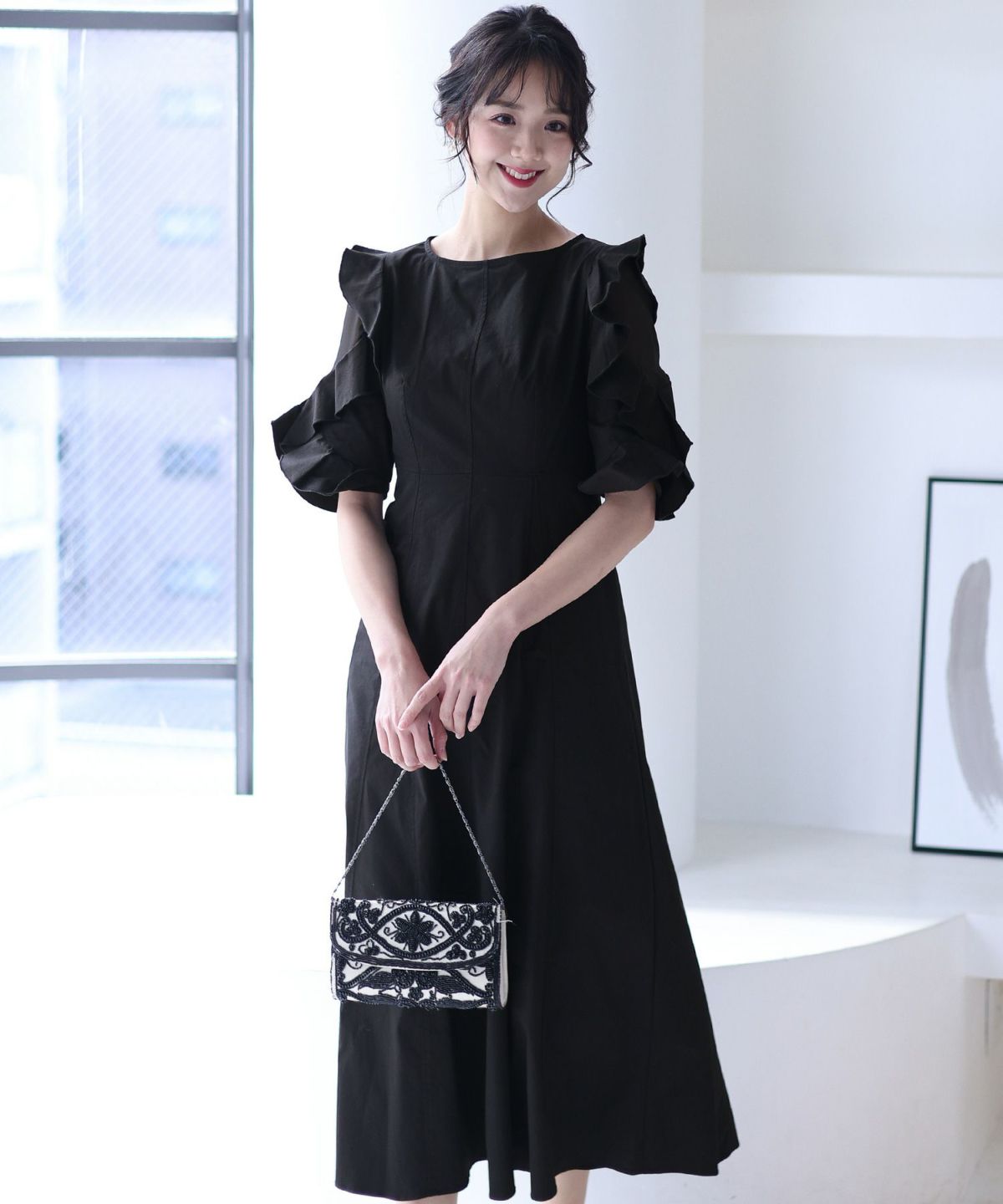 シフォンによるやわらかなシルエットが女性らしい タックデザインシフォンブラックワンピース