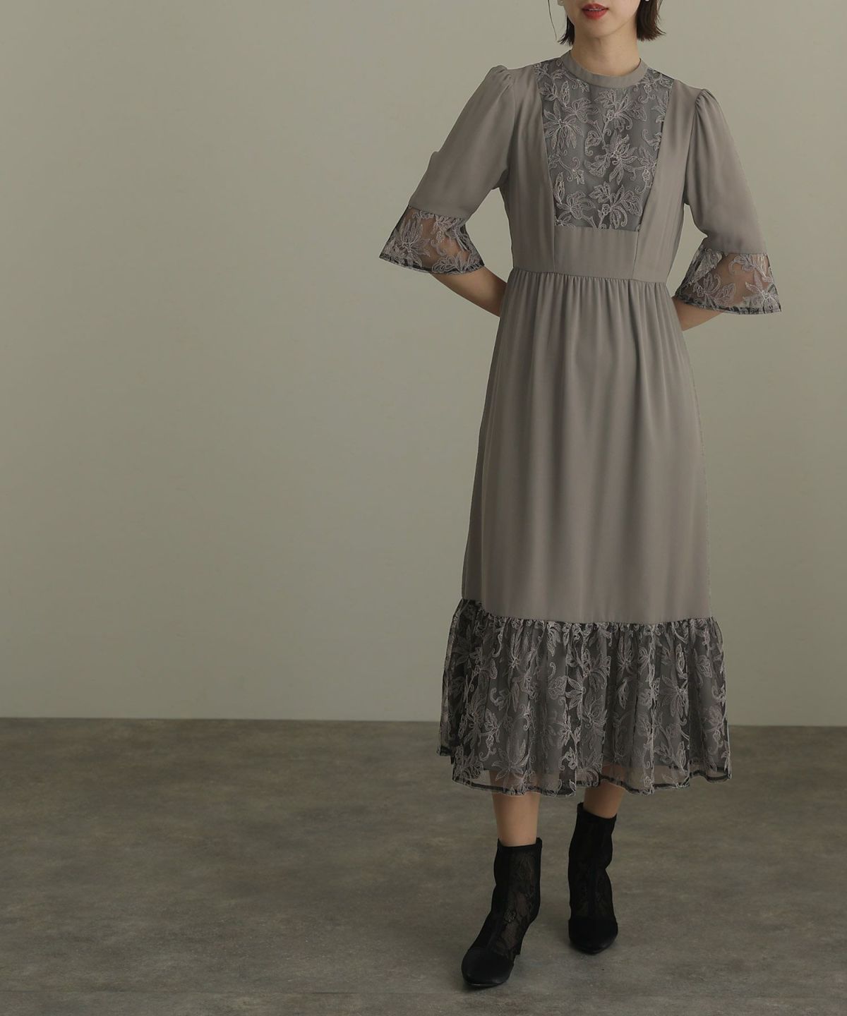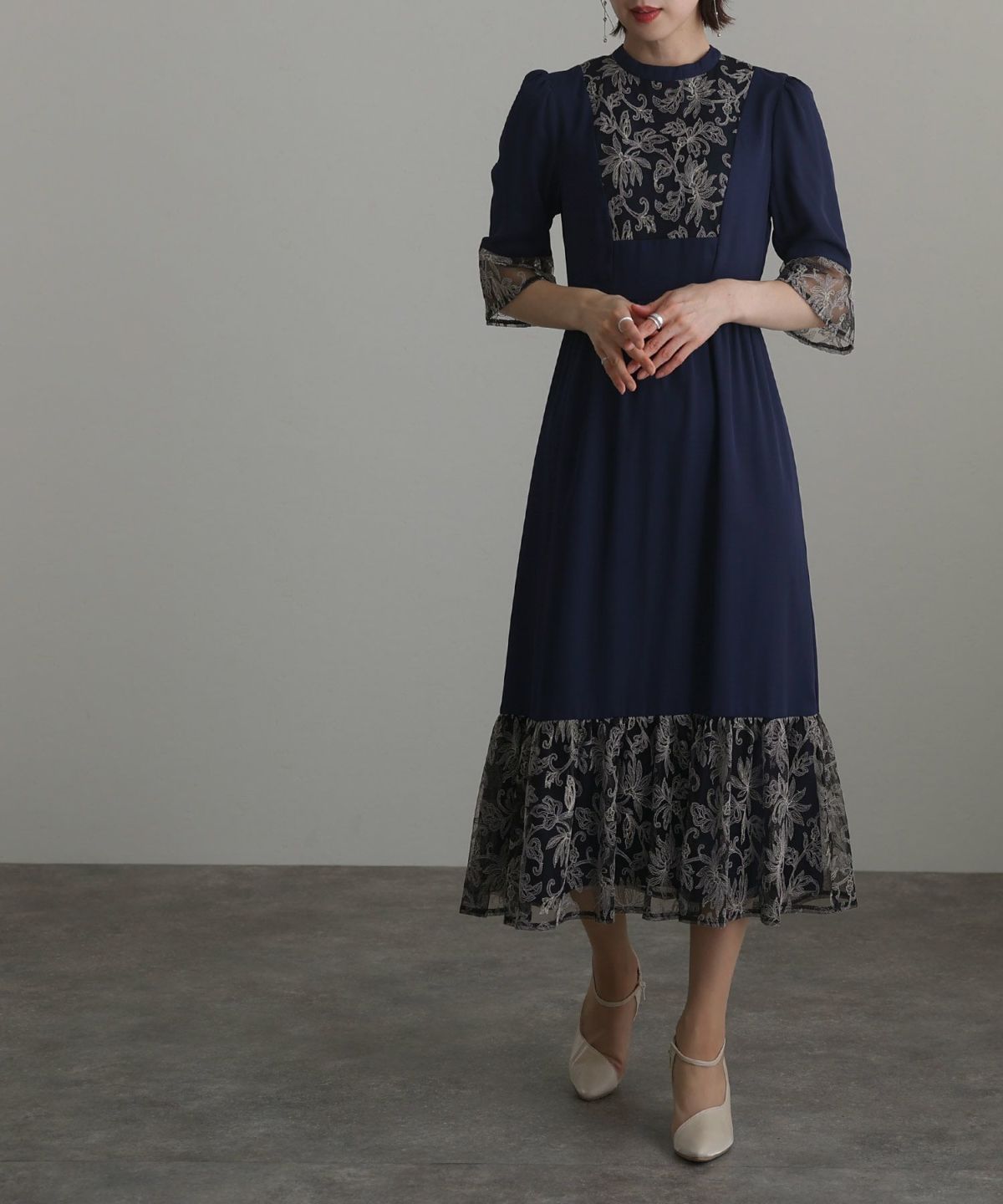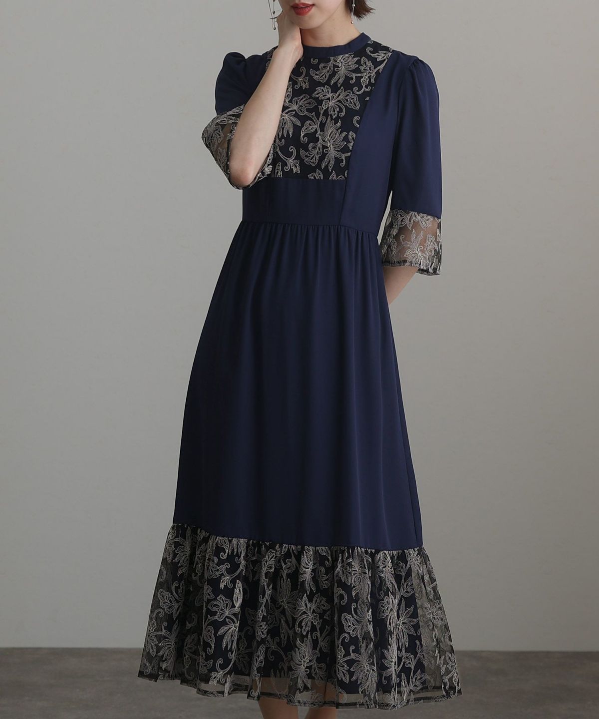レトロ調×刺繍レース ボタニカルレース切替えワンピース