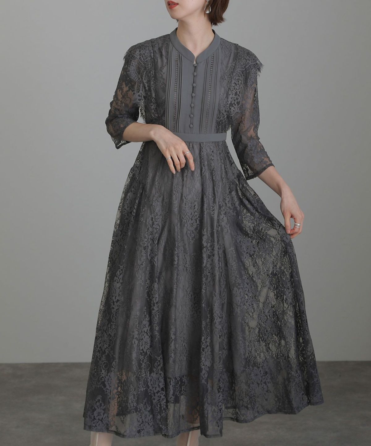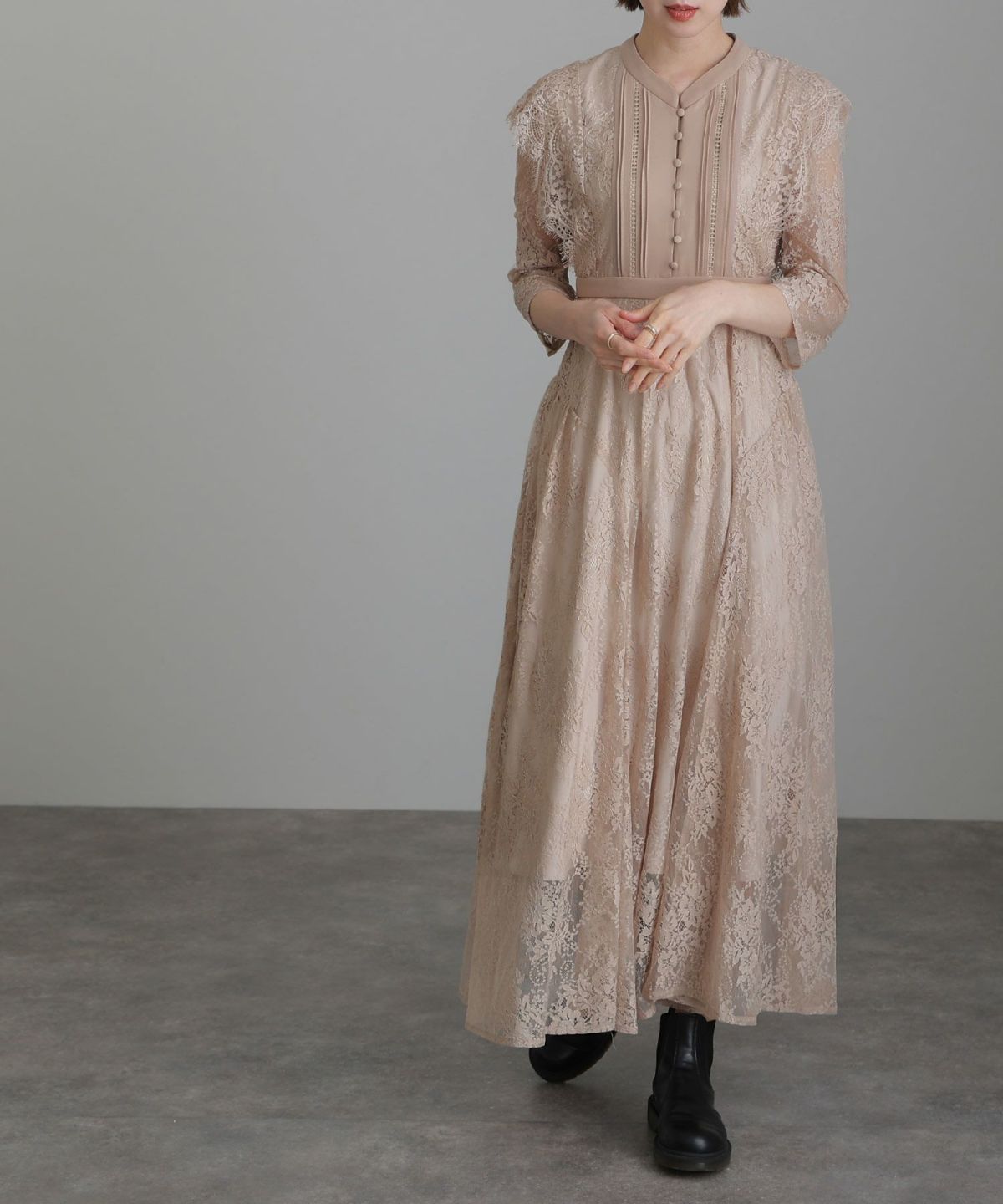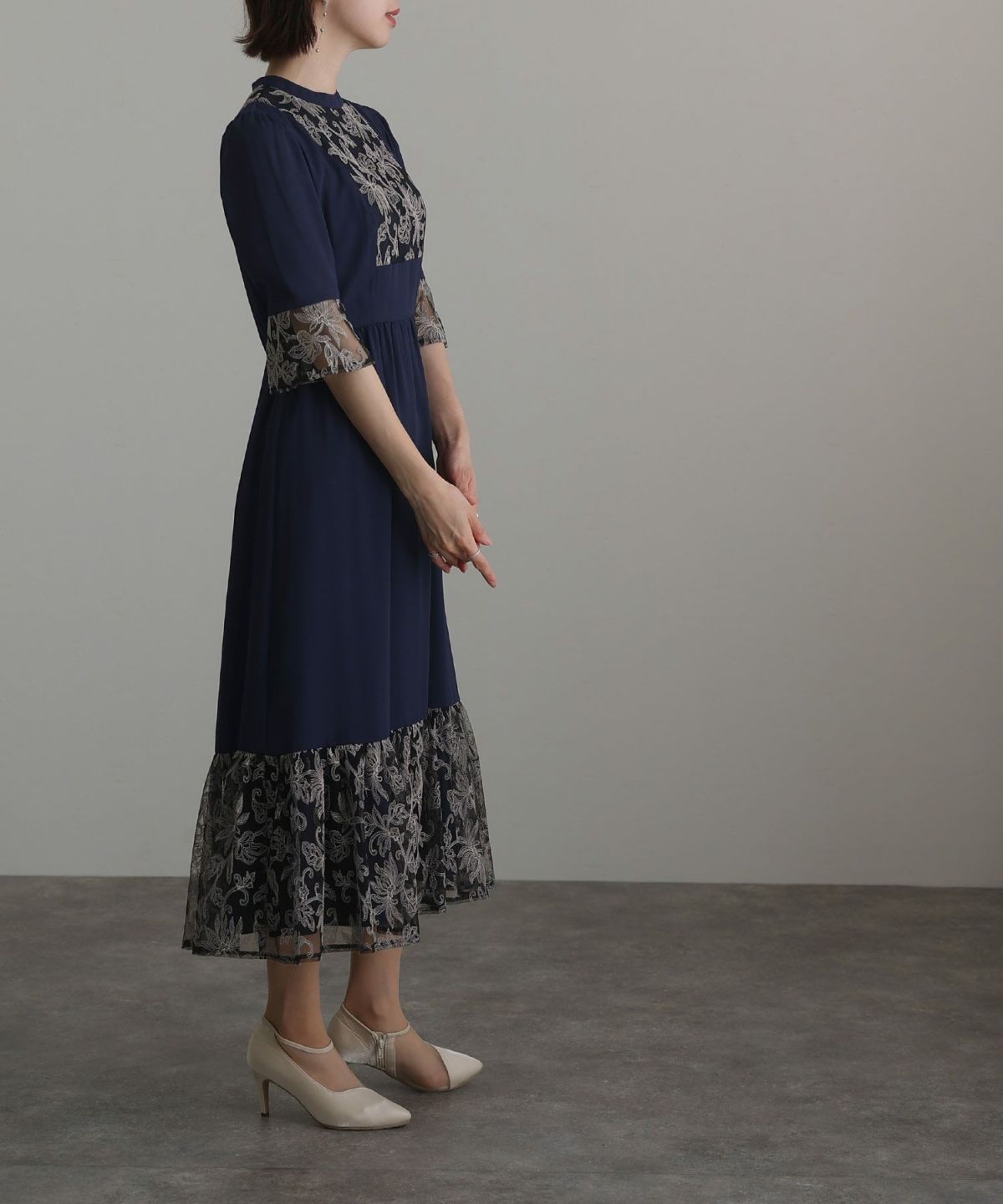 レトロ調×刺繍レース ボタニカルレース切替えワンピース