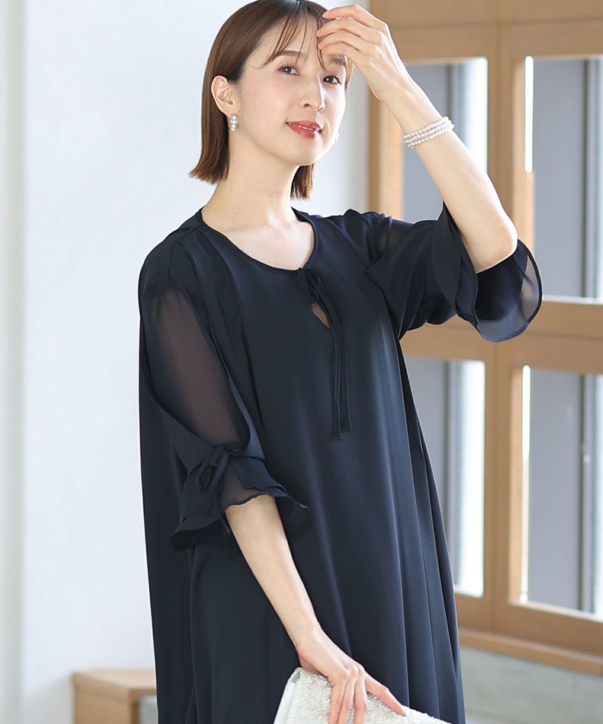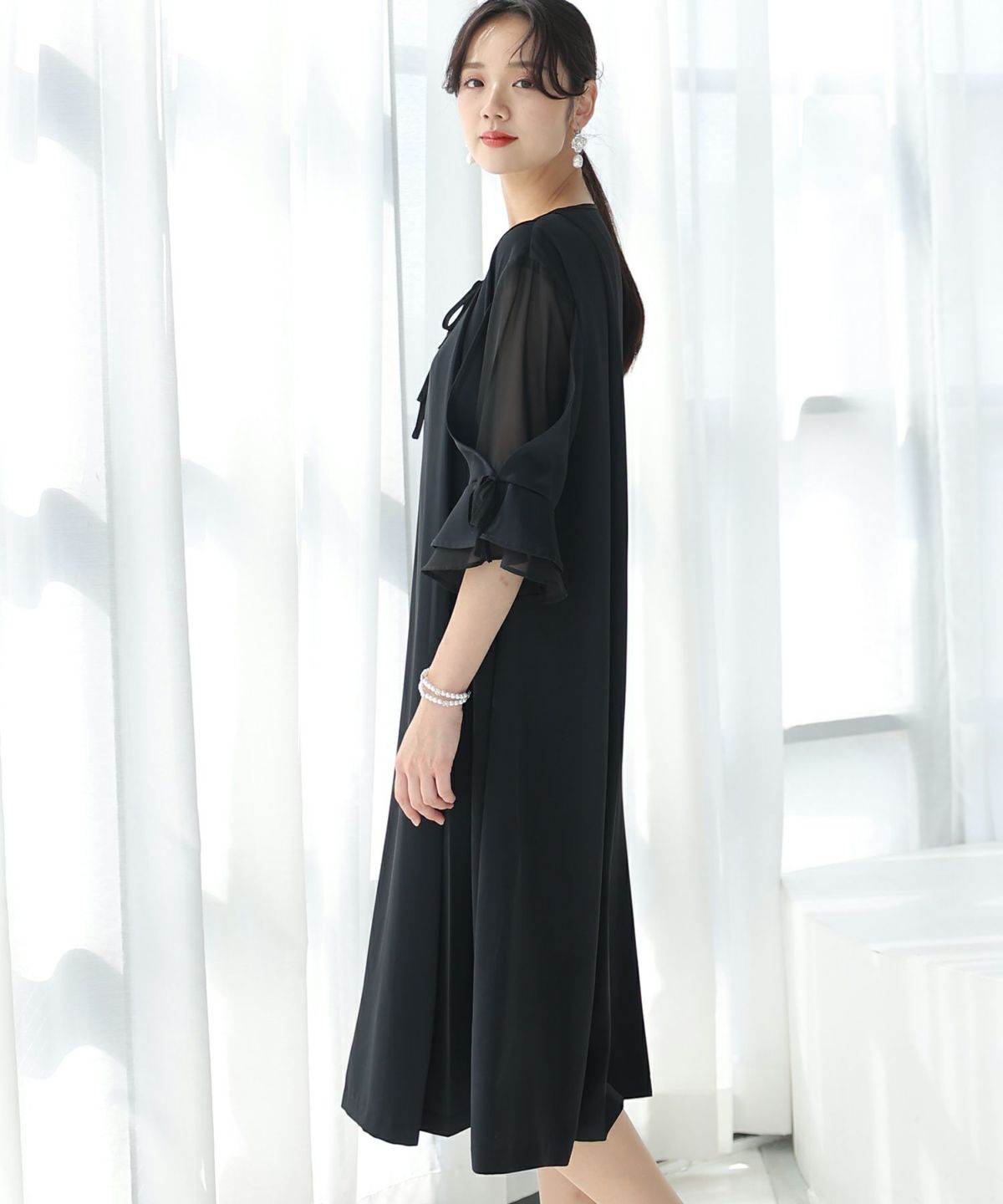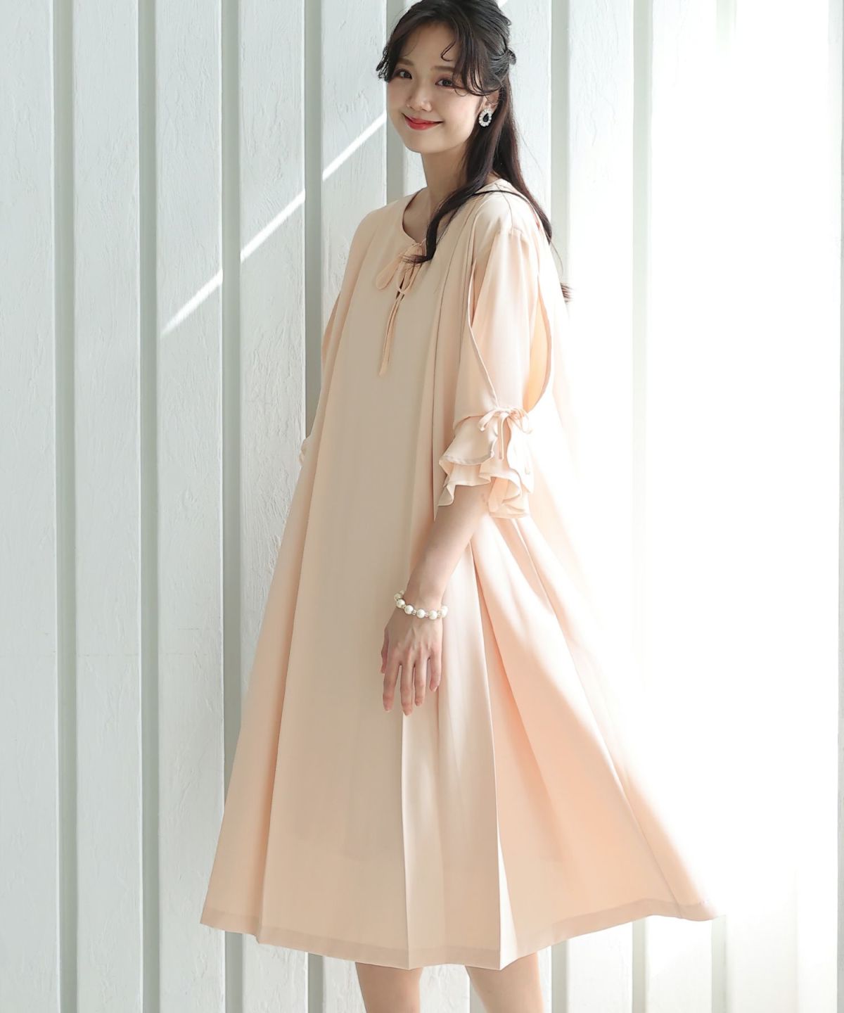 袖と胸元のリボンが大人かわいいワンピース スリーブリボンデザインワンピース