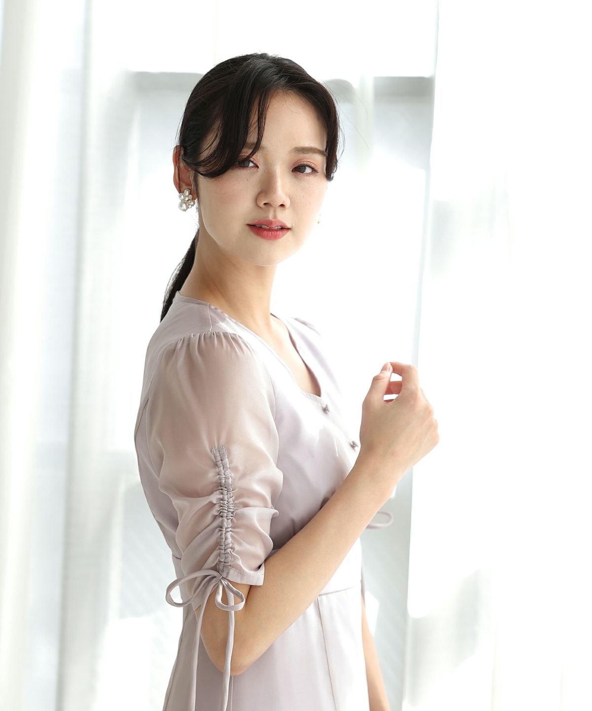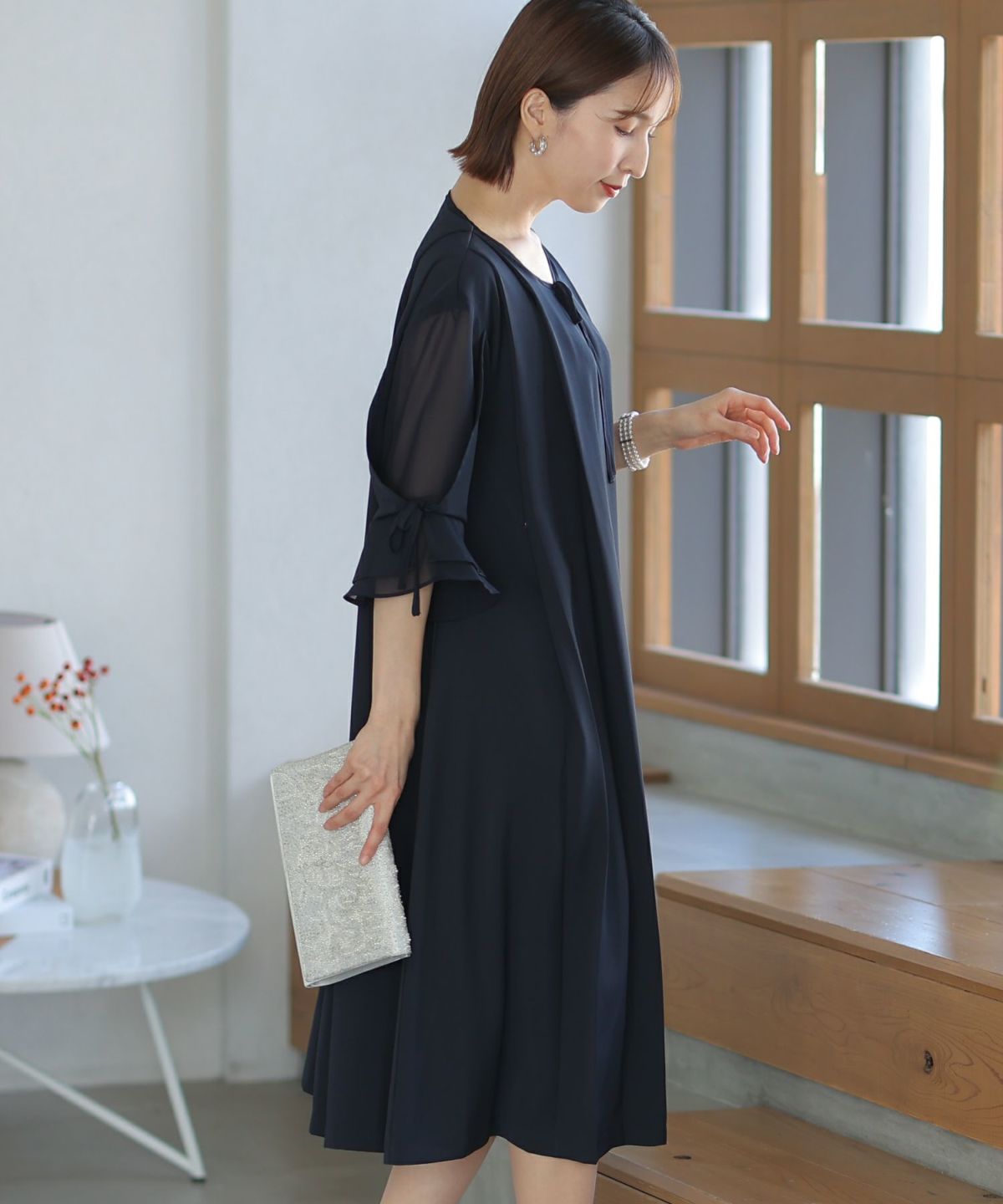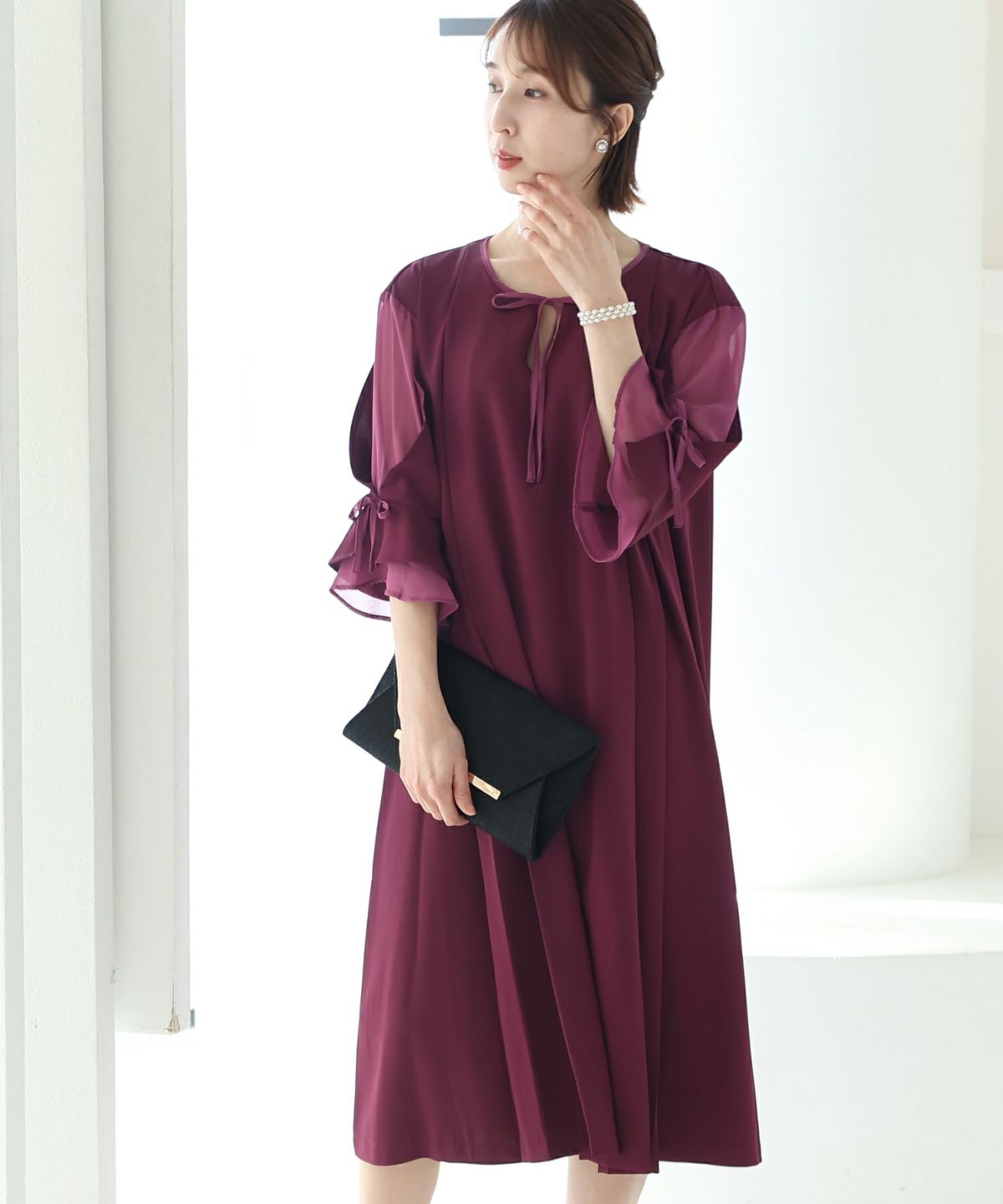 袖と胸元のリボンが大人かわいいワンピース スリーブリボンデザインワンピース
