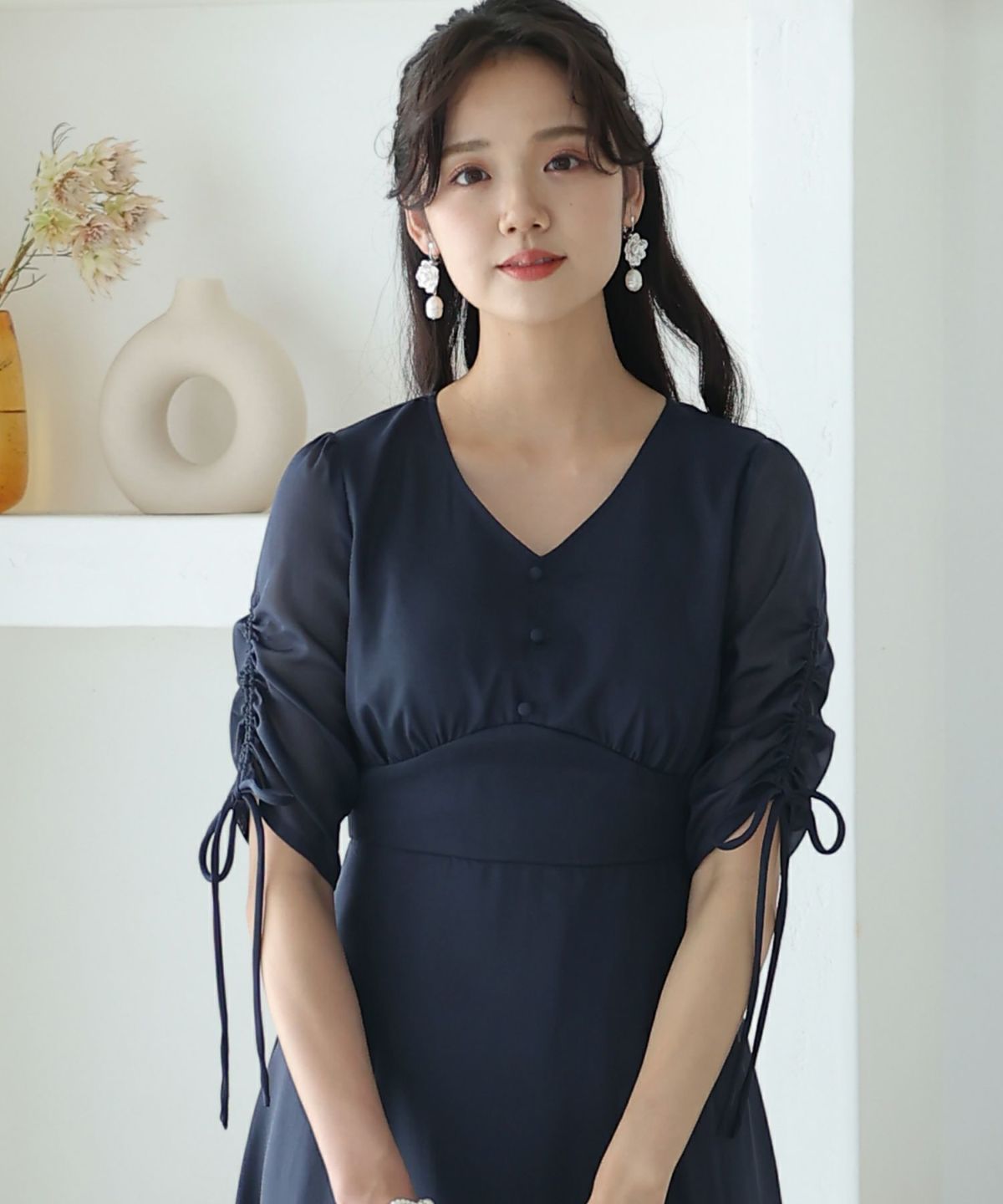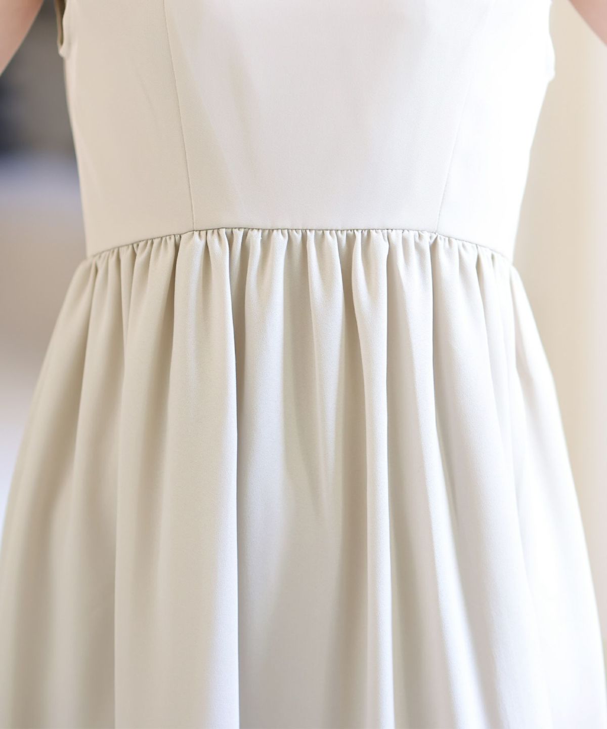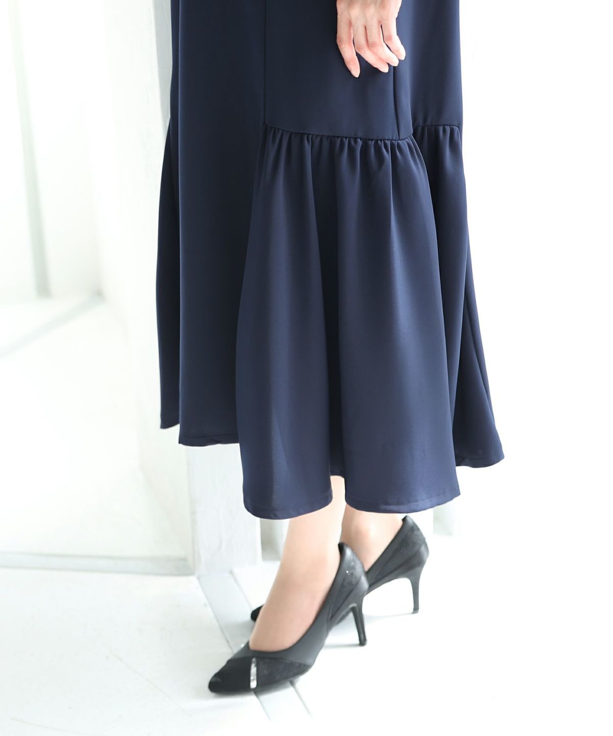 スカート裾のギャザー切り替えデザインがお洒落 フロントパールサイドギャザーワンピース