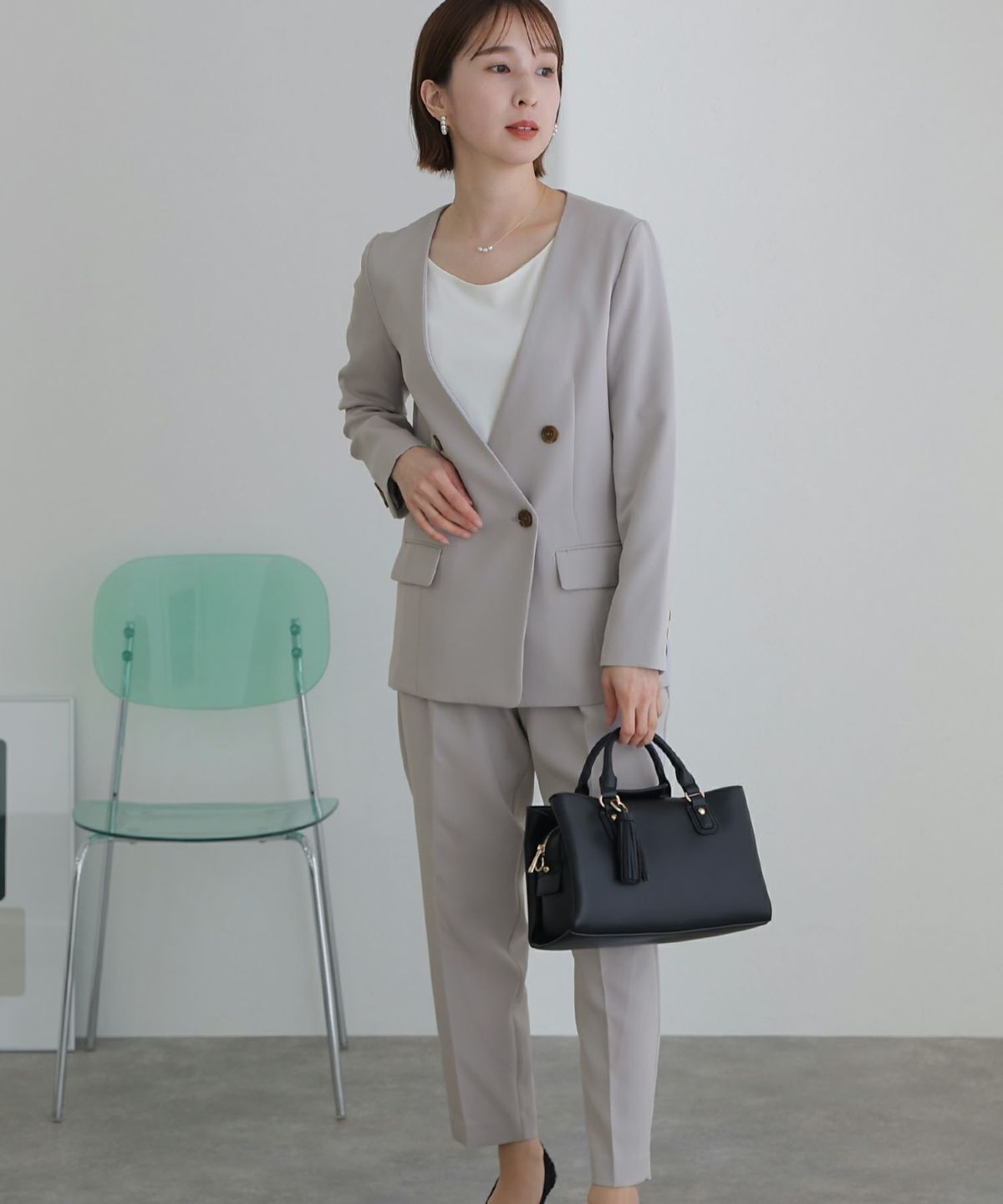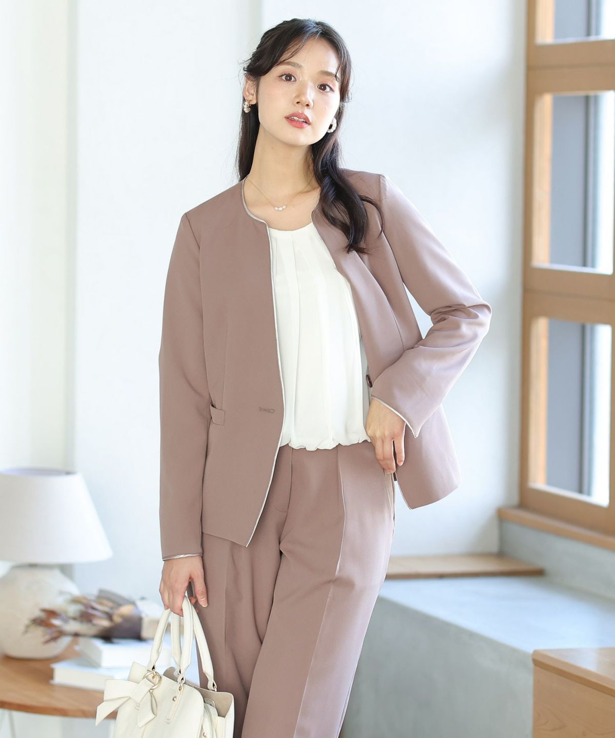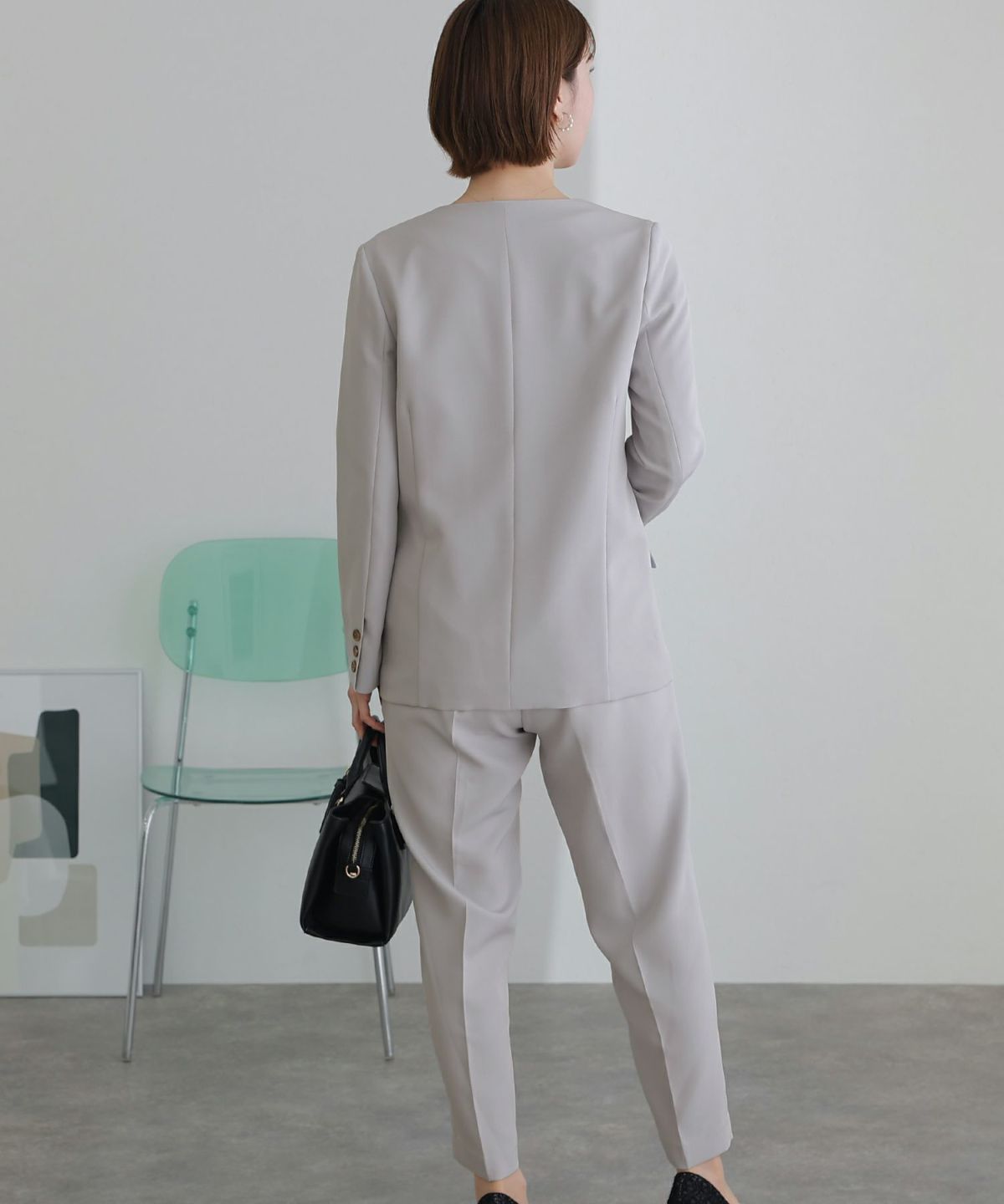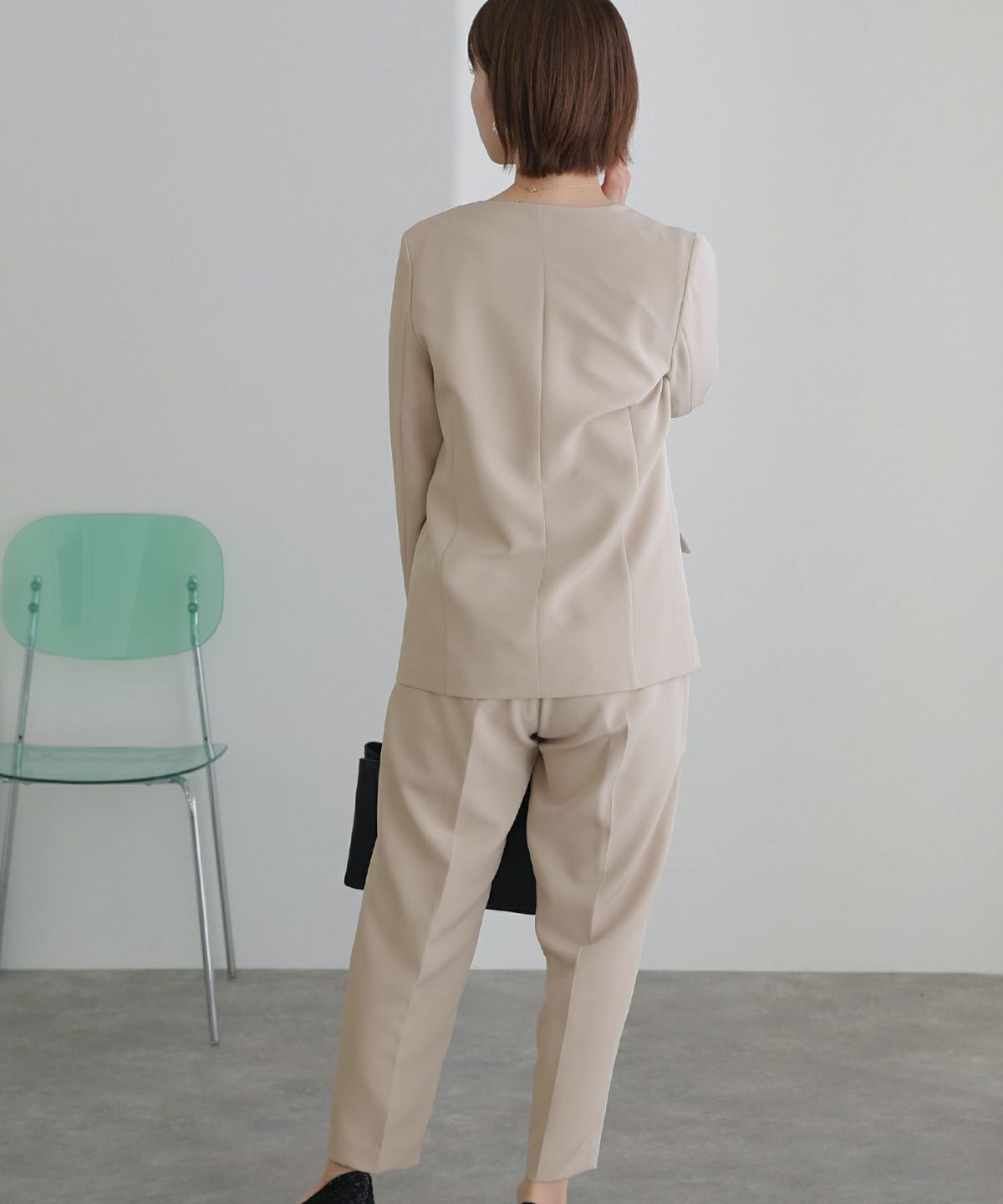 ノーカラーデザインでこなれた雰囲気に ノーカラーテントラインジャケットパンツセット