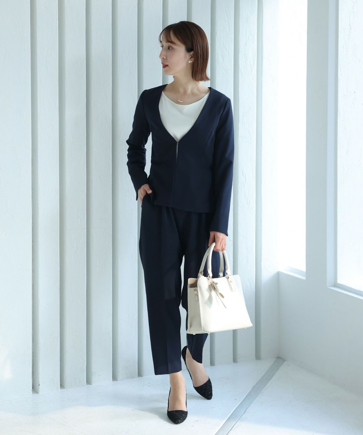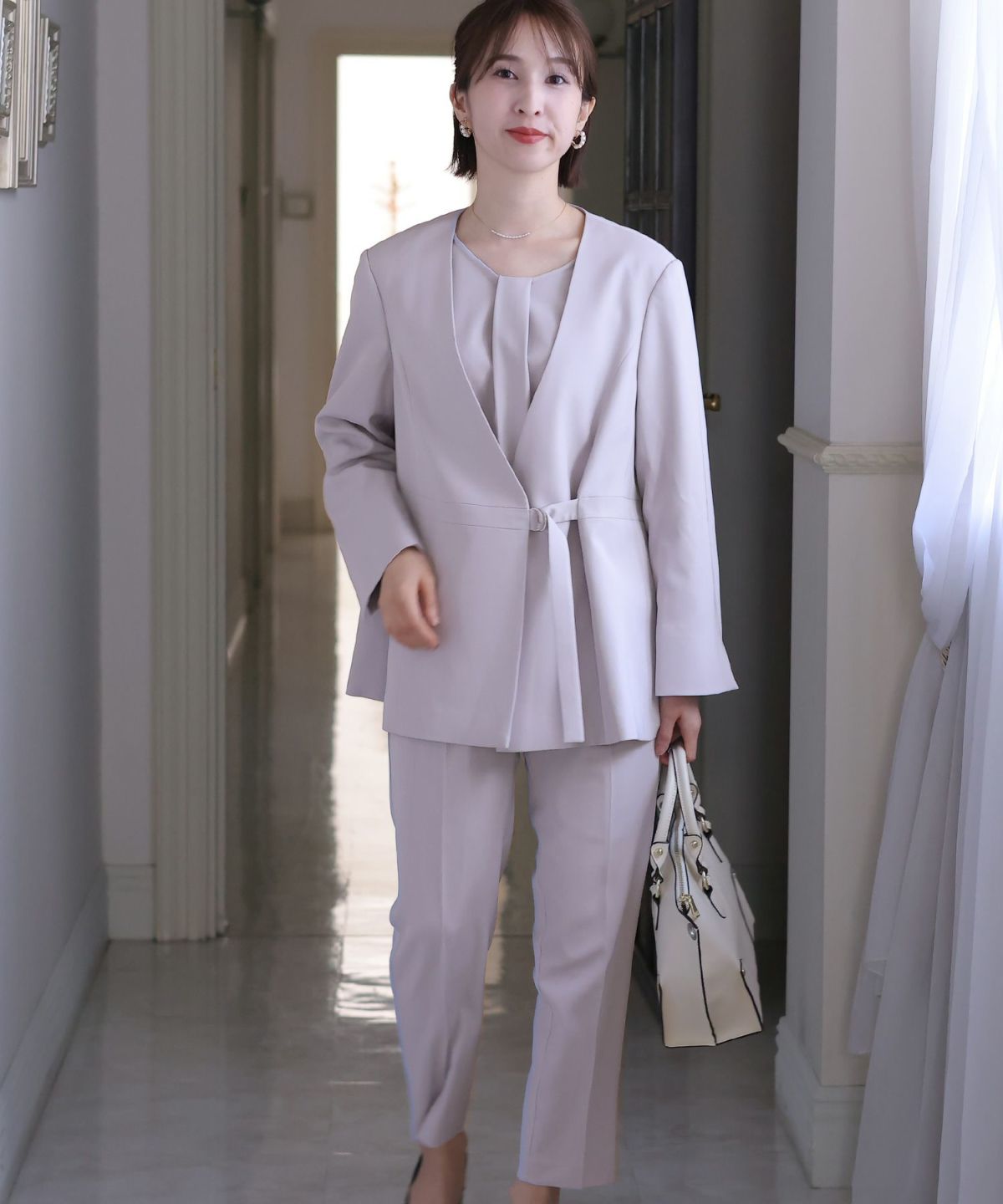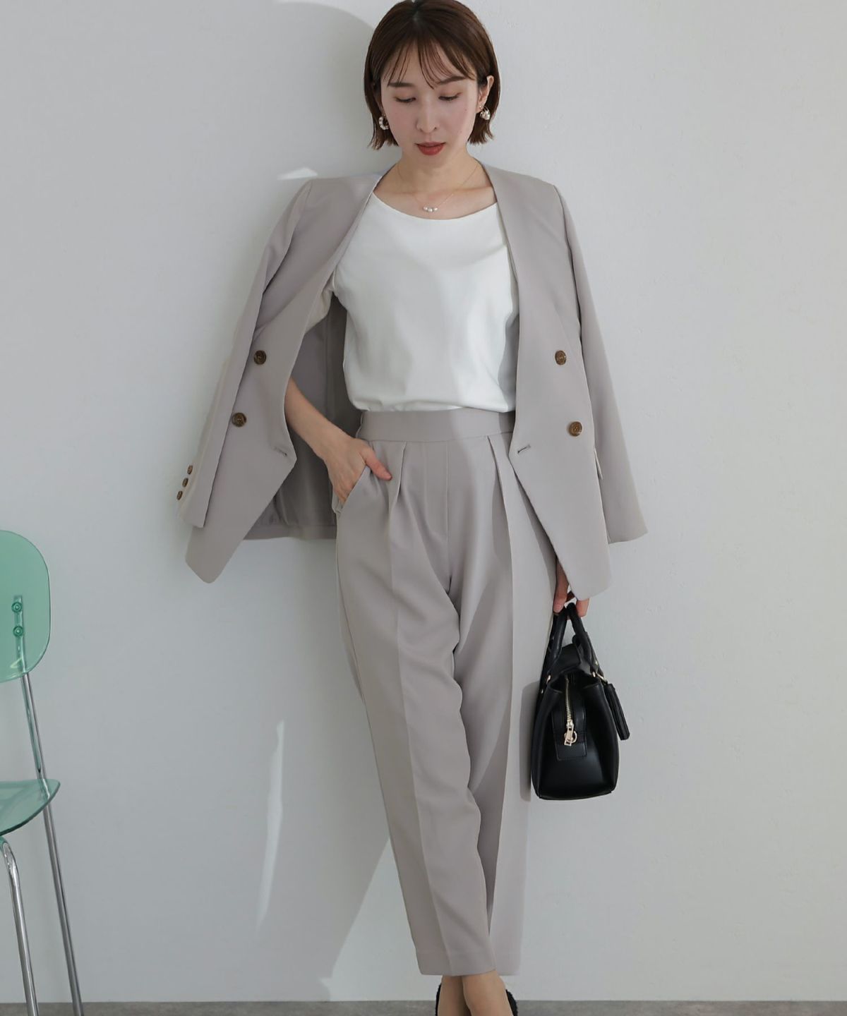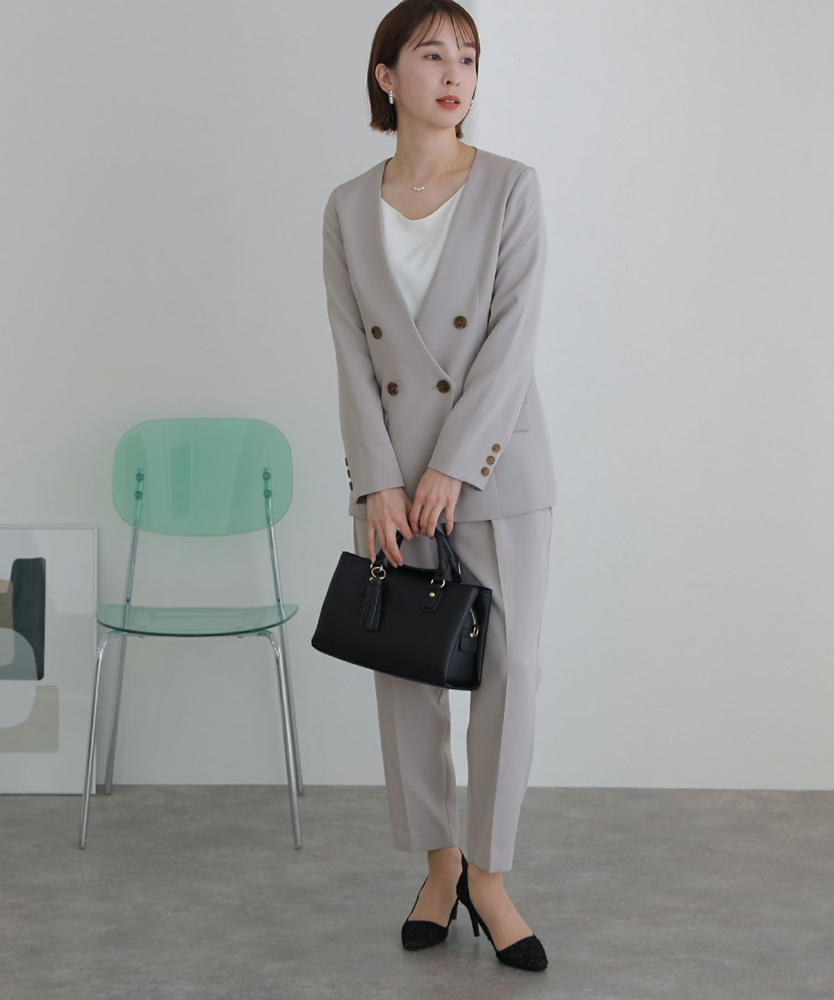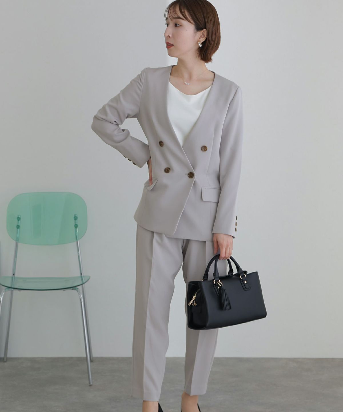ノーカラーデザインでこなれた雰囲気に ノーカラーテントラインジャケットパンツセット