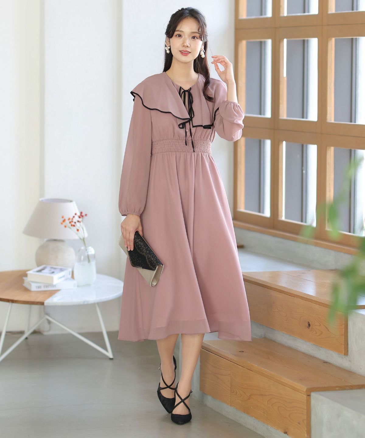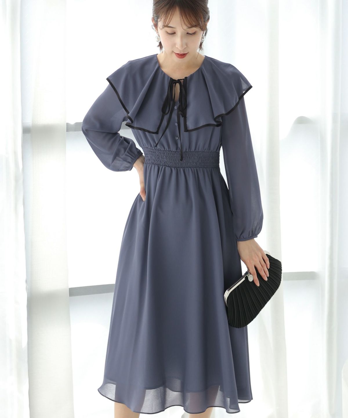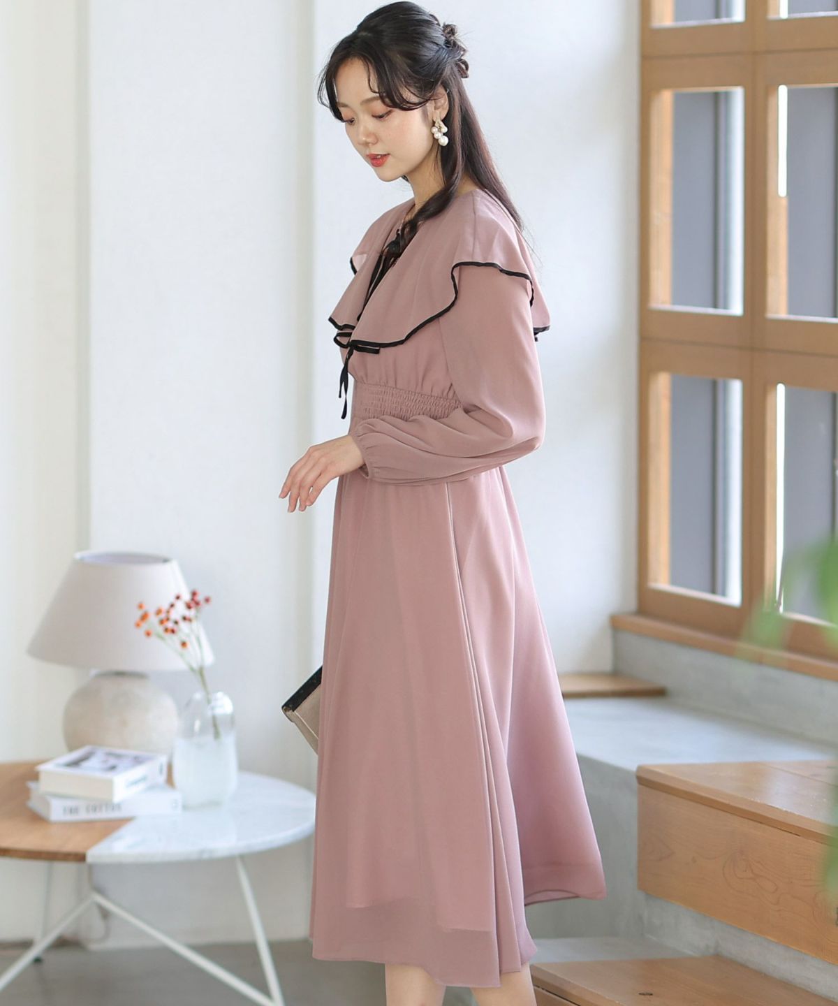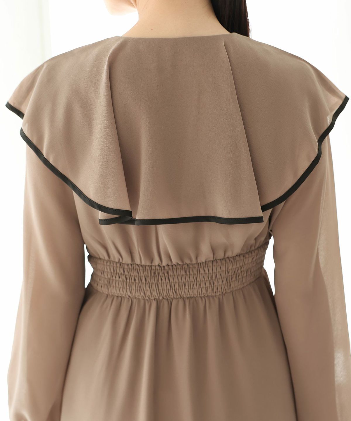 シンプルなデザインとトレンドのくすみカラーがおしゃれ パイピングビッグカラーワンピース