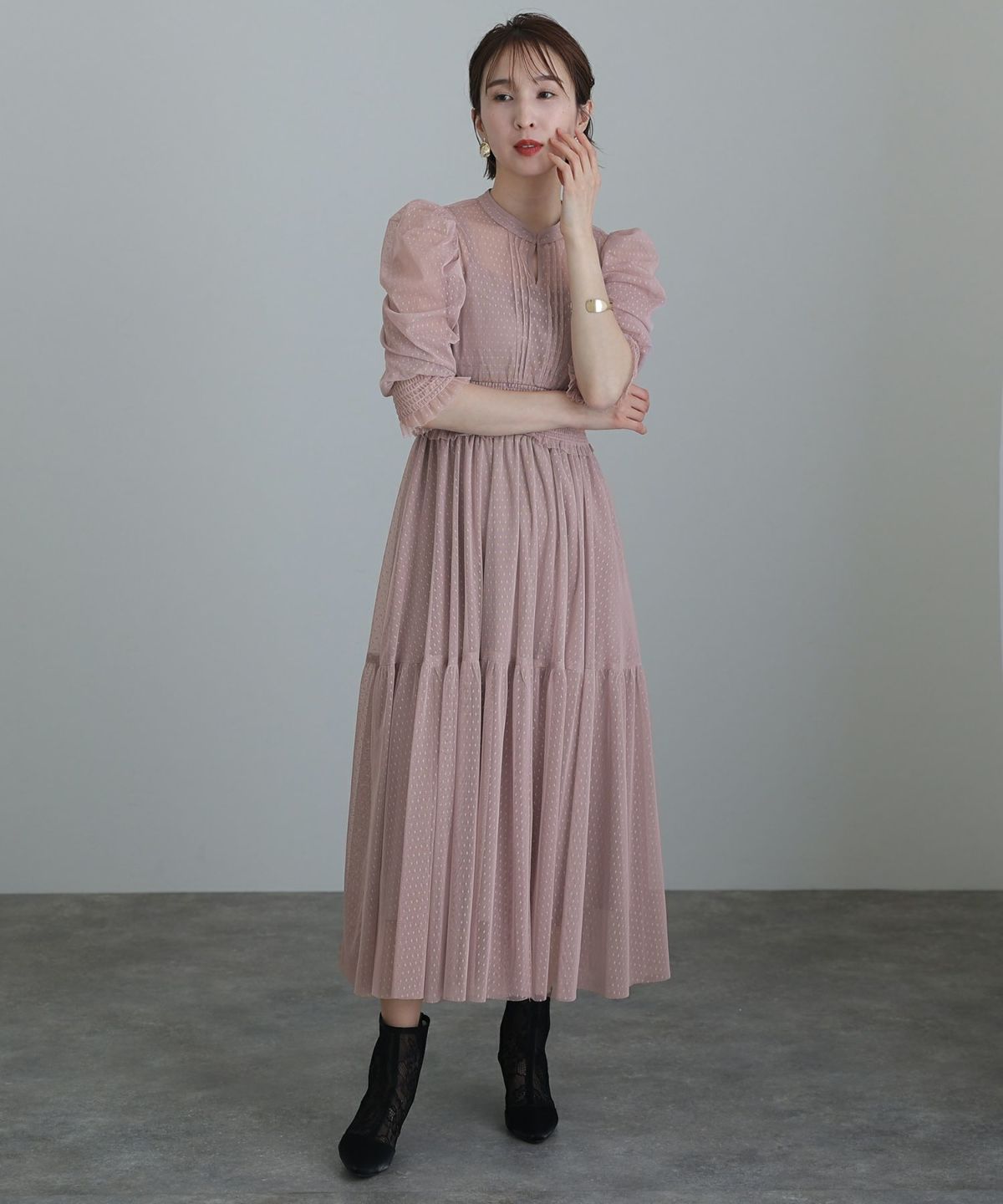 ワンティアードデザインがかわいい ボリュームスリーブドットワンピース