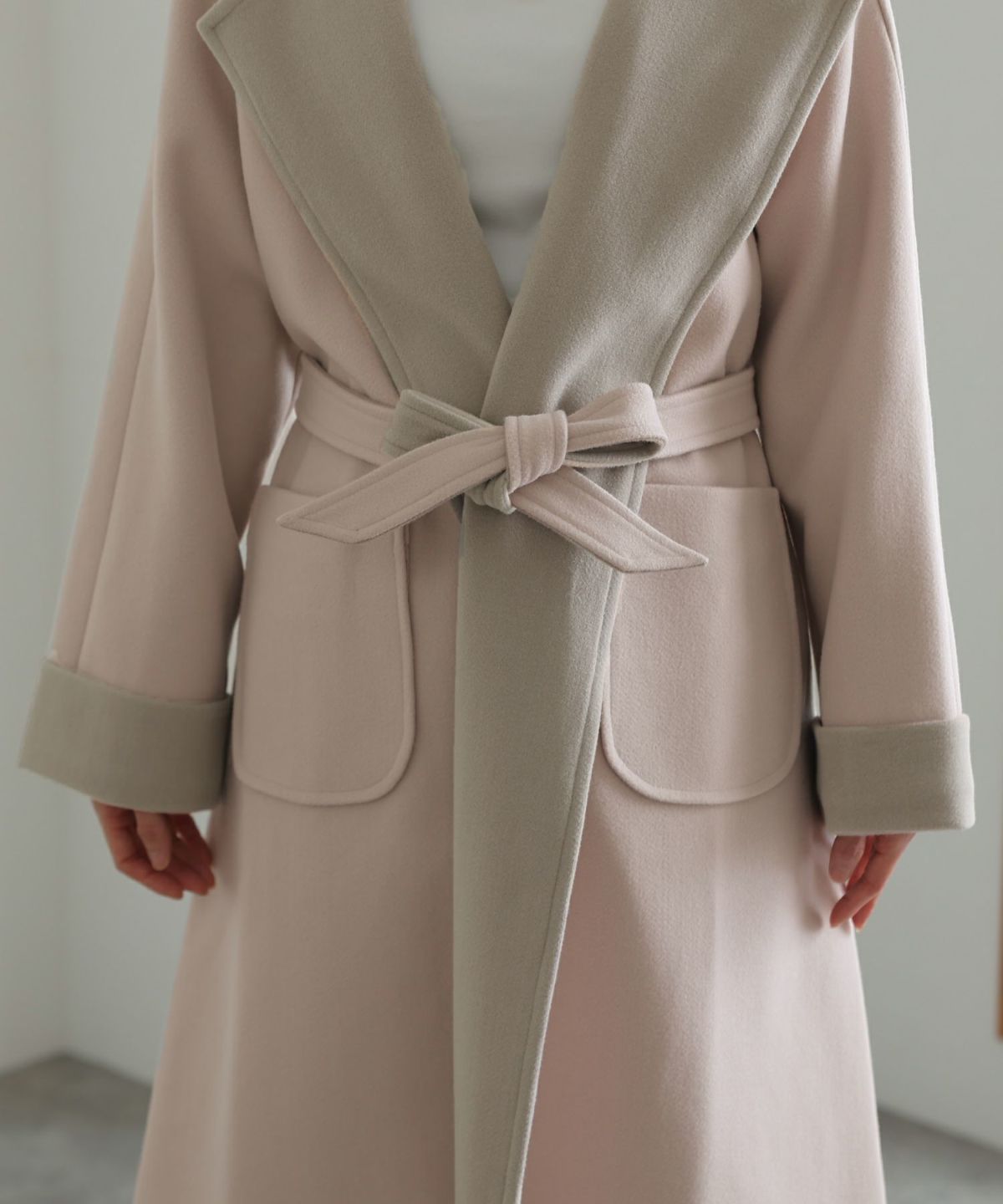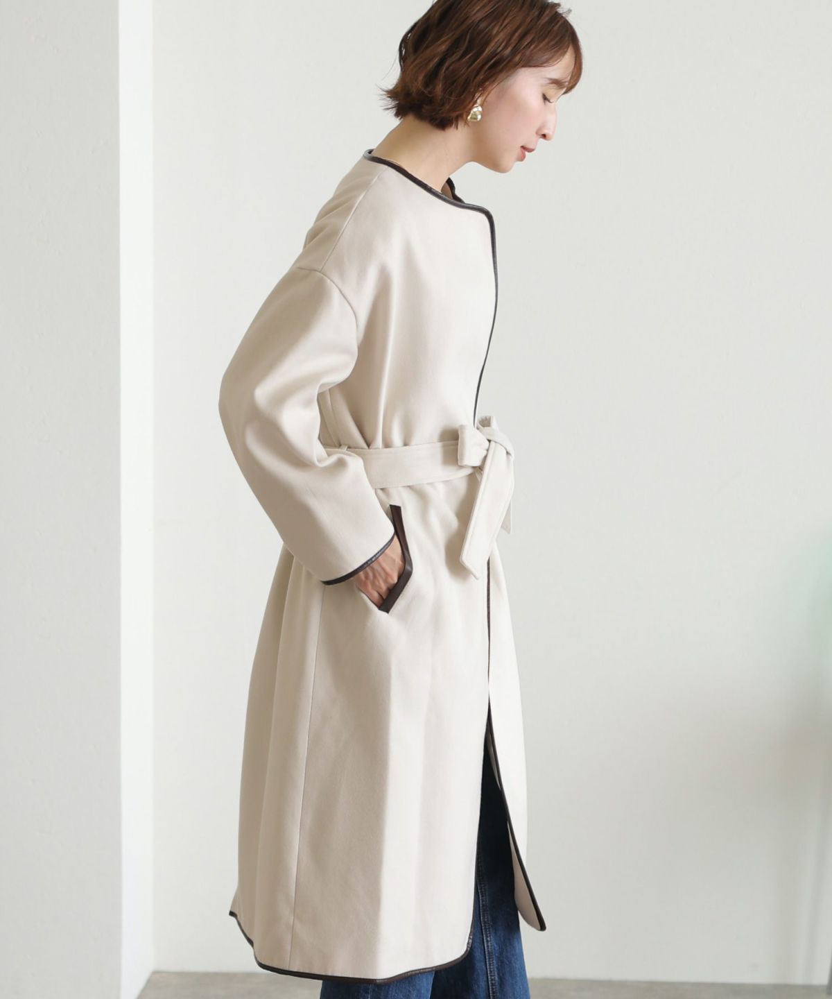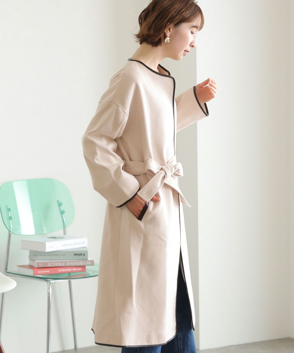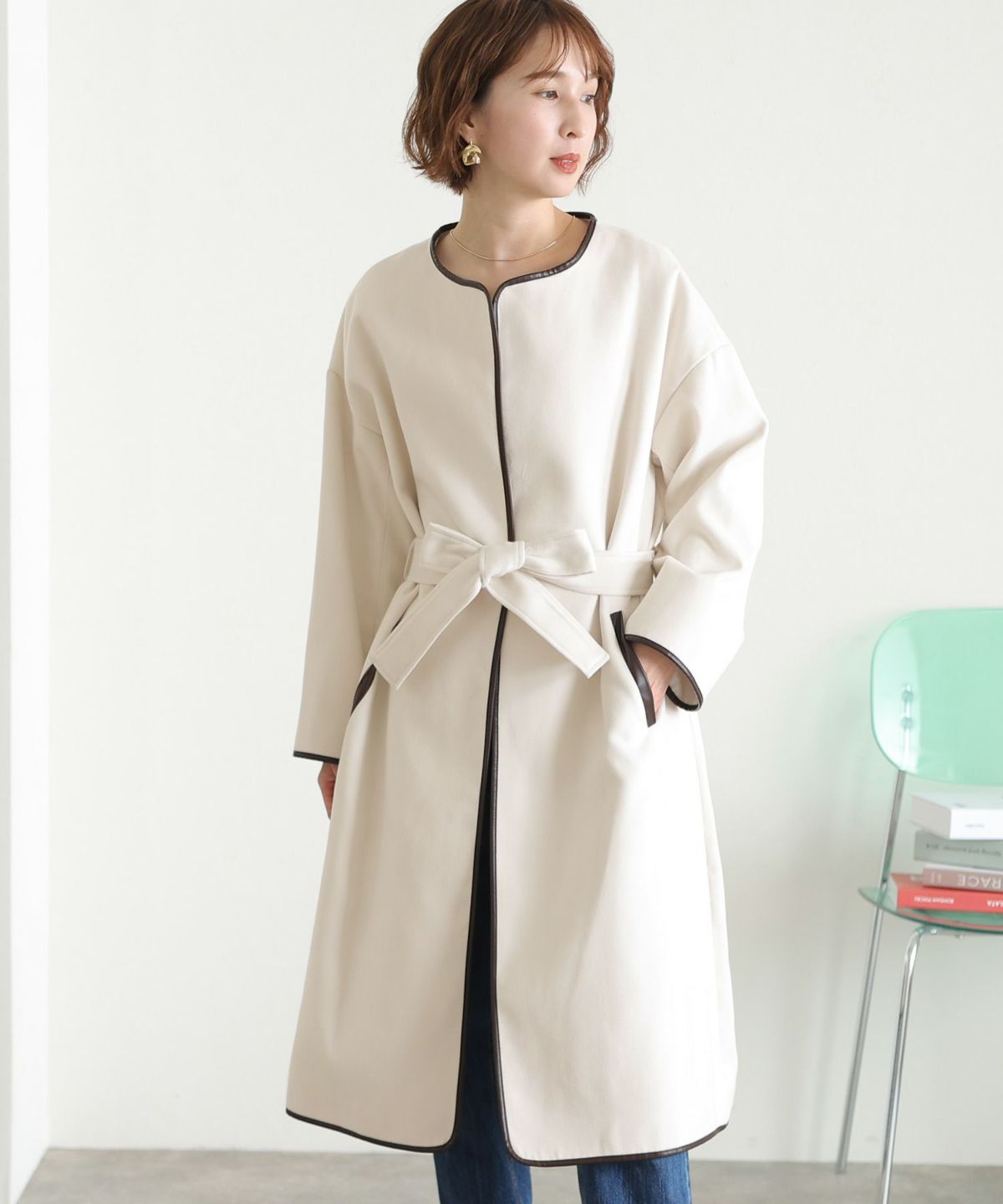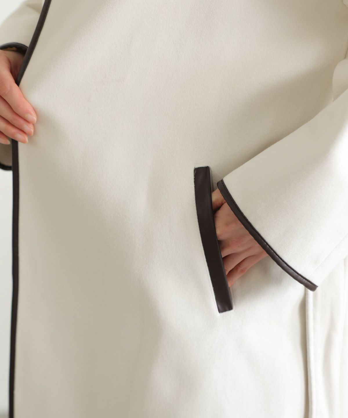 襟と袖の配色がこだわりのラップコート 衿配色ラップコート