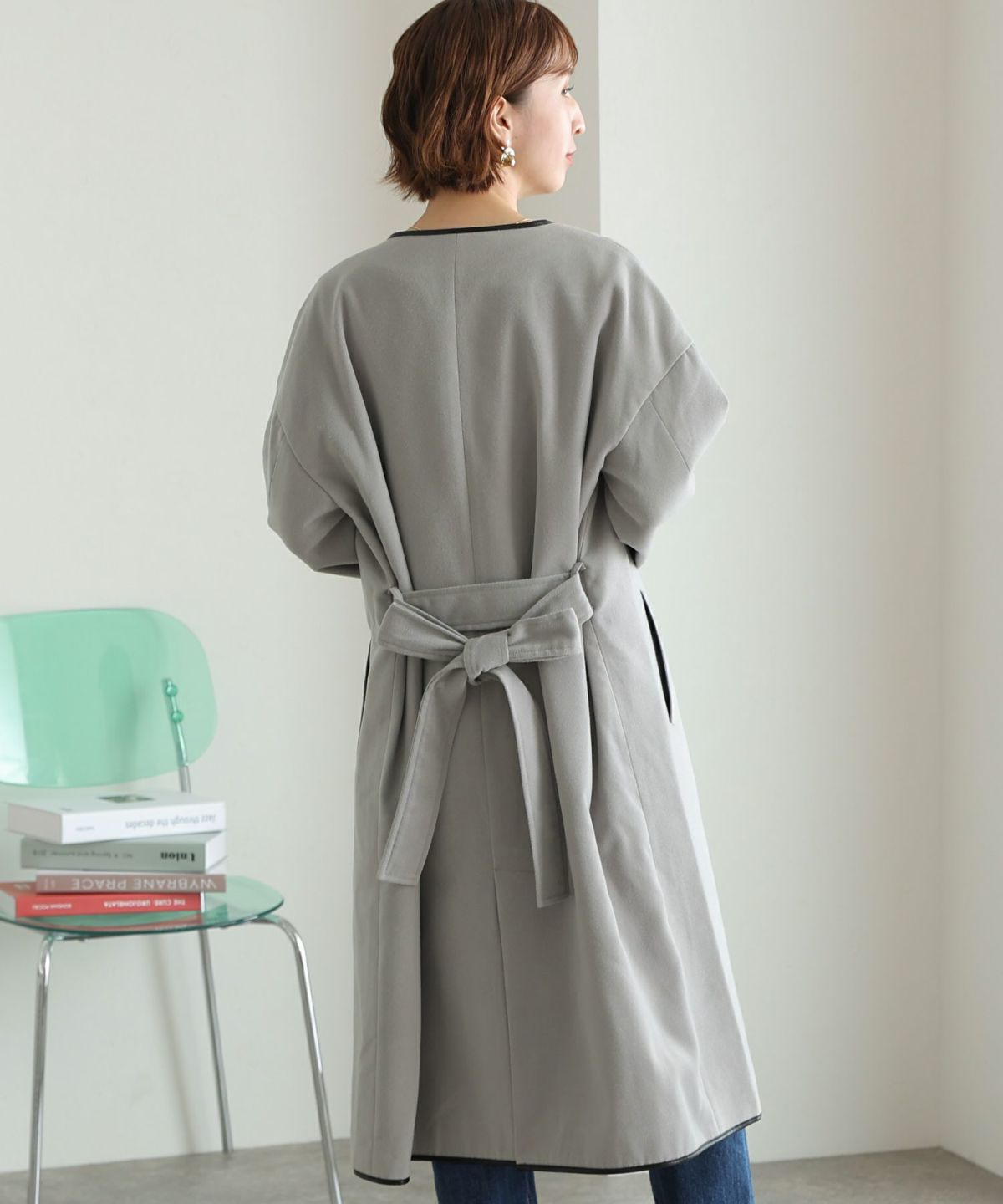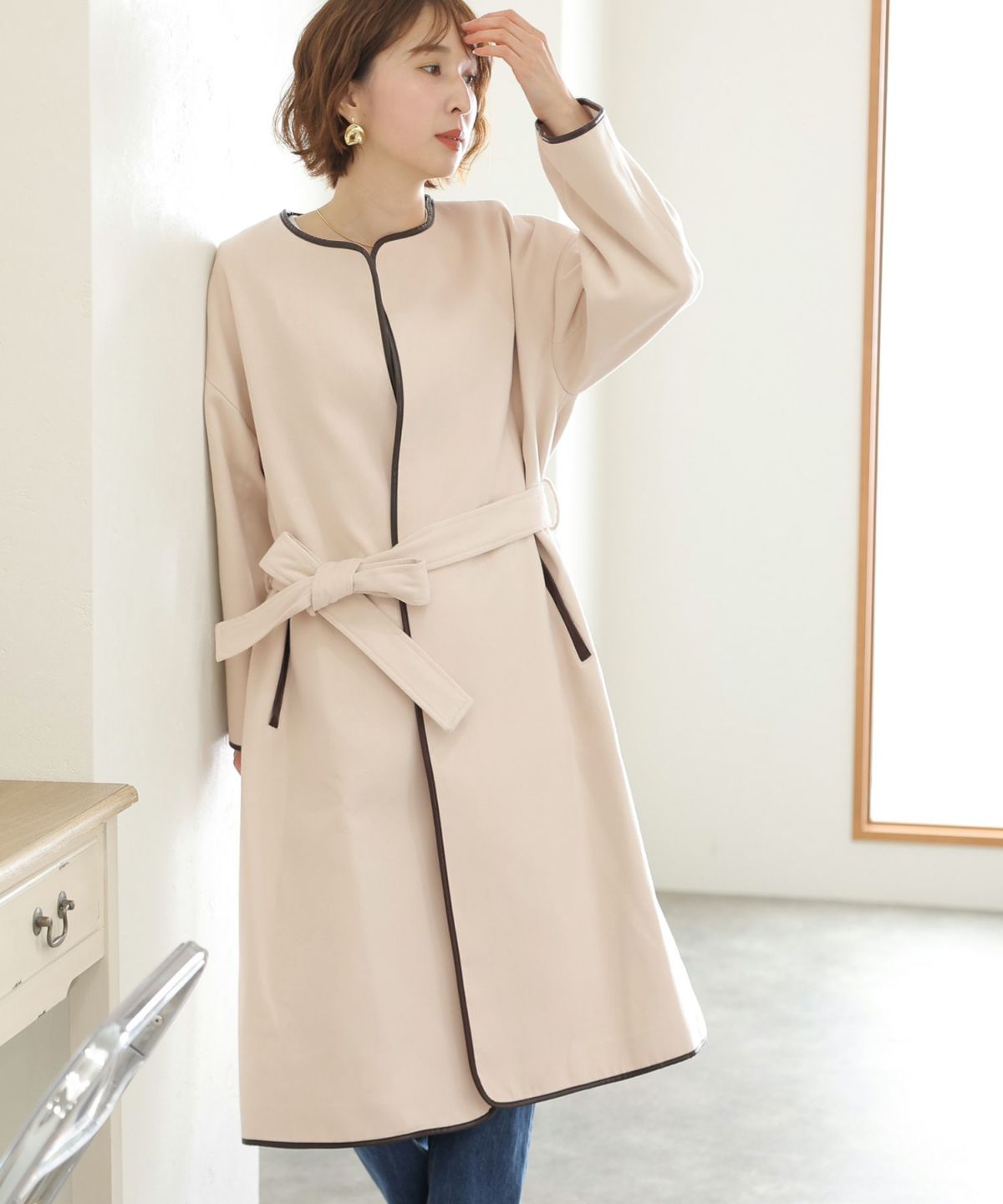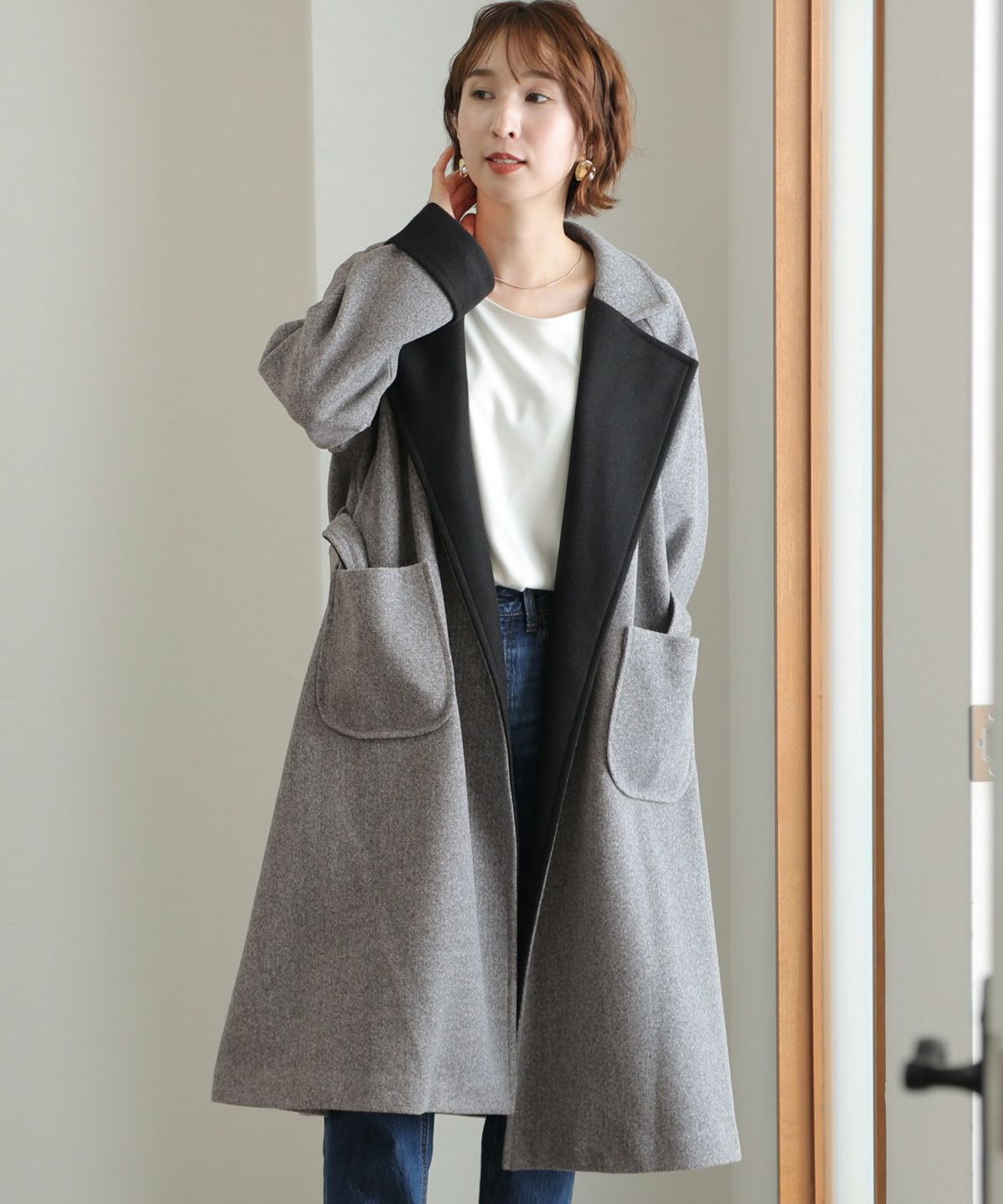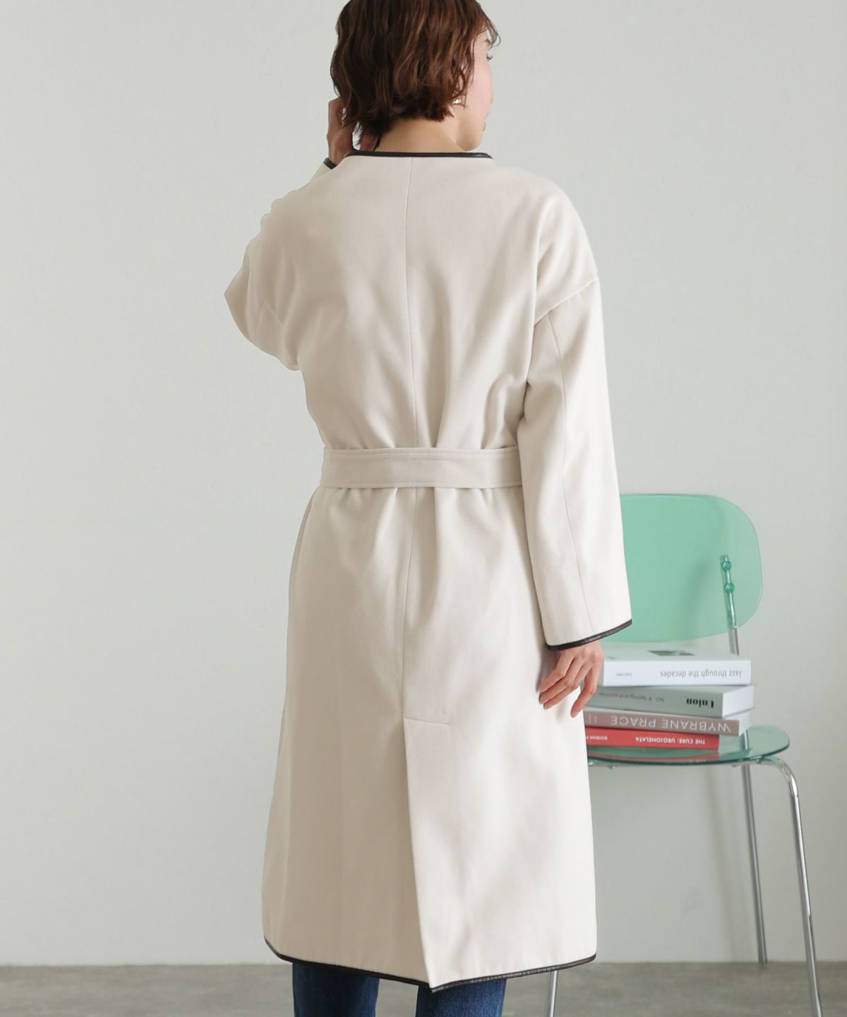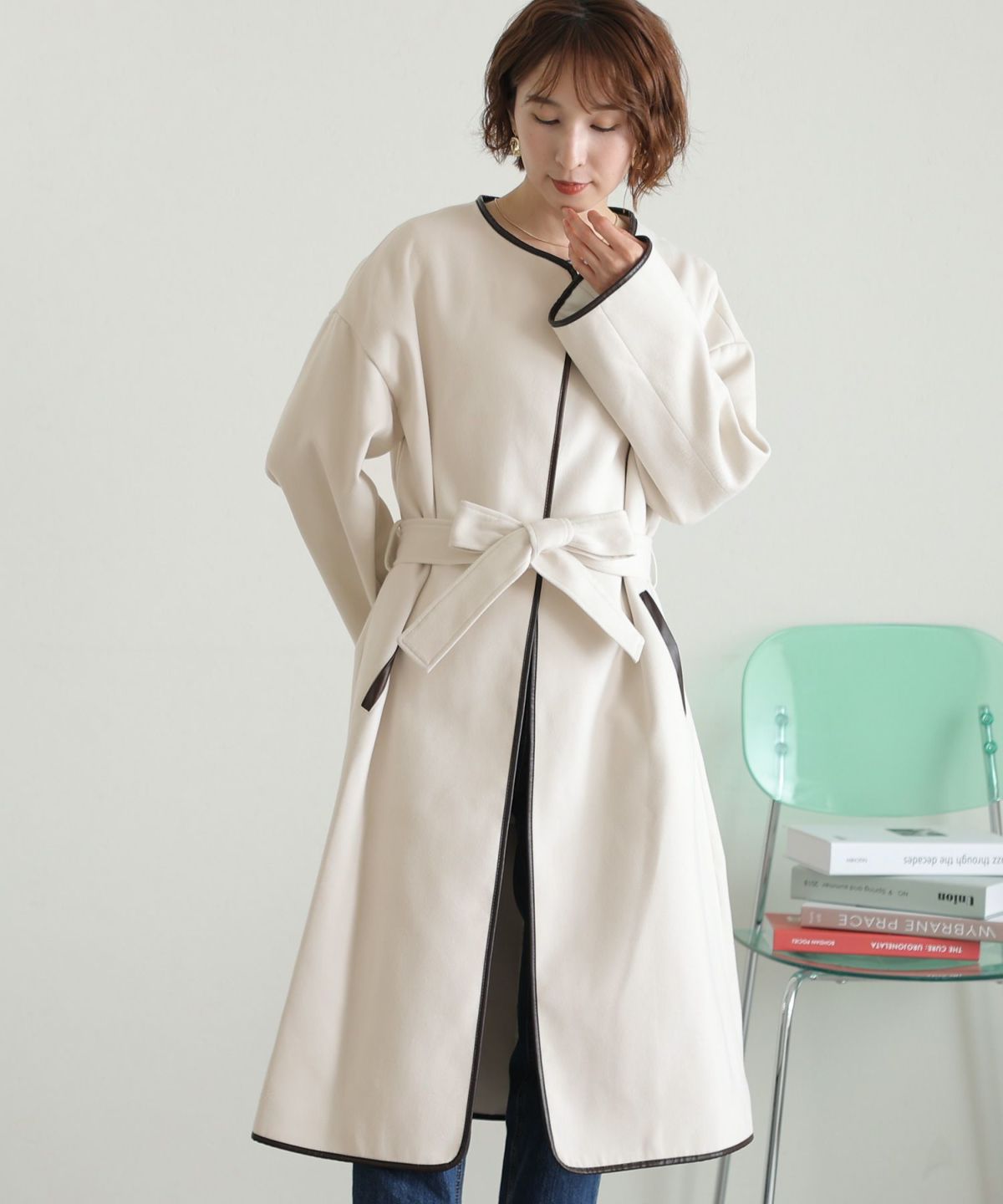 襟と袖の配色がこだわりのラップコート 衿配色ラップコート