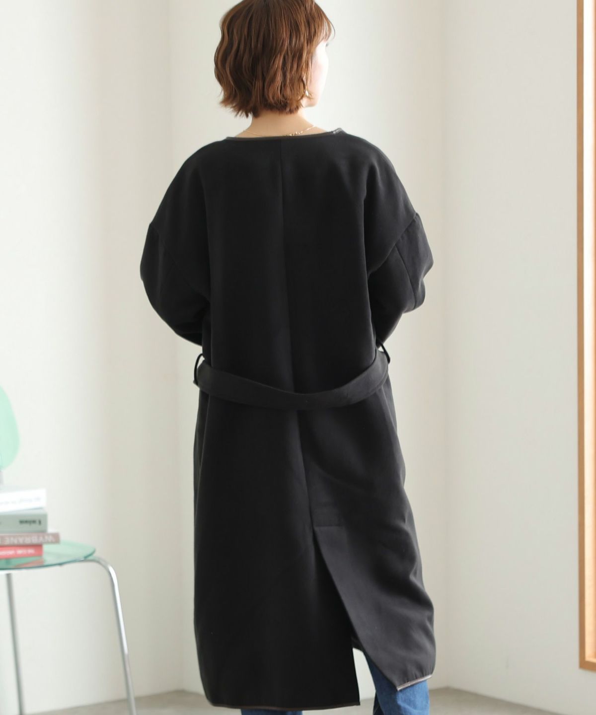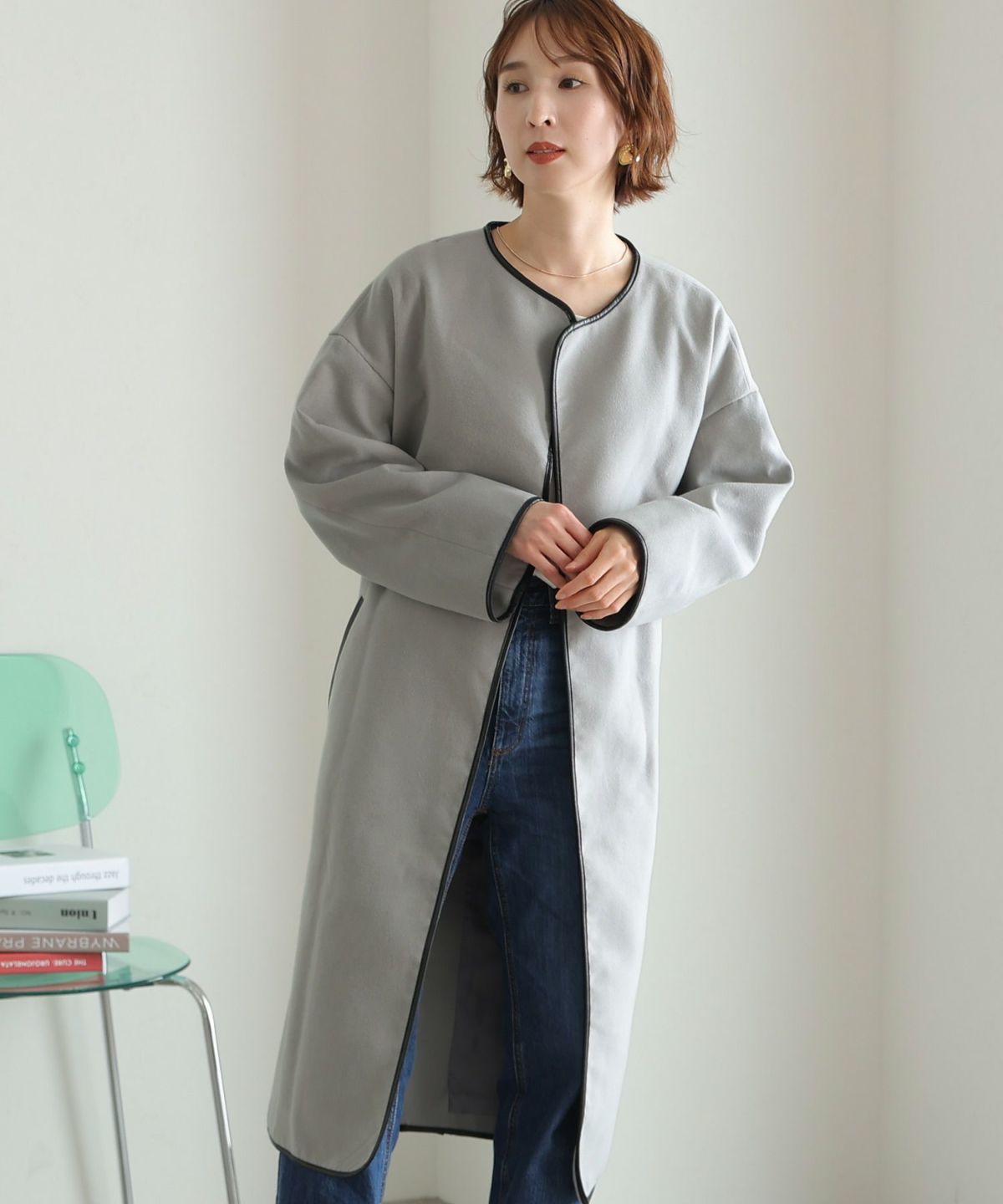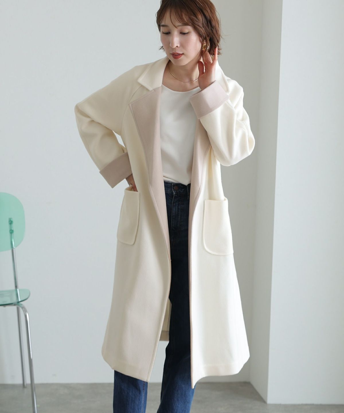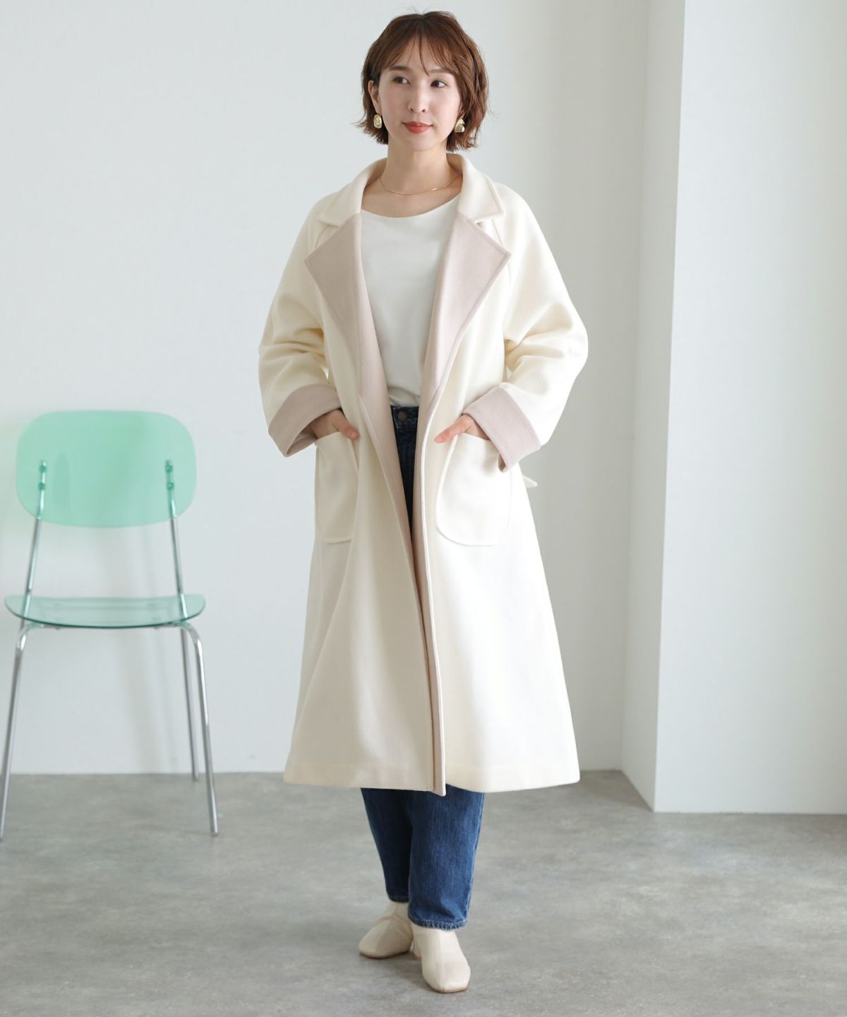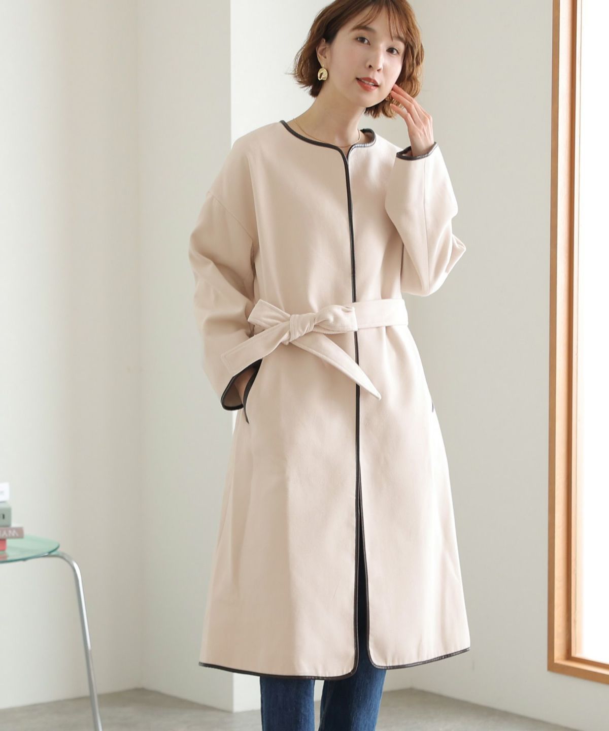 襟と袖の配色がこだわりのラップコート 衿配色ラップコート
