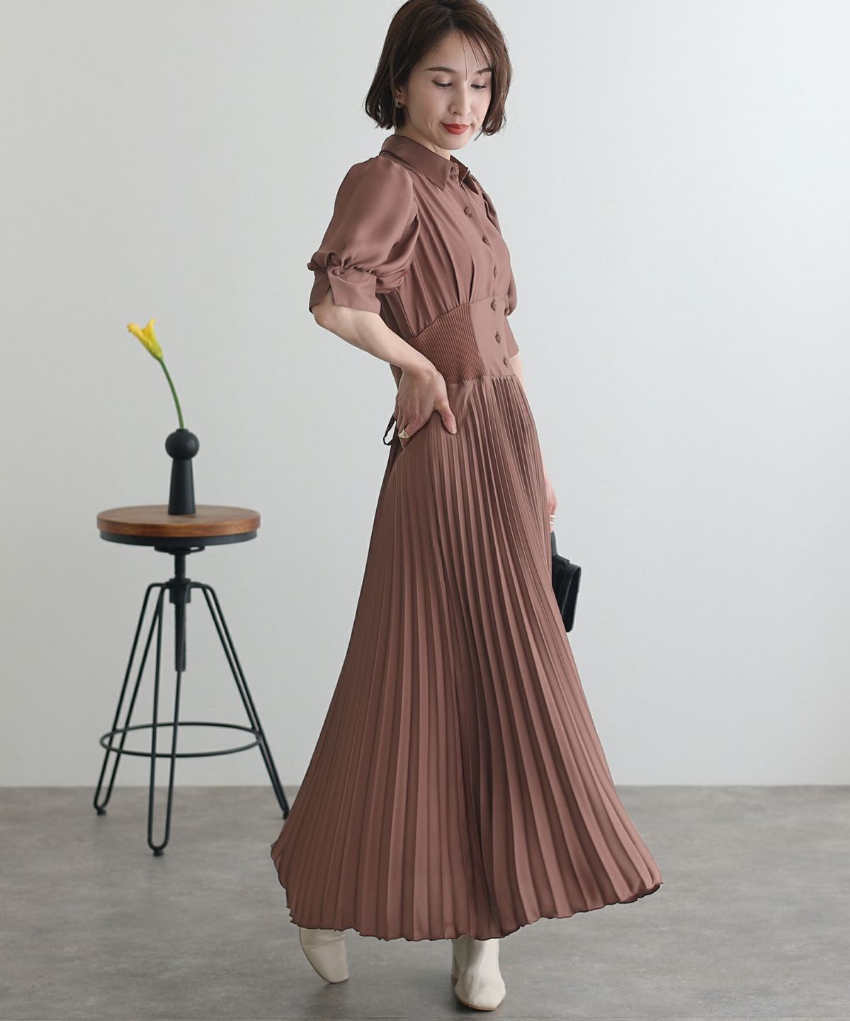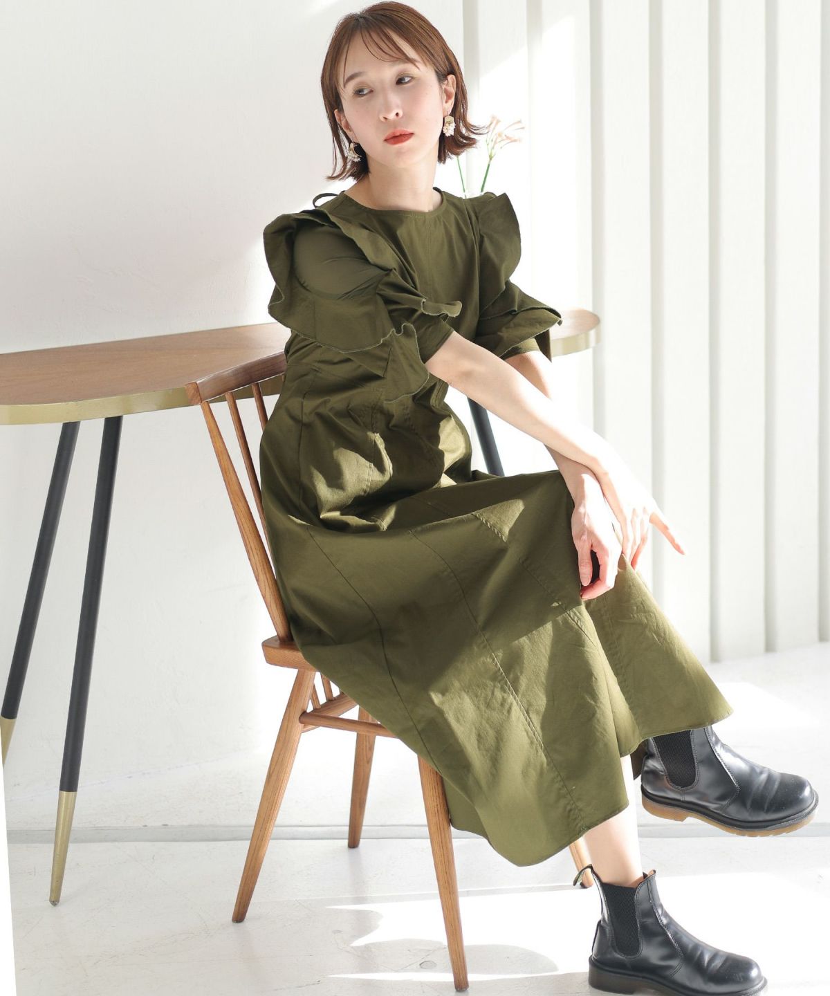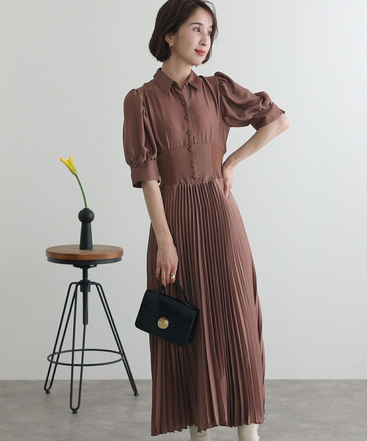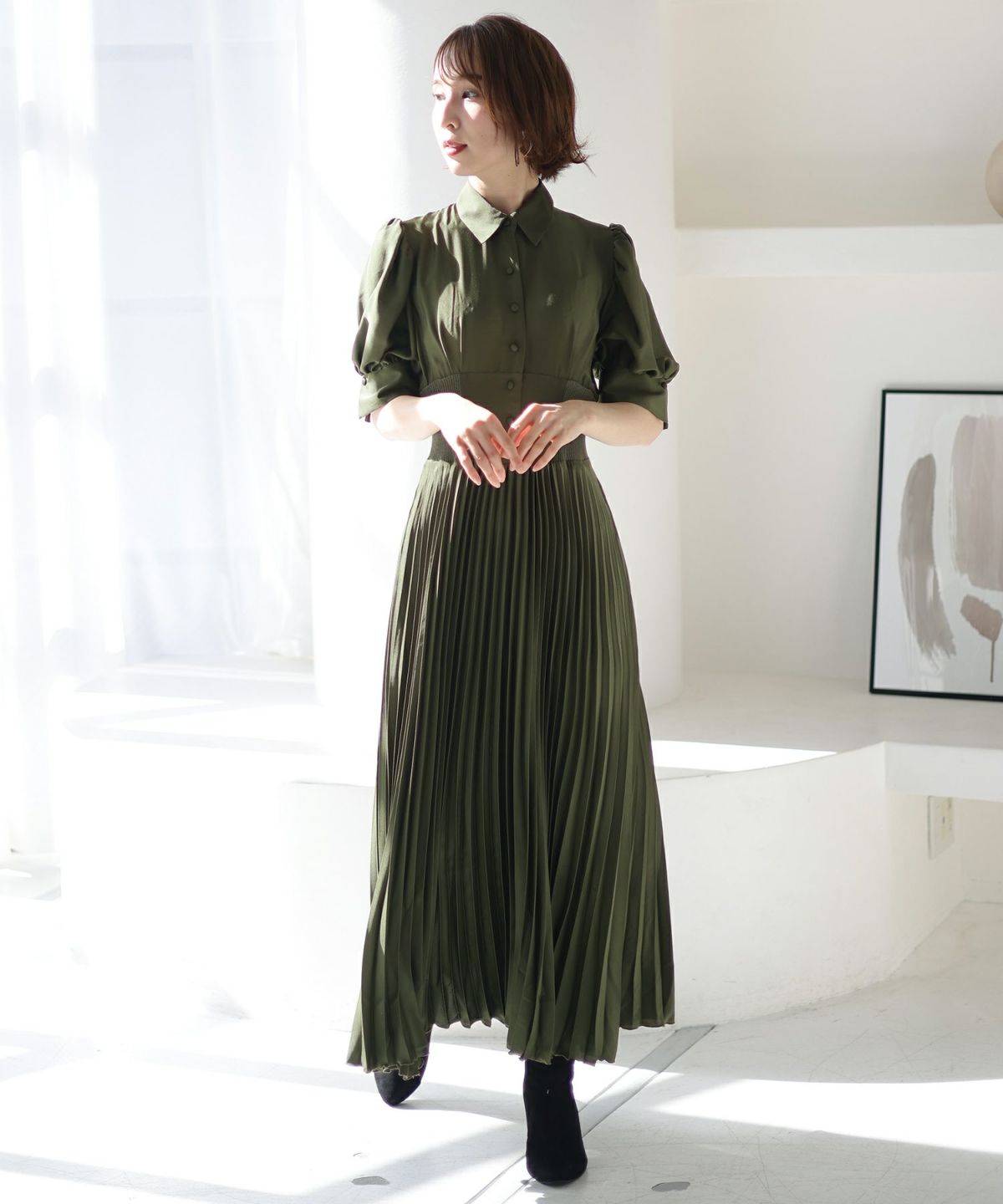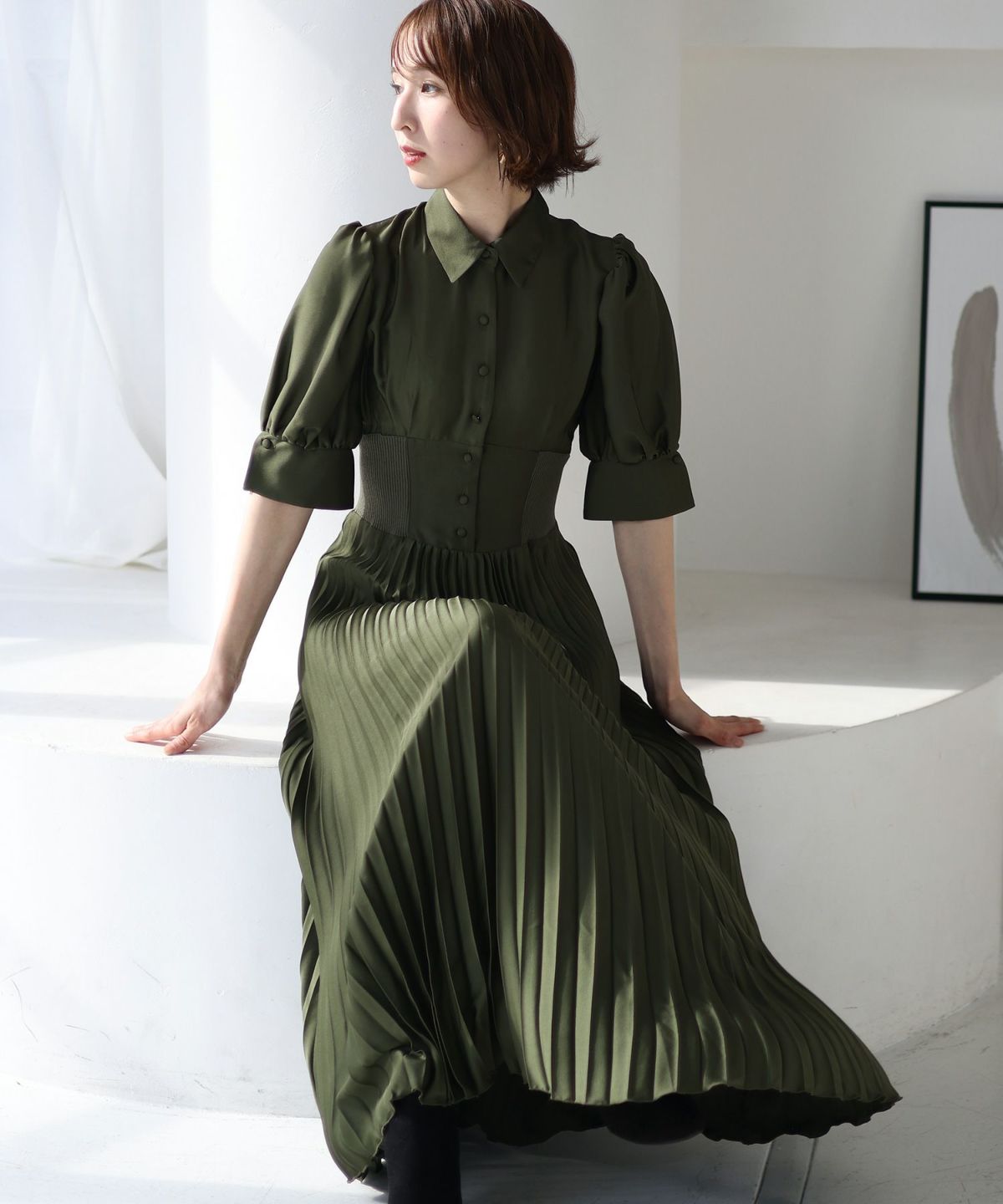 レトロな雰囲気とふわっとしたスリーブが大人可愛い ウエストリブ切替シャツワンピース