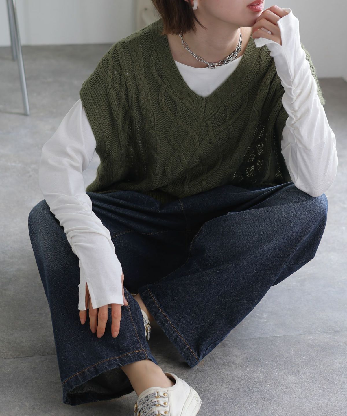 異素材の組み合わせがお洒落なトップス。 ダンボールニット×サテントップス
