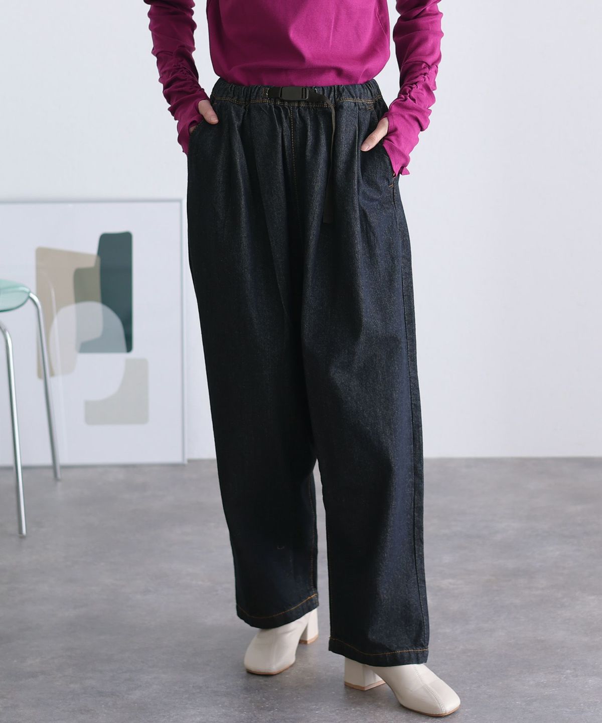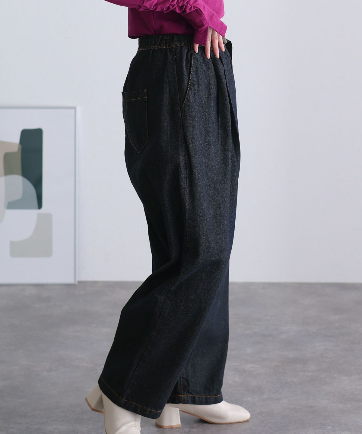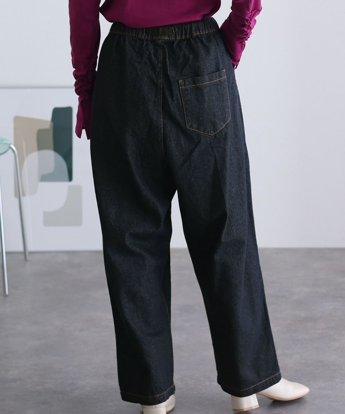 立体ステッチが足を美しく見せる ウエストリブデニムサルエルパンツ