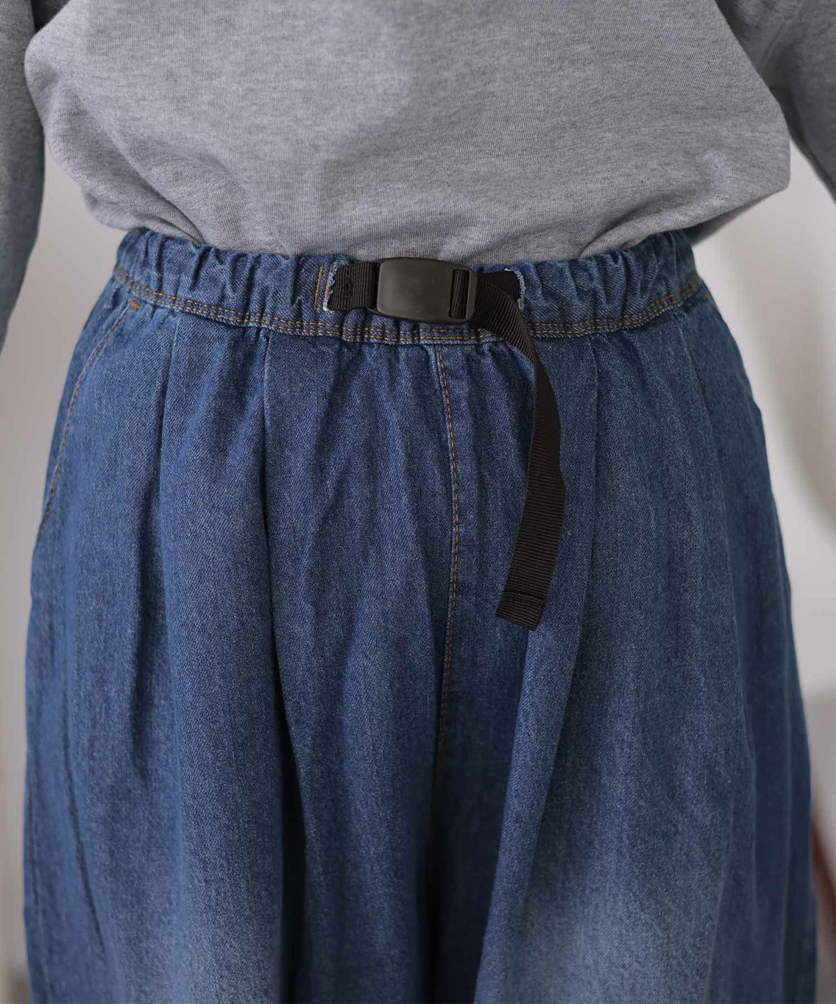 ボリューム感のあるシルエットが可愛い 前バックルバルーンデニムパンツ