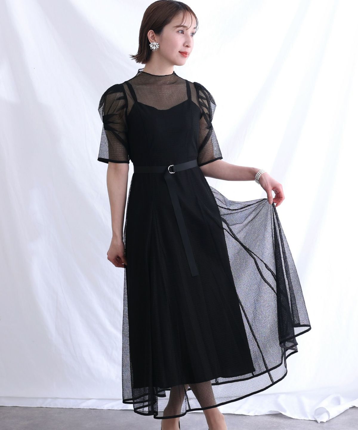 シアーな透け感が今っぽいレースワンピース ベルト付きチュールレースワンピース
