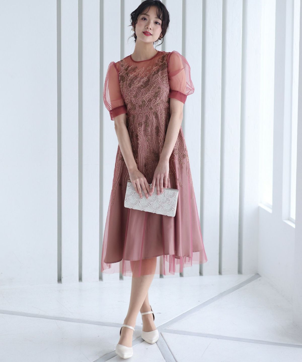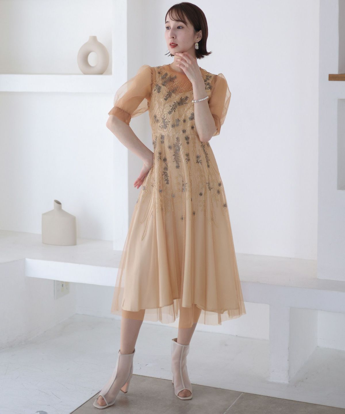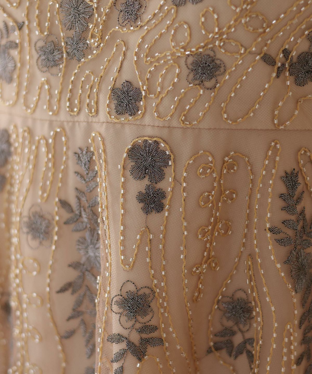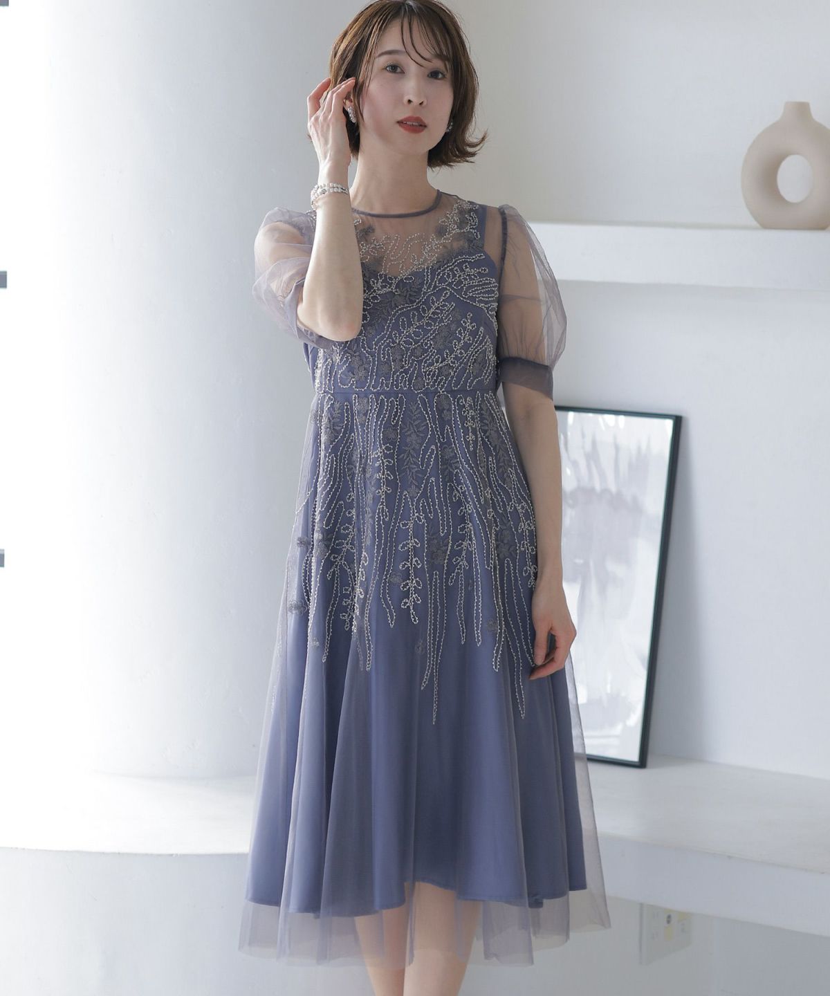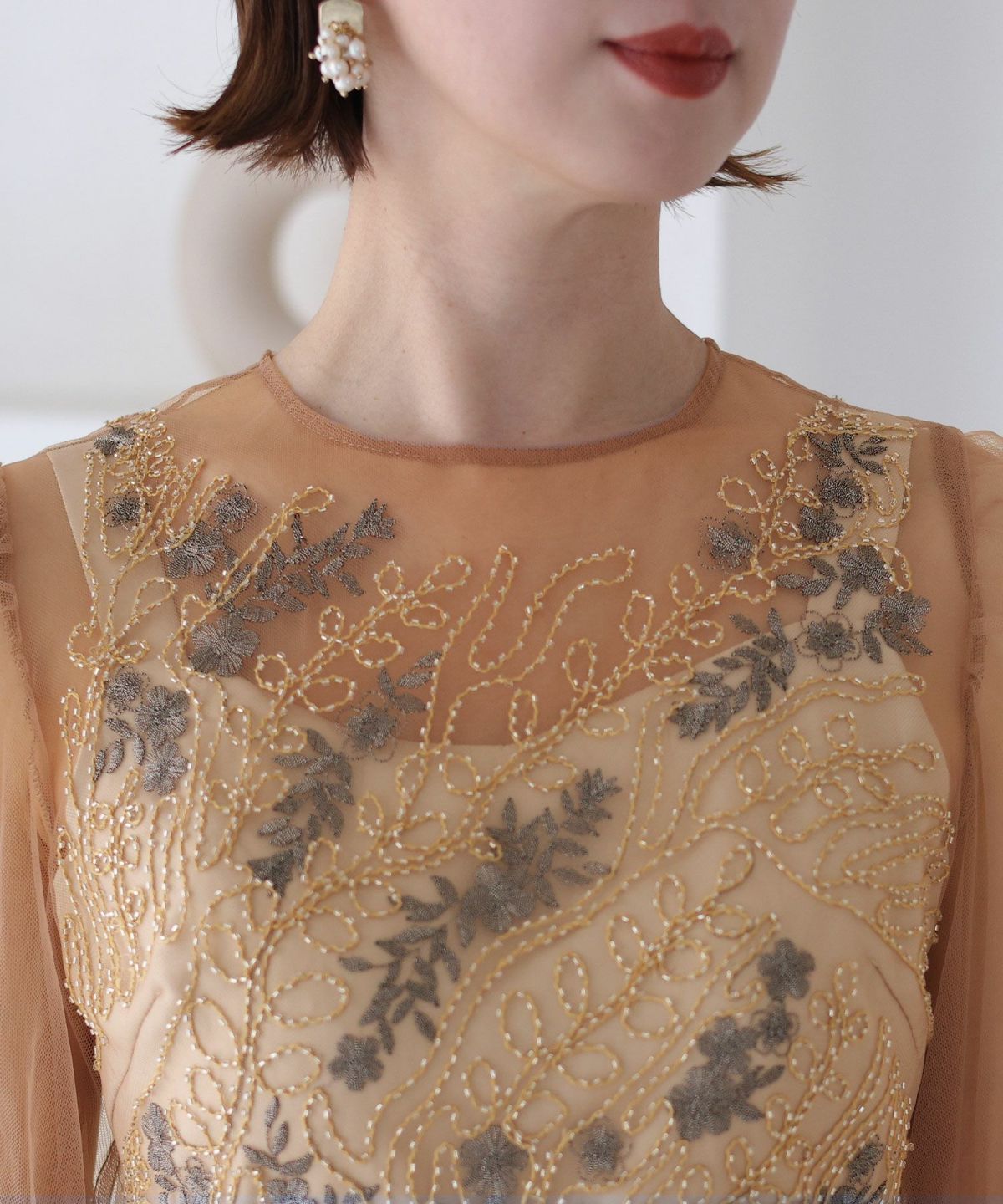 チュールレースが煌びやか ビーズ刺繍ワンピース