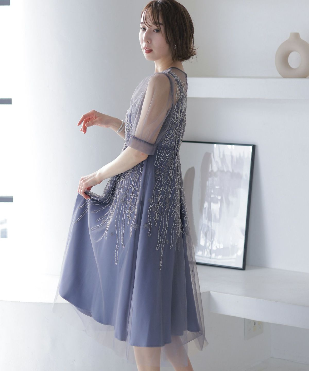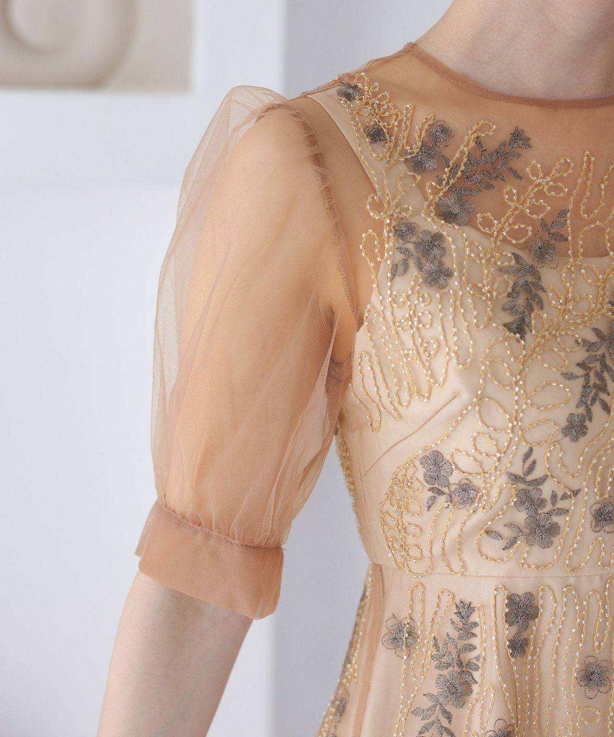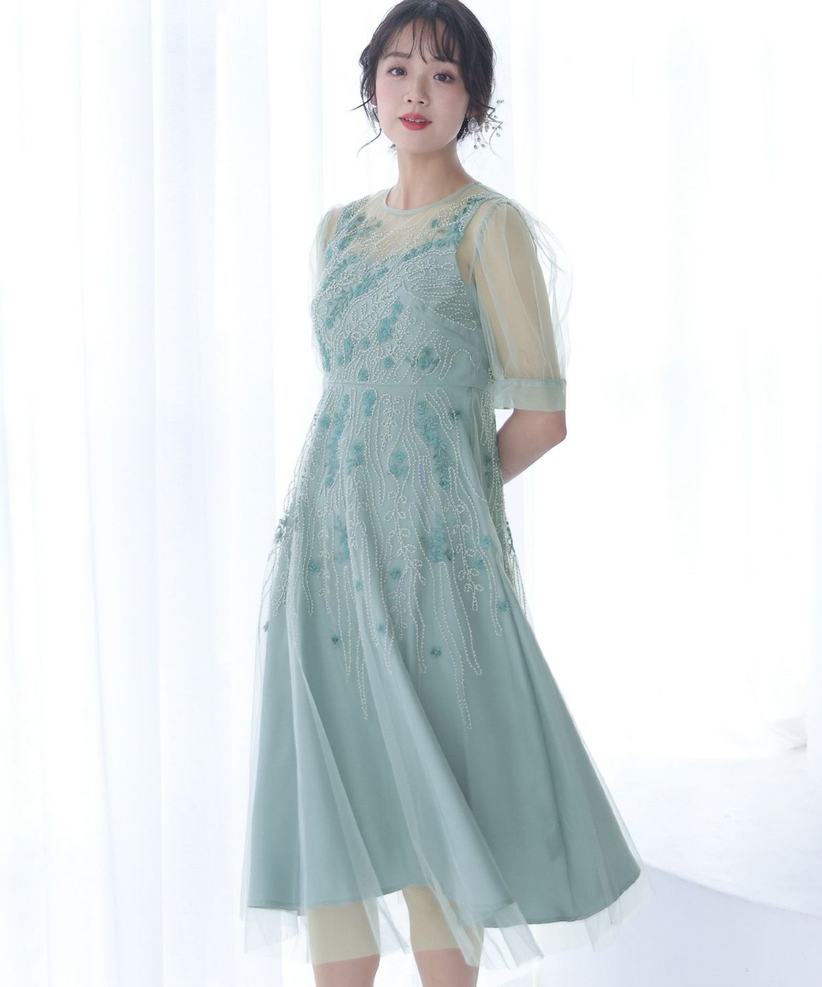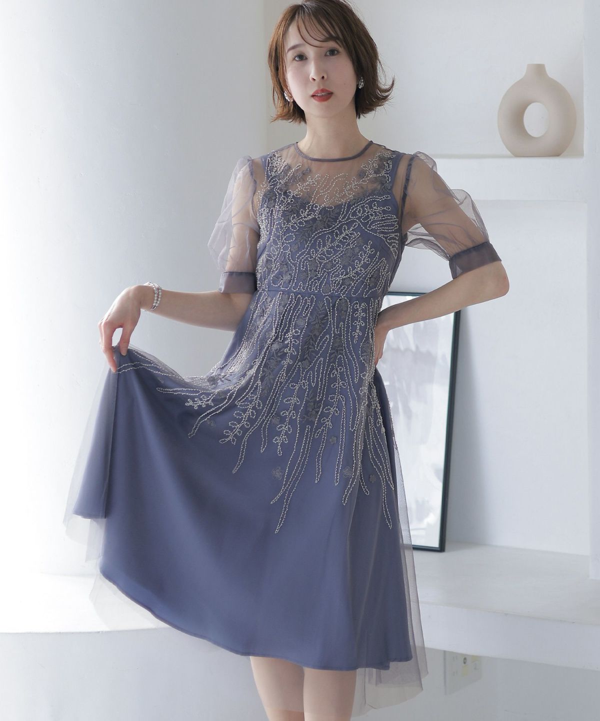 チュールレースが煌びやか ビーズ刺繍ワンピース