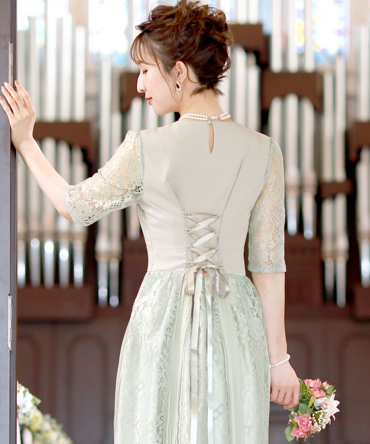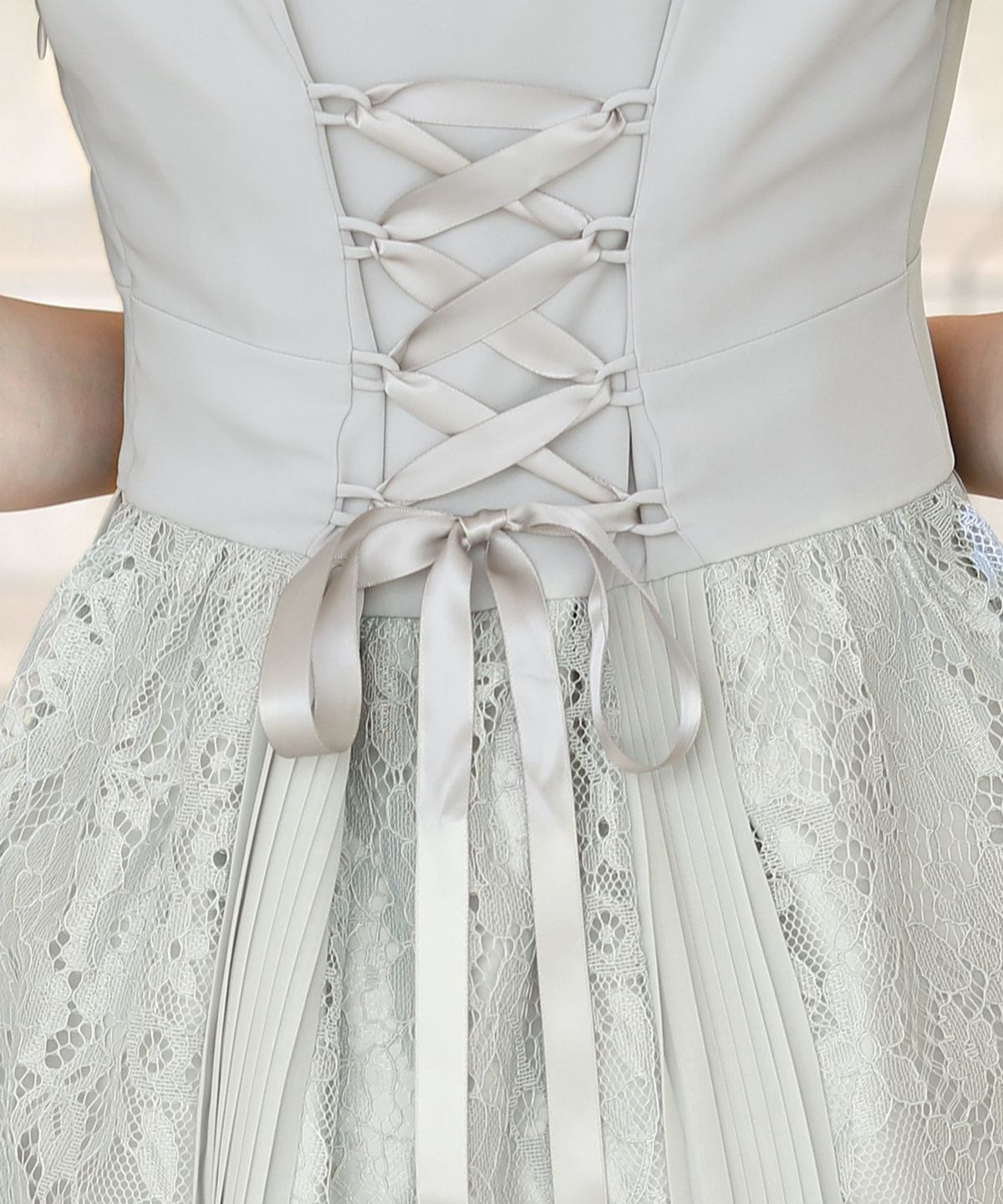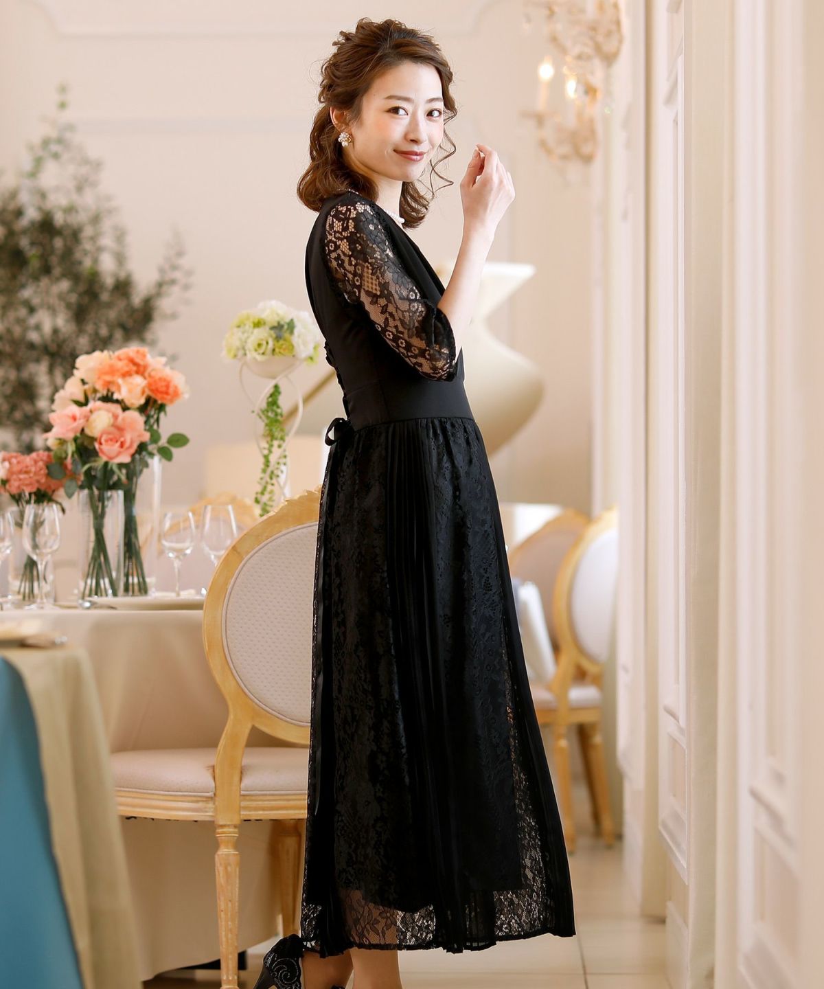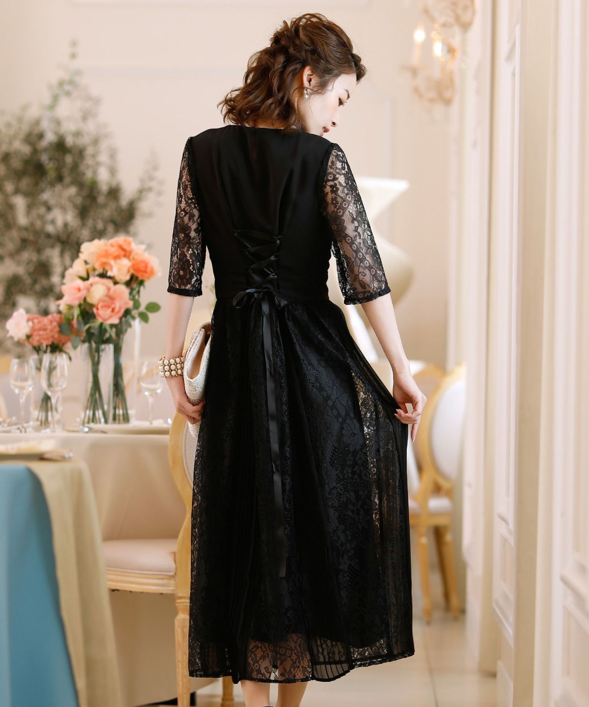 スピンドルだからバックショットも綺麗♪ レース&プリーツスピンドルドレス