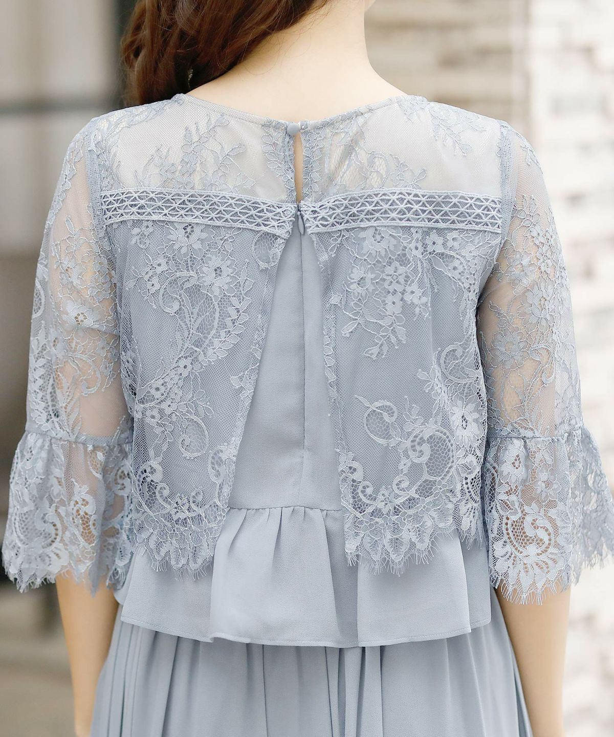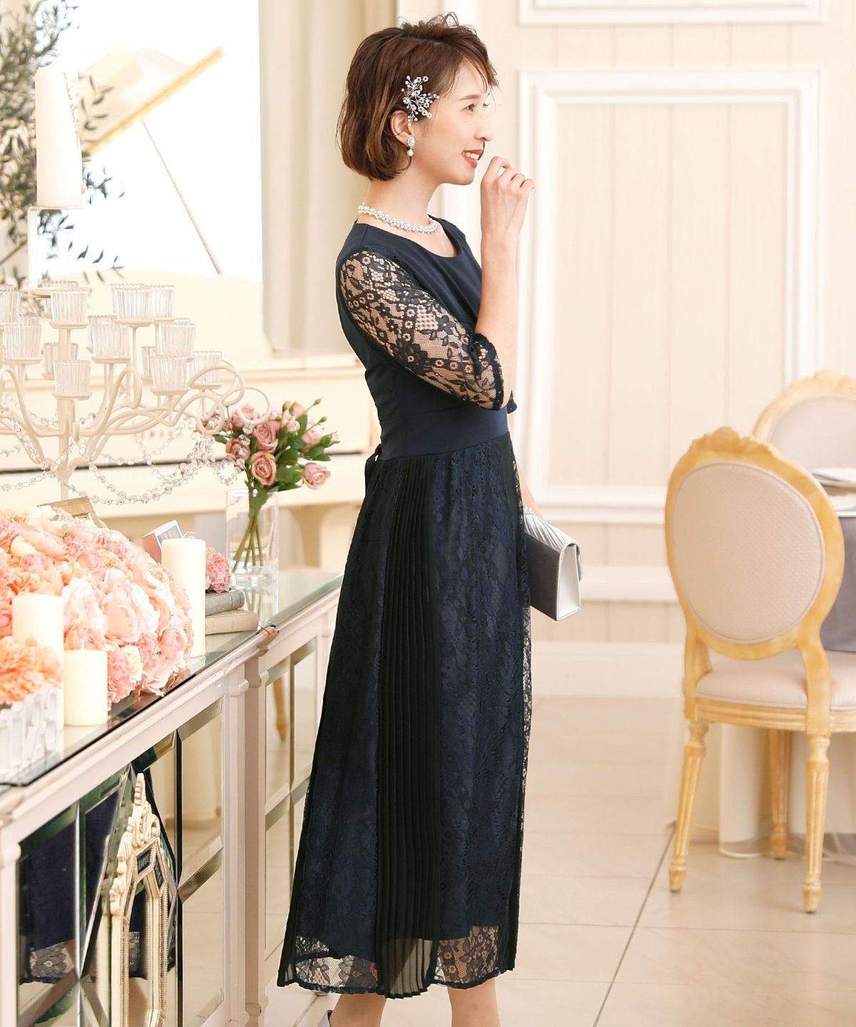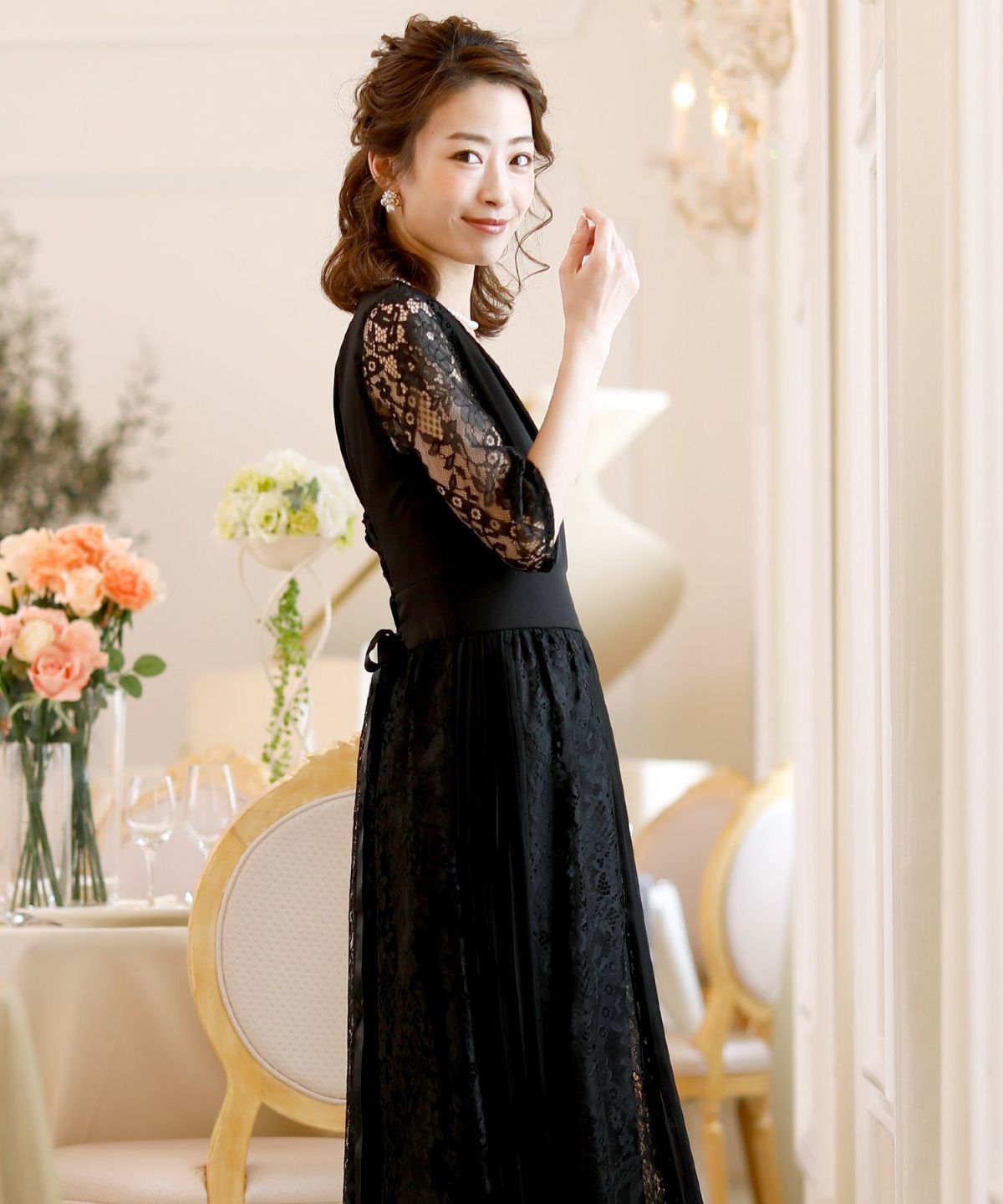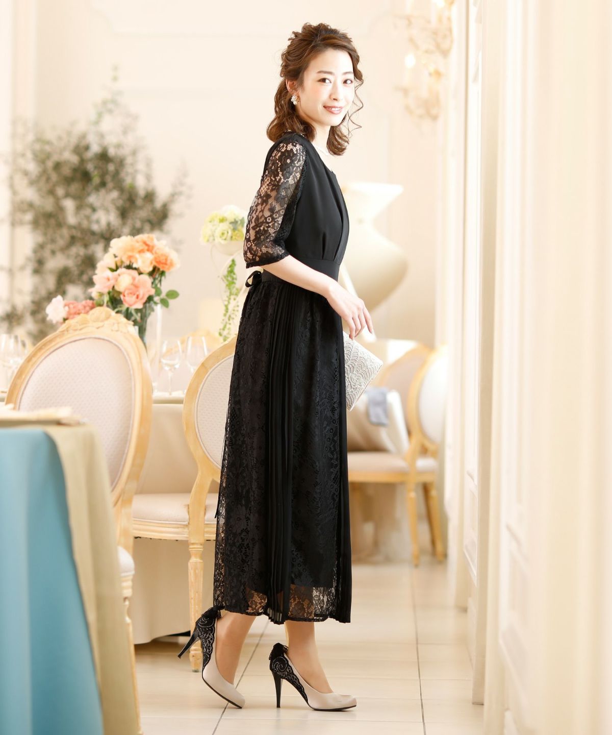 スピンドルだからバックショットも綺麗♪ レース&プリーツスピンドルドレス