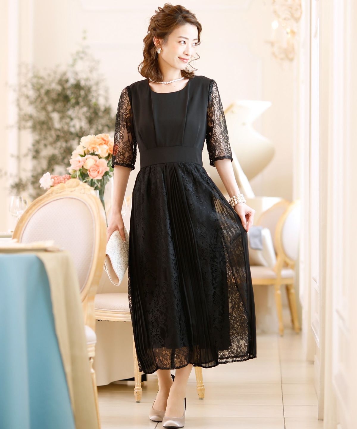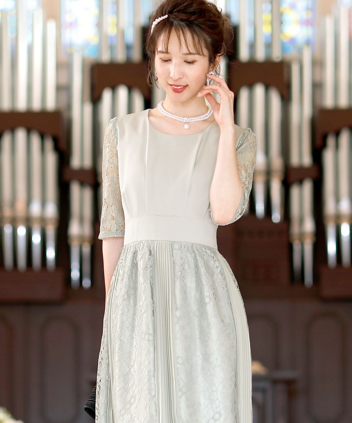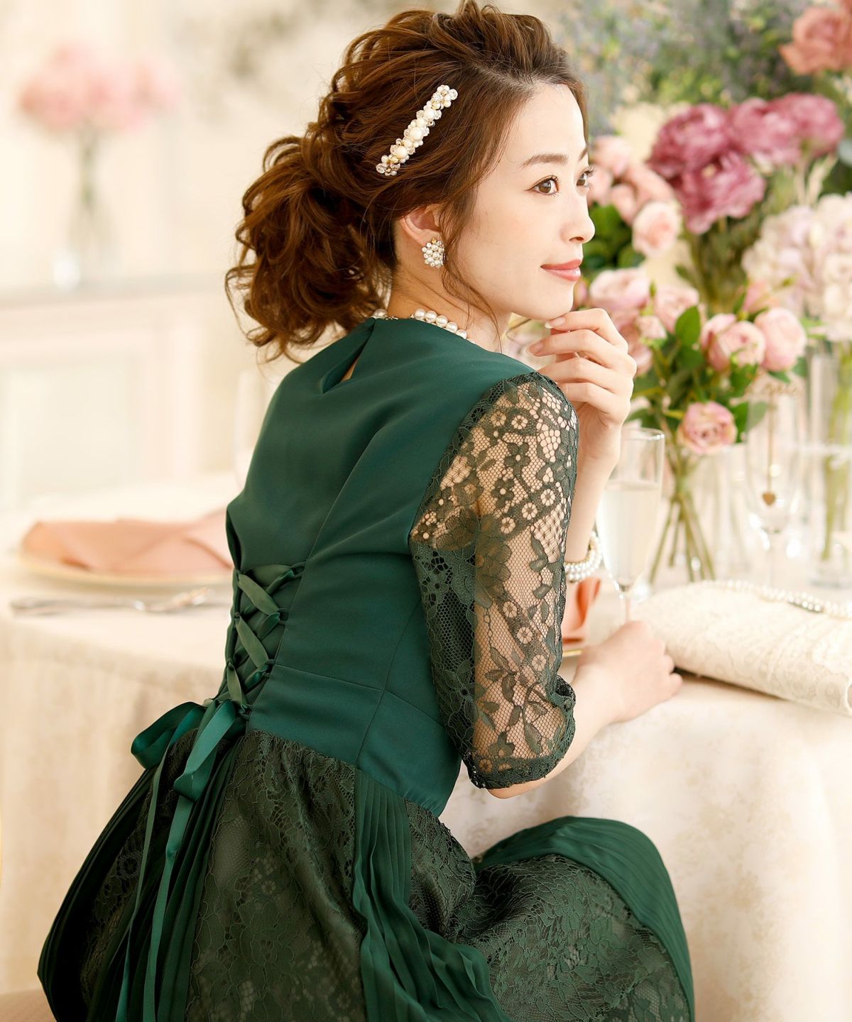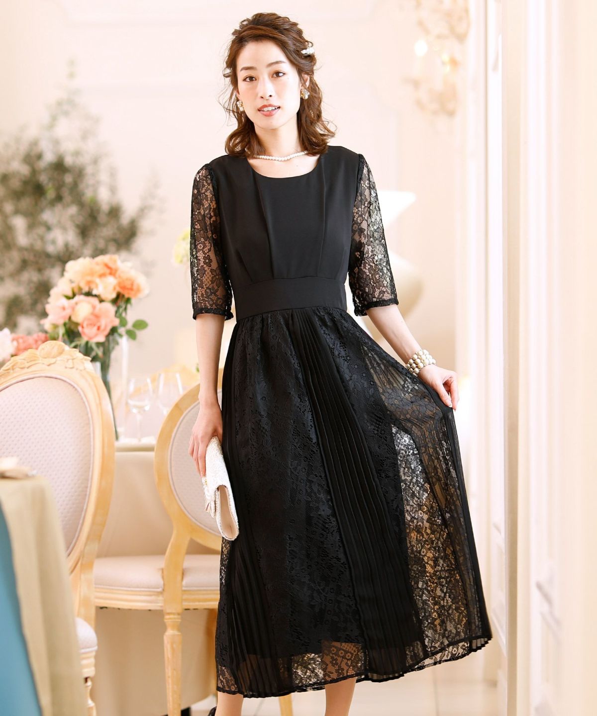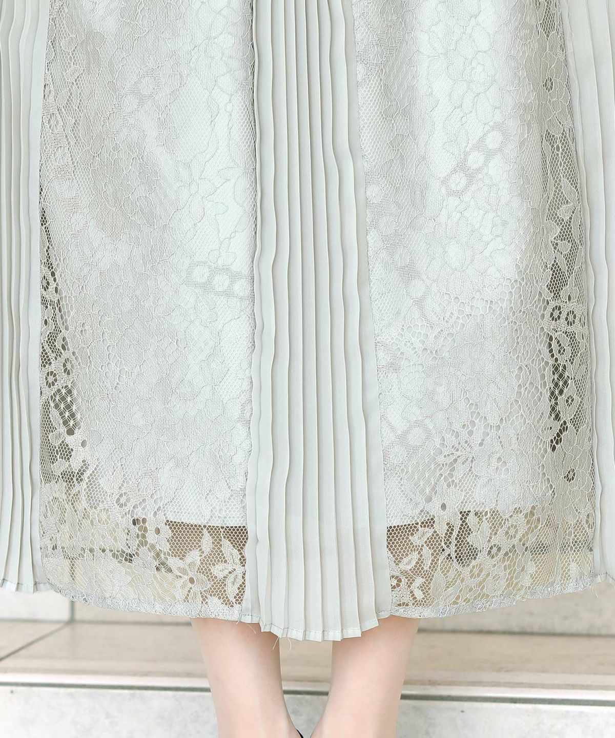 スピンドルだからバックショットも綺麗♪ レース&プリーツスピンドルドレス