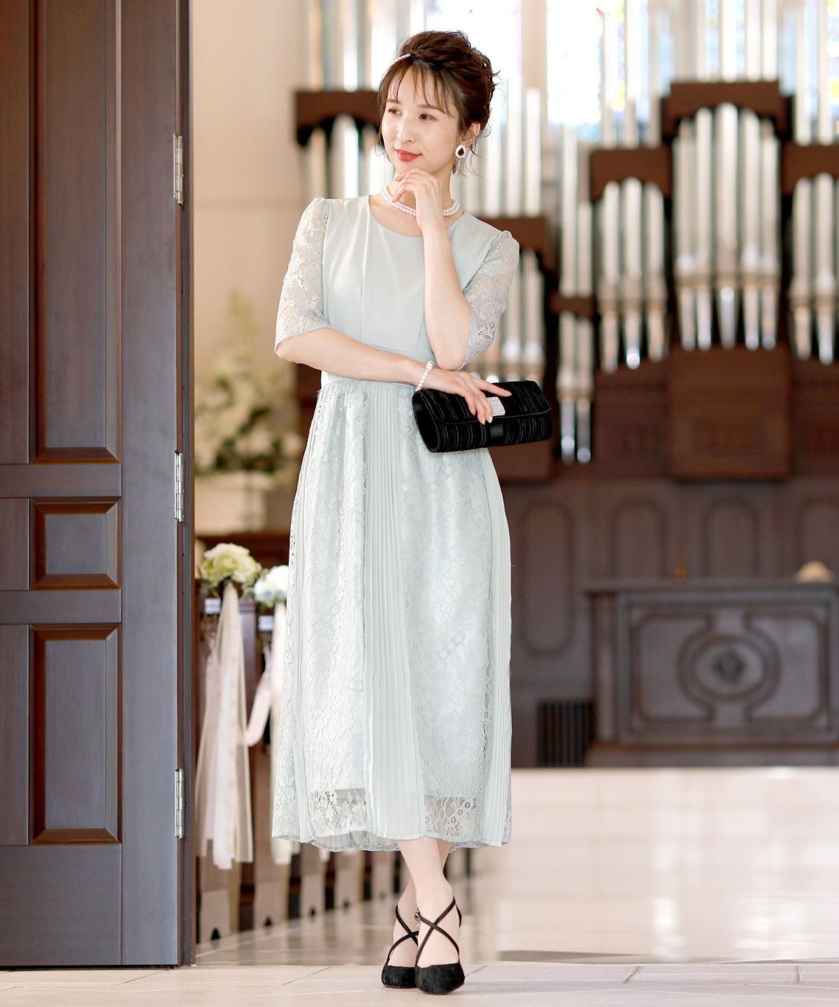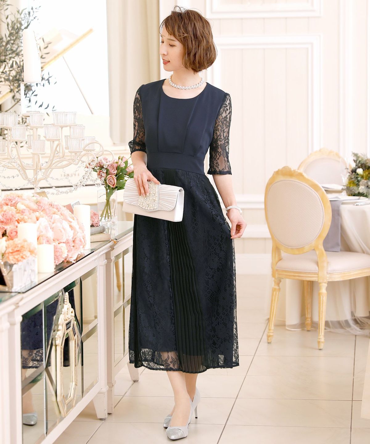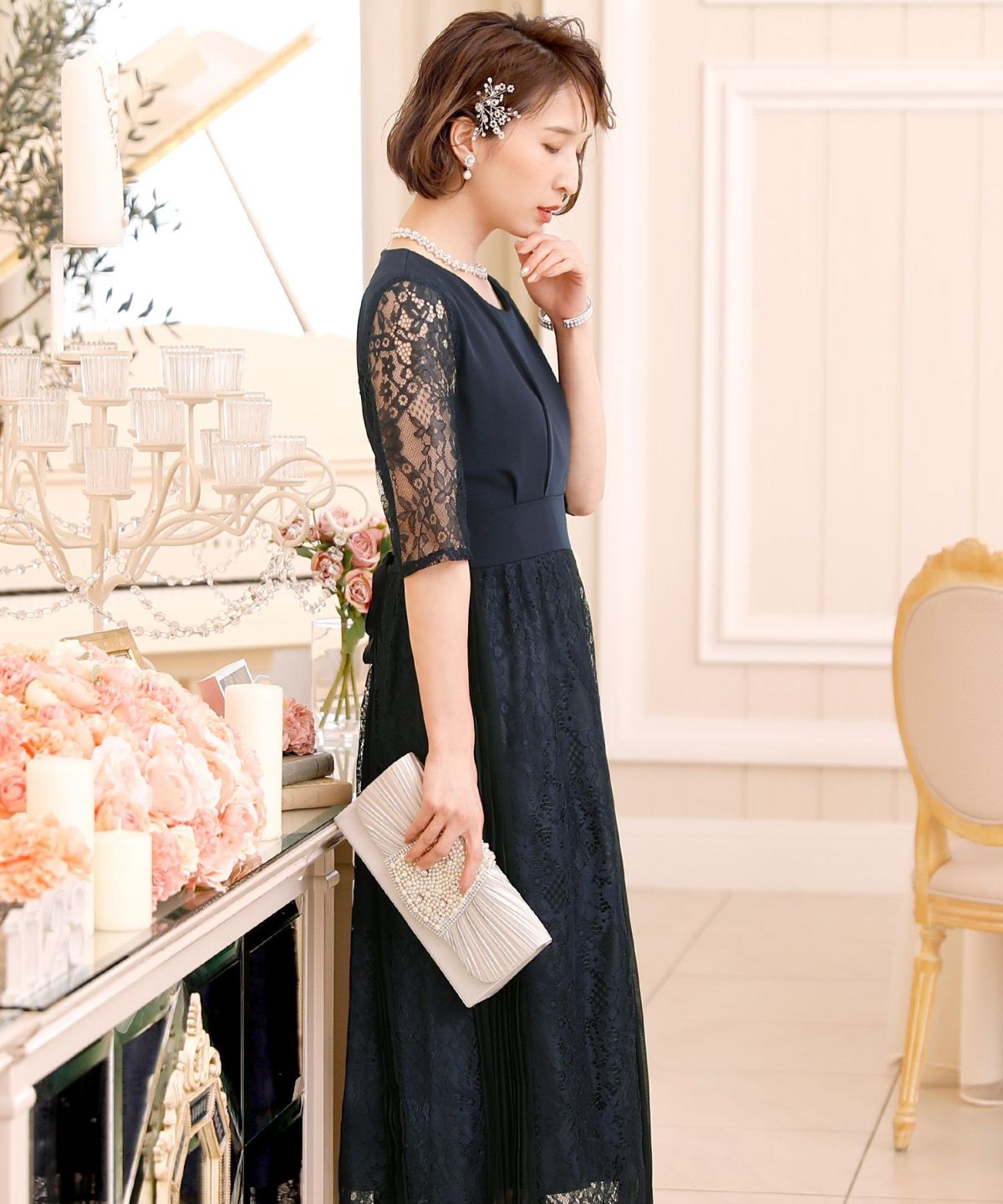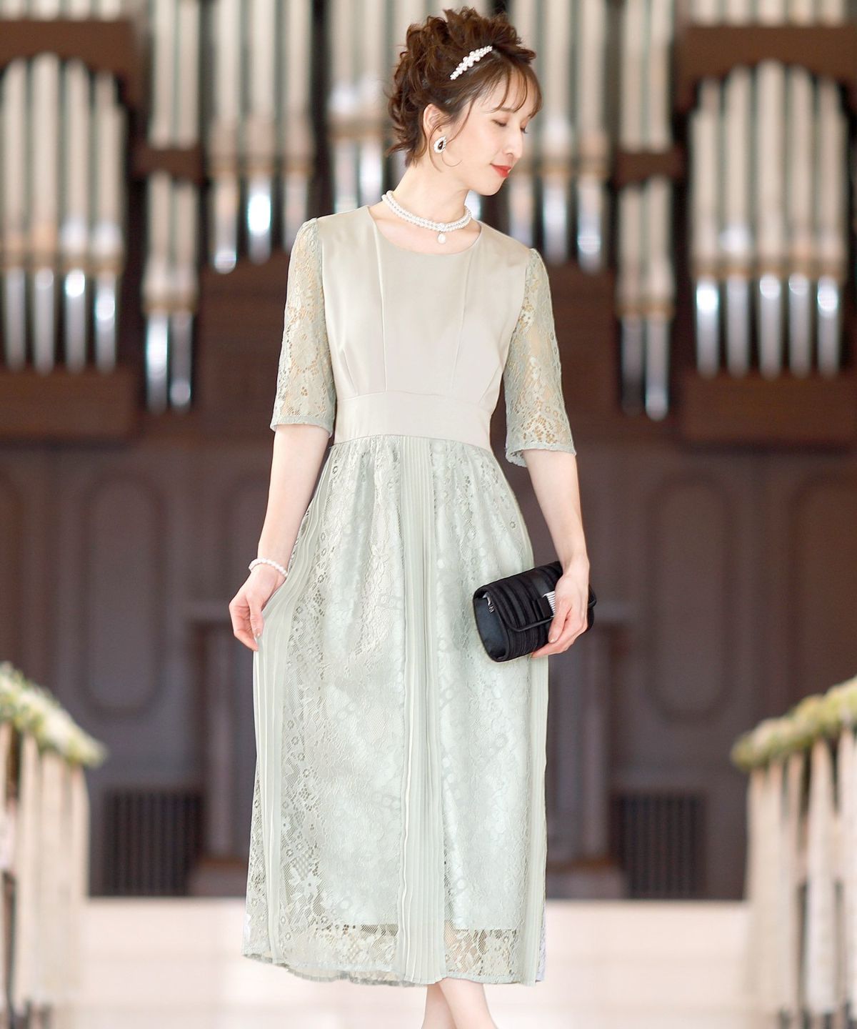 スピンドルだからバックショットも綺麗♪ レース&プリーツスピンドルドレス