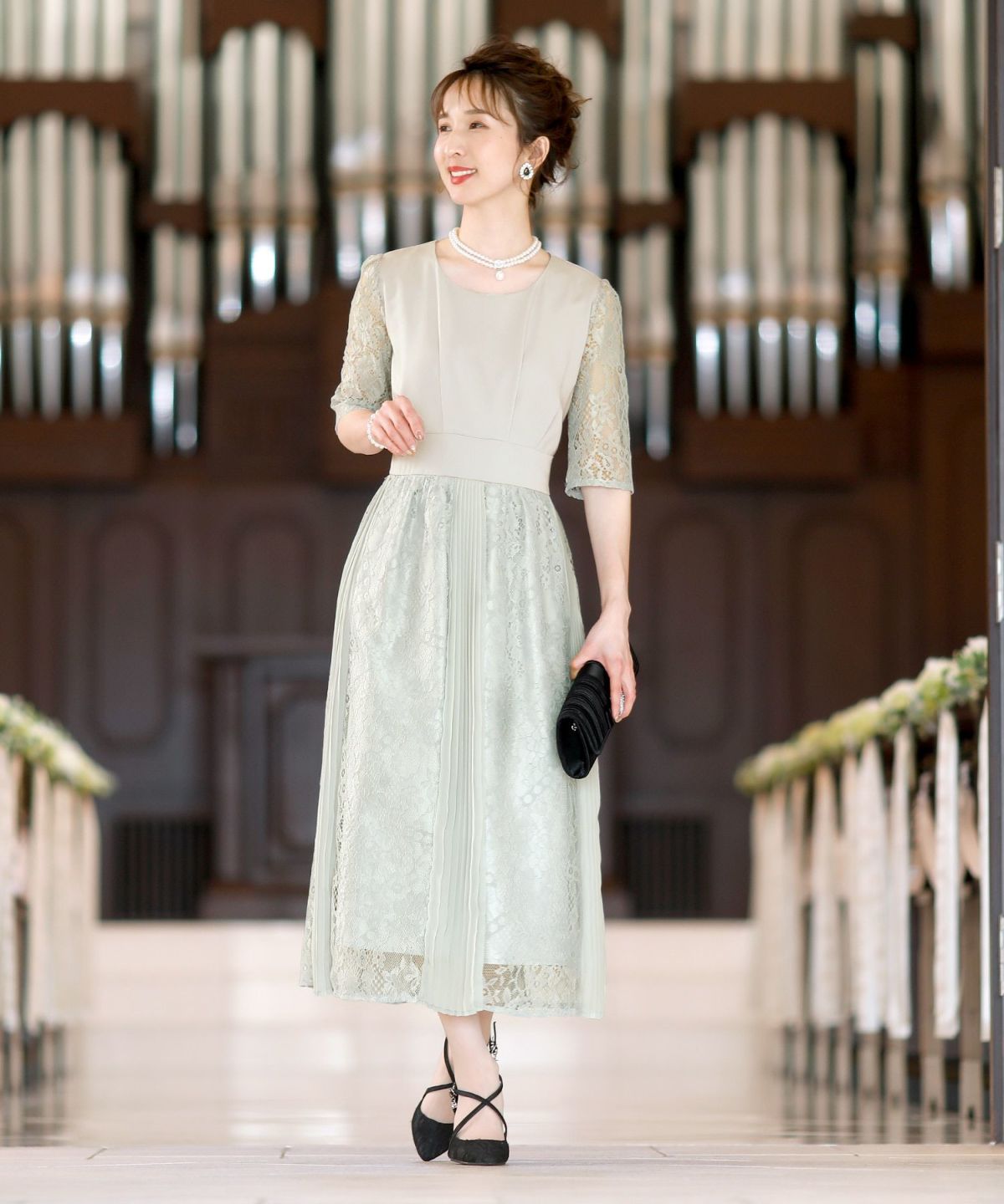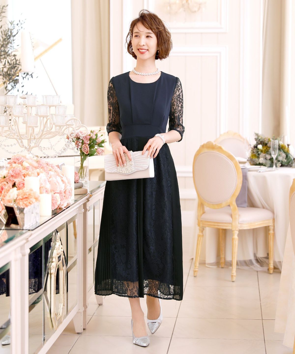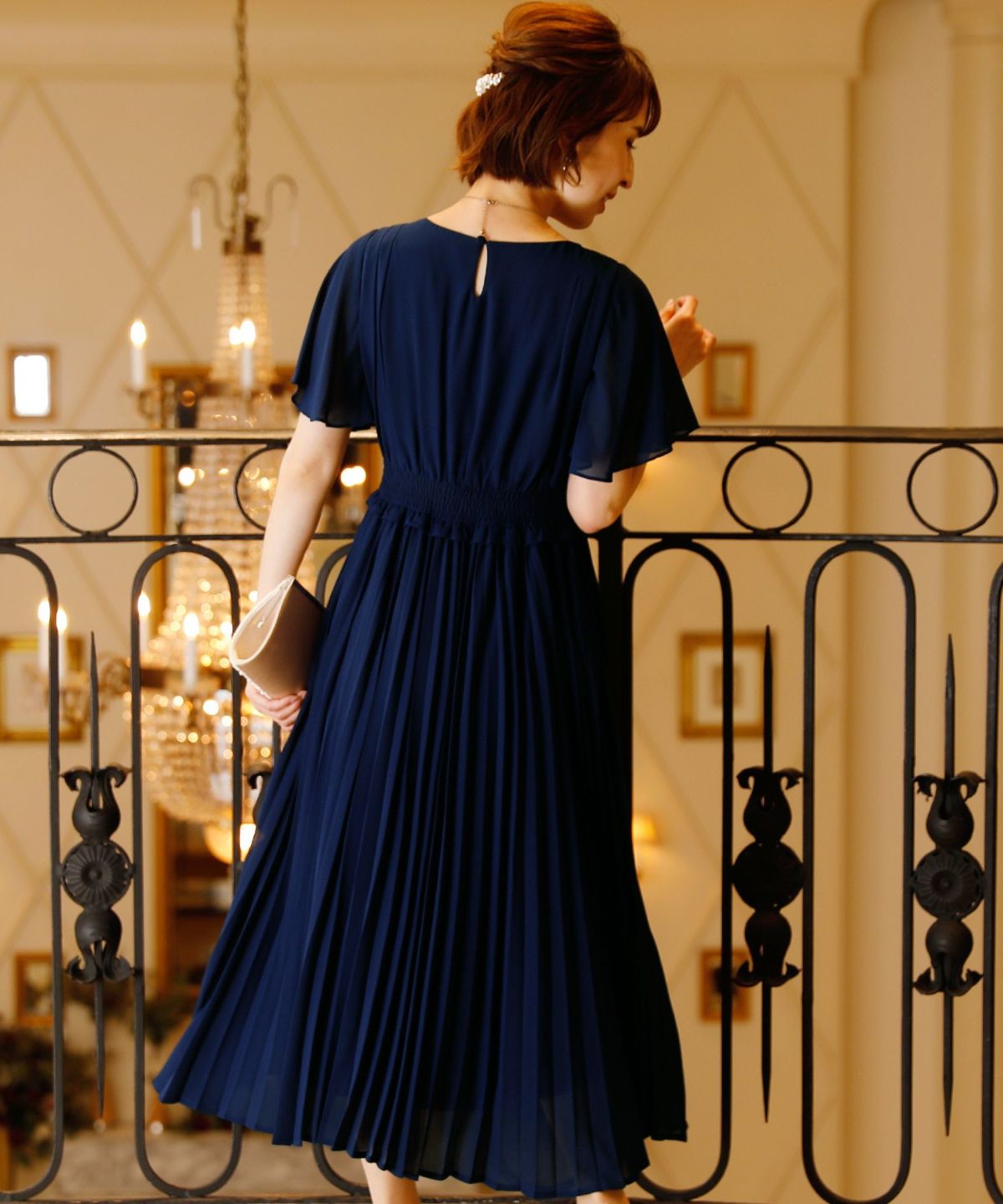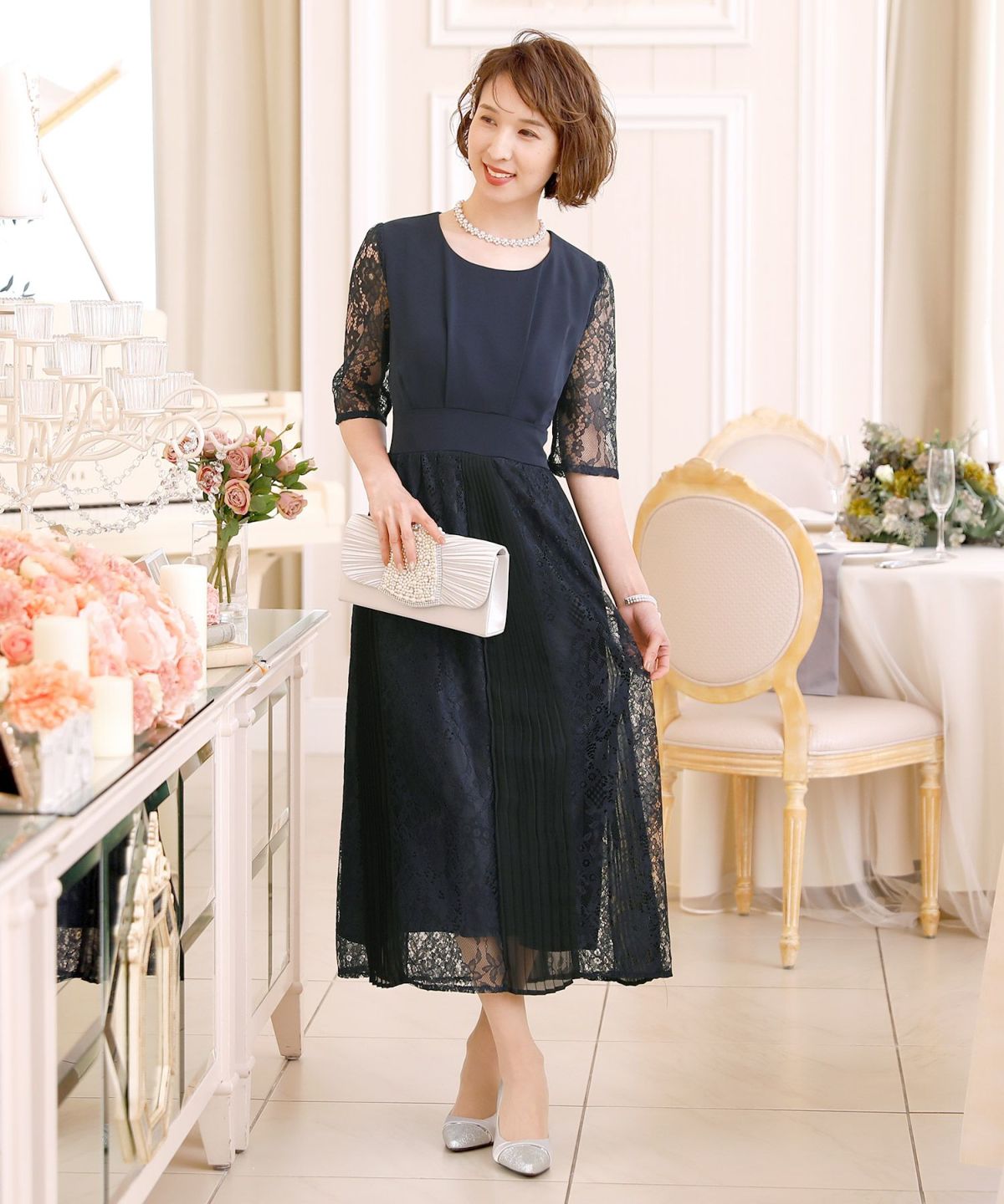 スピンドルだからバックショットも綺麗♪ レース&プリーツスピンドルドレス