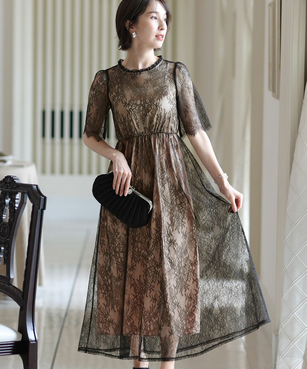 花柄の配色レースで豪華に仕上げたワンピースドレス。特別感漂うフェミニンなデザインはパーティーや結婚式などのオケージョンシーンで活躍♪
