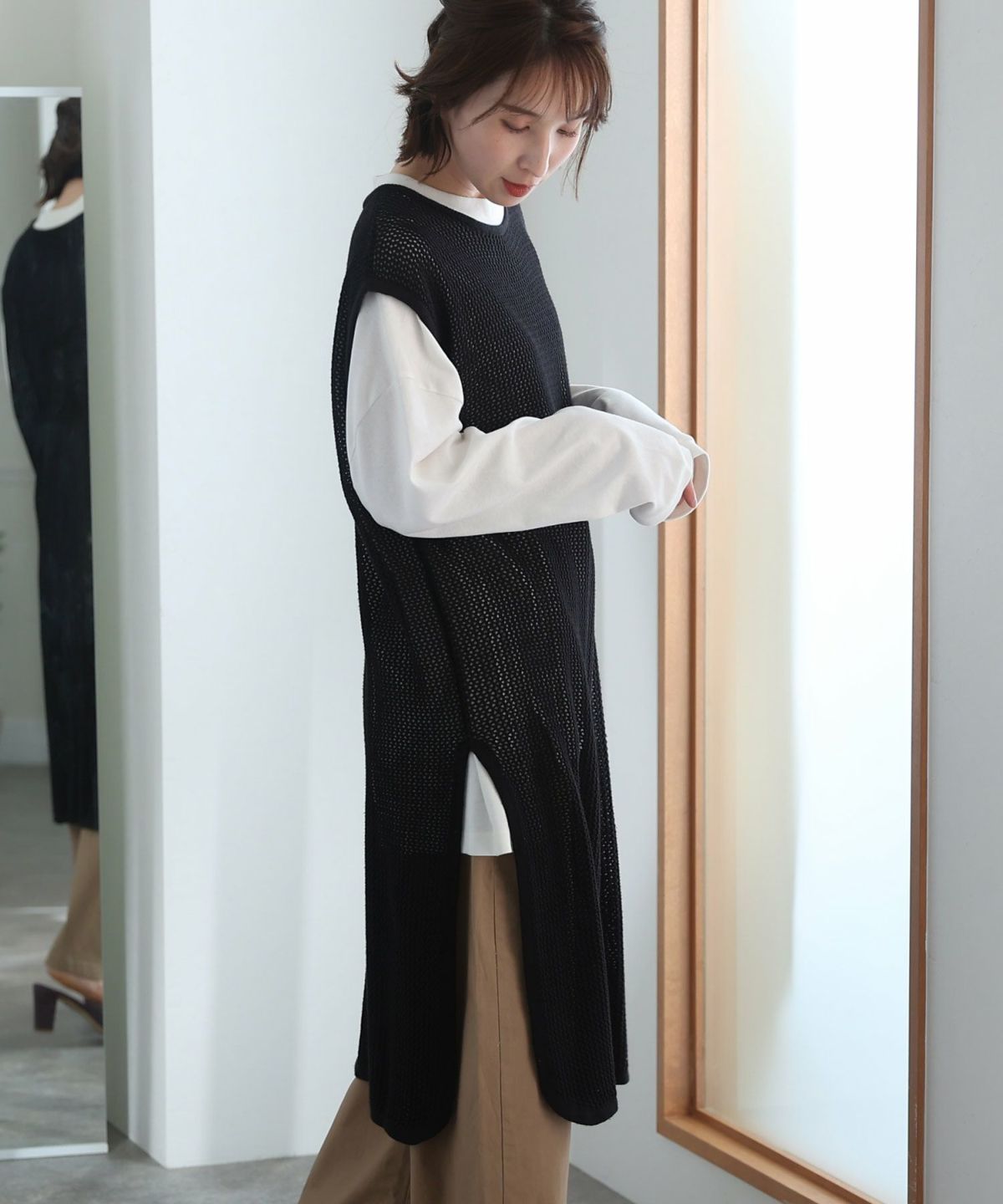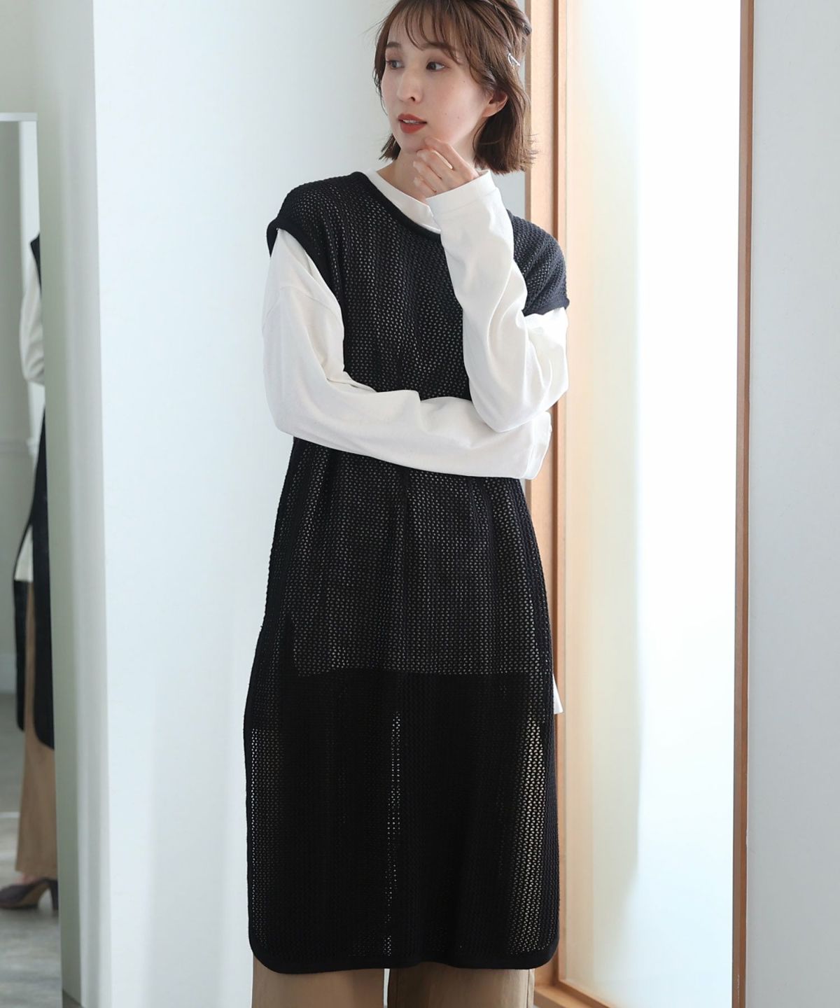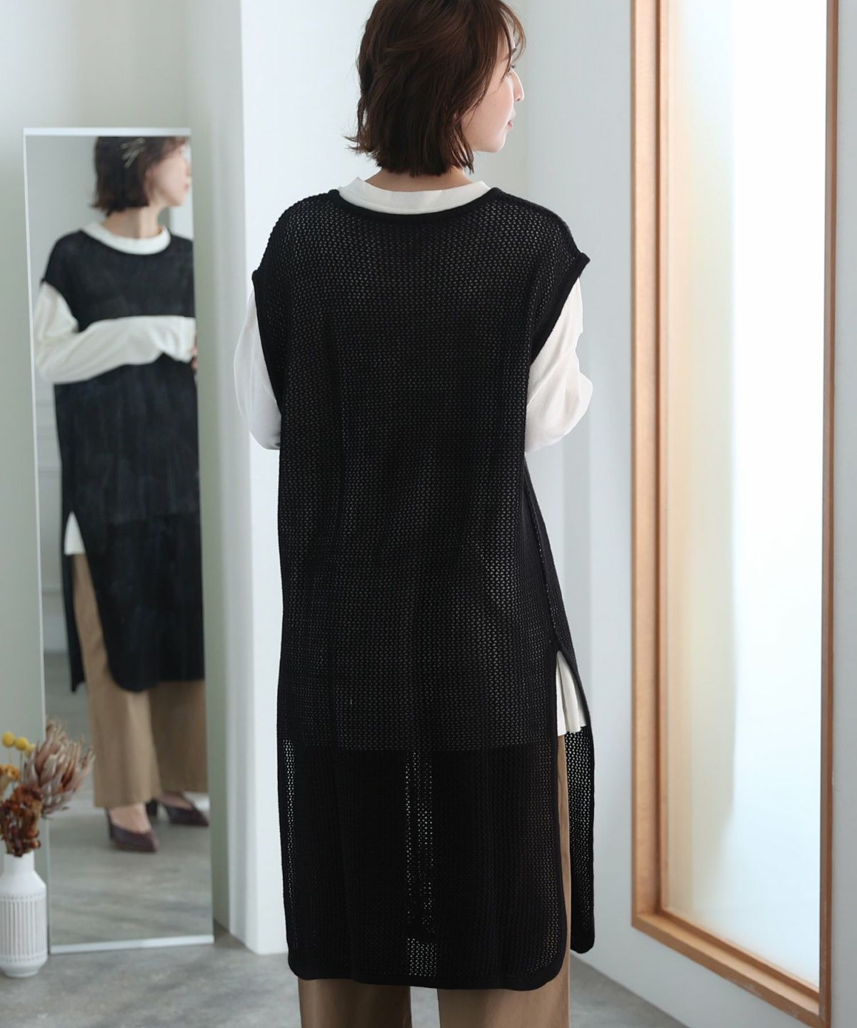 透け感が可愛いメッシュニットロングベスト