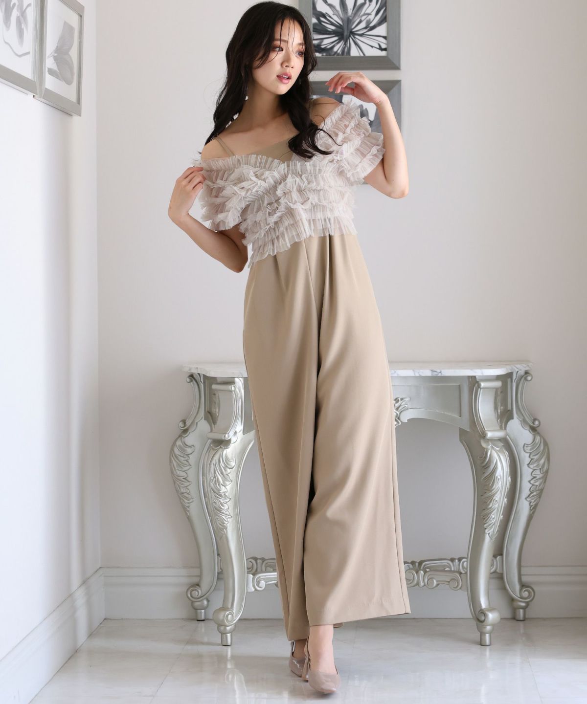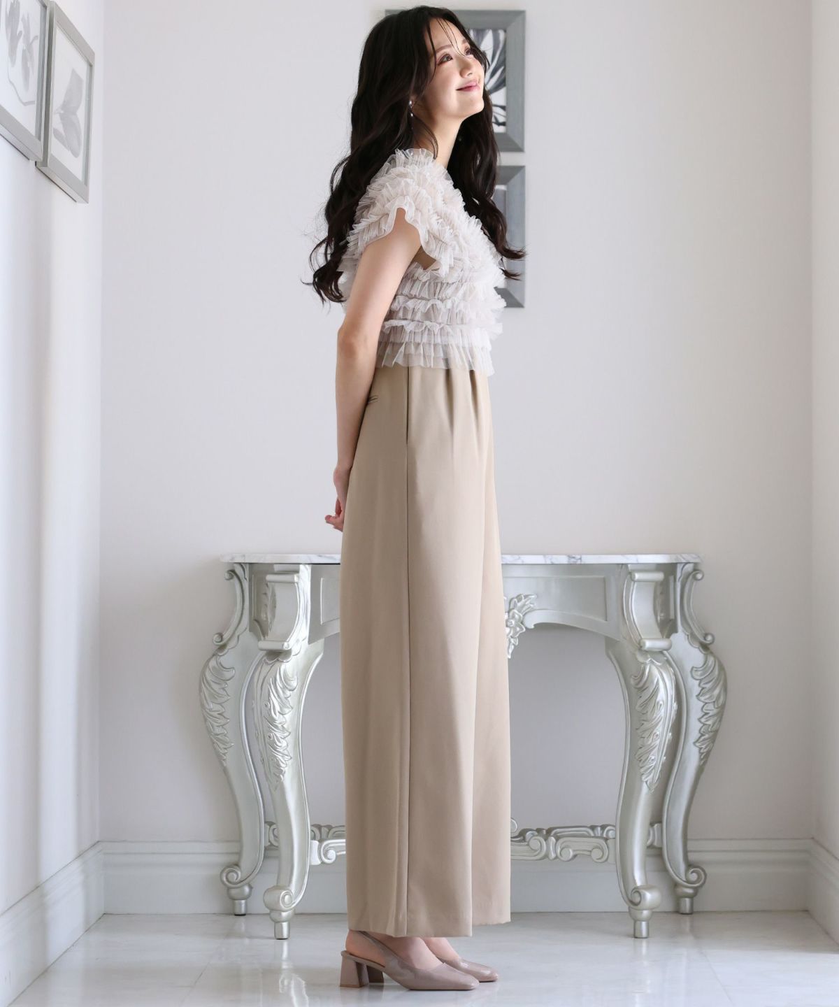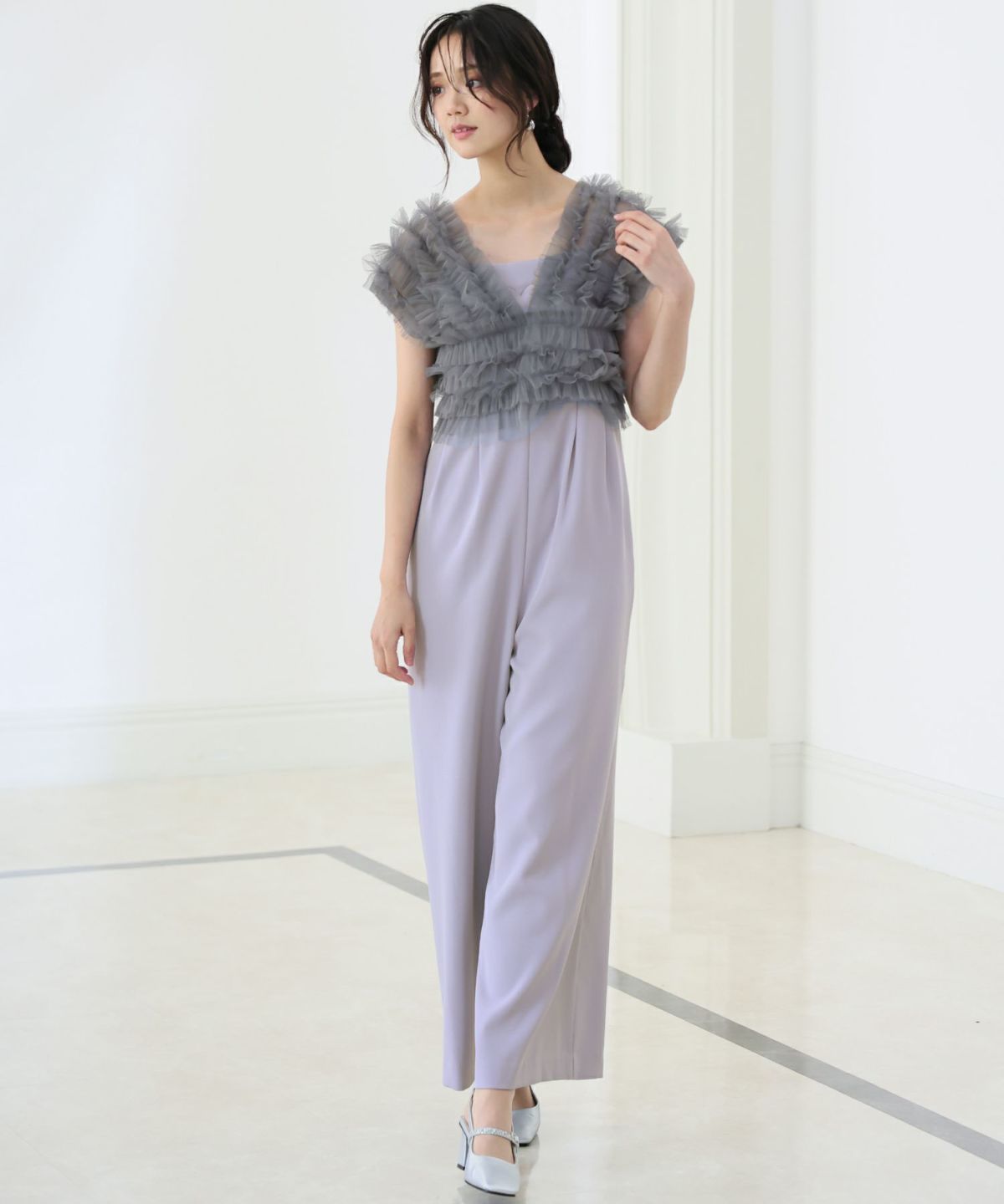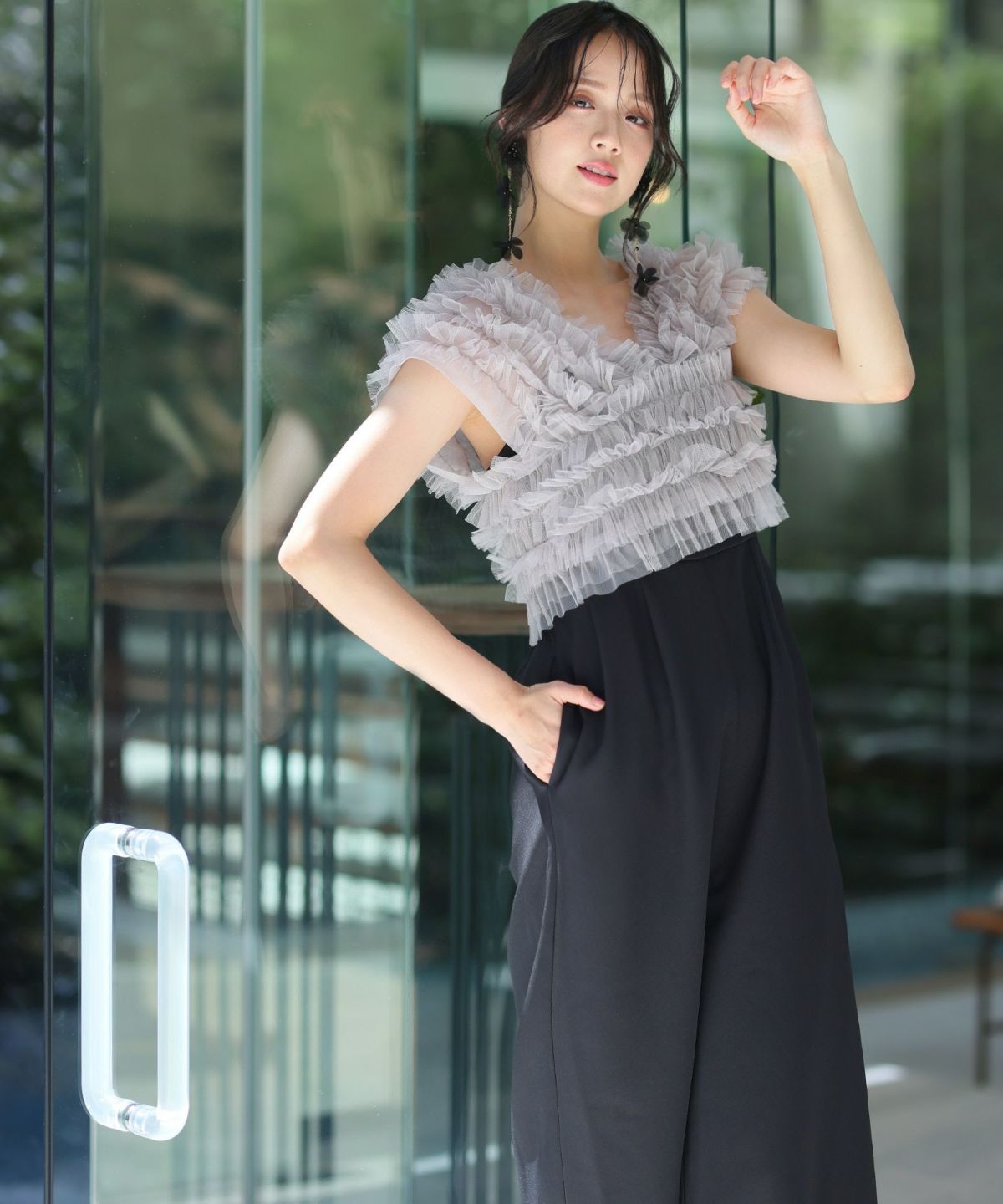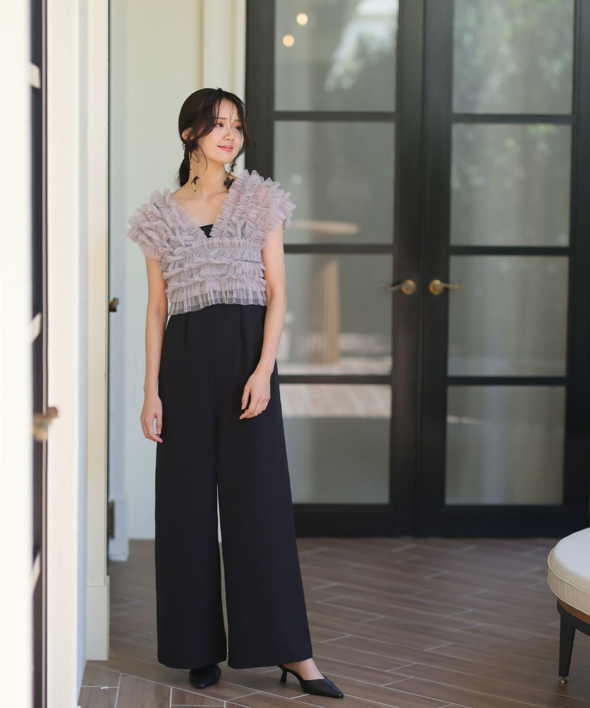 多彩な着こなしが楽しめるチュールトップスとパンツのセットドレス。