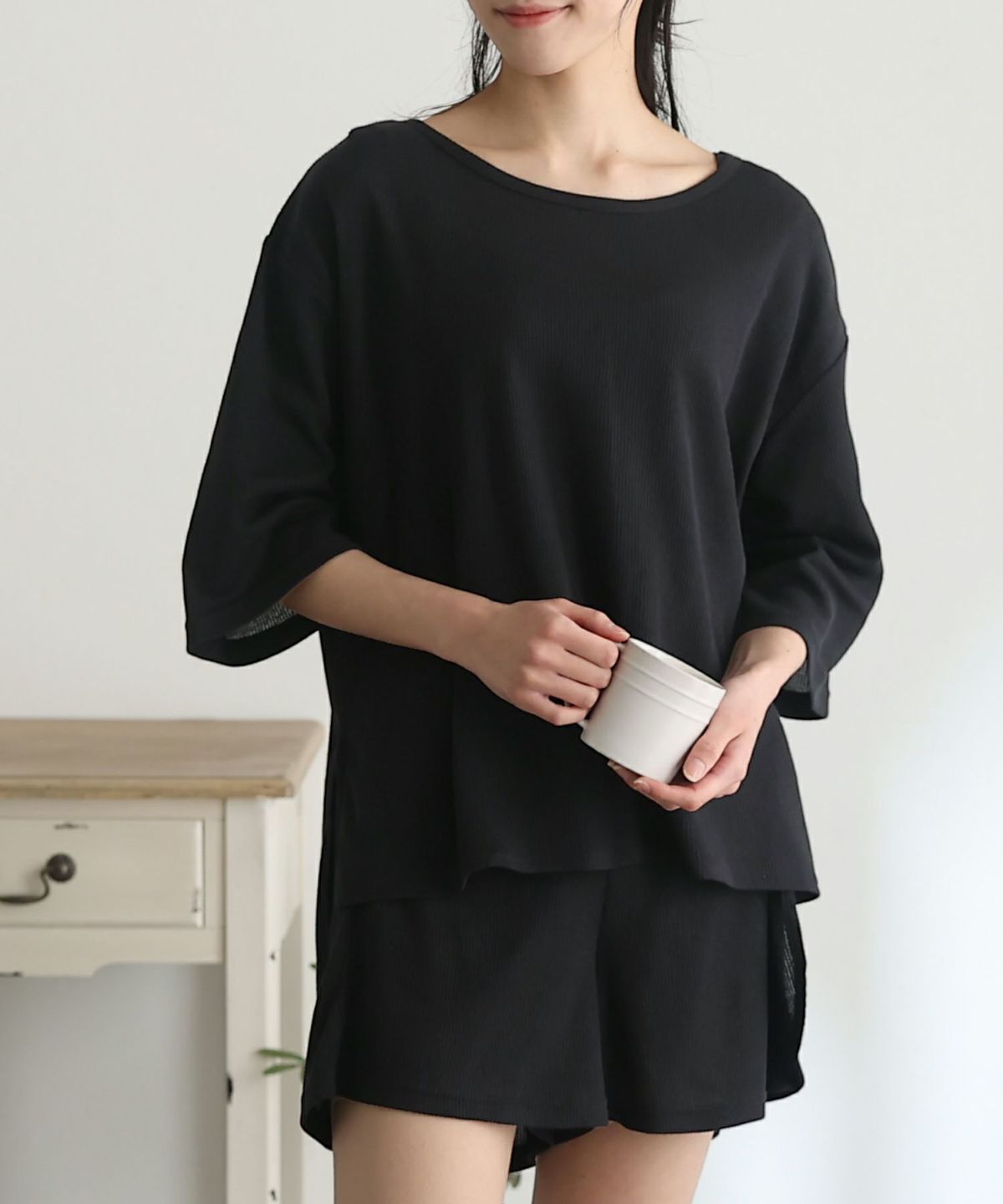 リラックススタイルのワッフルショートパンツセットアップ