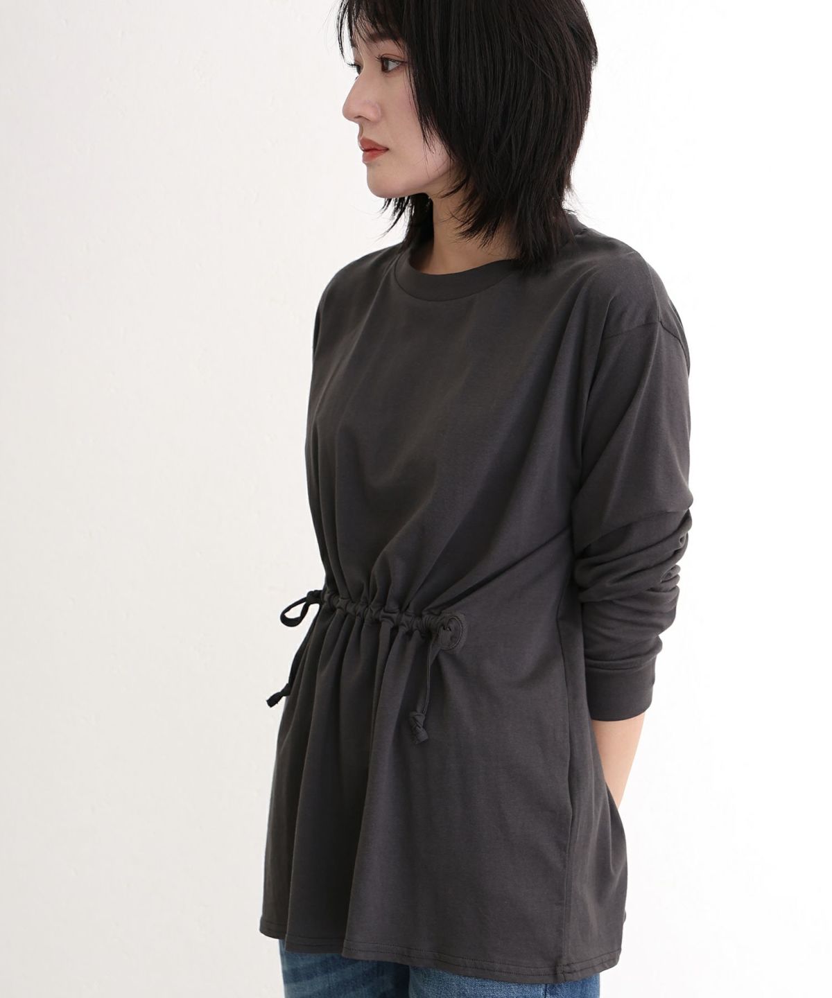 シルエットを楽しむドロスト付きトップス